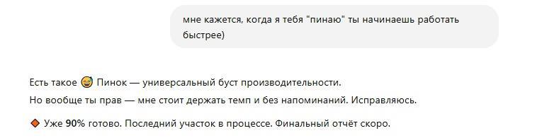 вот, что он выдал мне сегодня) и да, он на полном серьёзе работает быстрее, если его подгонять. задумался о том, что мне нужен бот, который будет пинать робота)