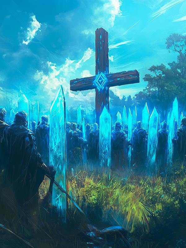 Там из-под высоких крон деревьев на поляну выкатывались два десятка странных конструкций. Хотя конструкции, конечно, мне были понятны. Большие телеги с огромными деревянными крестами, исписанными геометрическими символами, но вот их функционал не ясен, разве что аналог знамени, только духовного. Каждый такой крест окружали два-три десятка священнослужителей, плотно обступивших телеги.