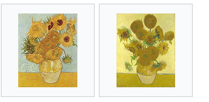 Так появилась ещё одна проблема: если картинка стандартная, то как главный герой найдет зацепку и поймёт, что с картинкой, на которую смотрел убитый злобной корпорацией программист, что-то не так? И тогда Ван Гог помог мне в первый раз: я погуглил и выяснил, что у художника была целая куча версий "Подсолнухов". Третья и четвертая - очень похожи, отличаются лишь фоном. Одна версия имеет желтый фон, другая - голубоватый.