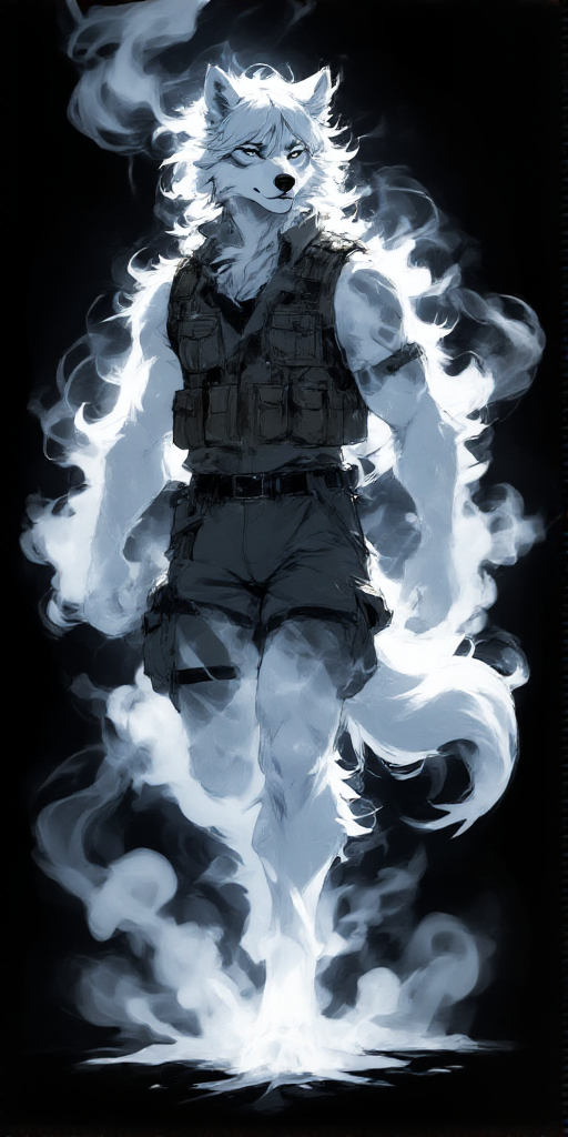 Это тестировалась возможность изобразить ауру, как она выглядит в animalm, на примере овосновца (такой спецотряд в сеттинге). Там аура не светится, а выглядит как некие цветные всполохи, у овосновцев она искусственная и серая. Получилось не совсем то но прикольно.