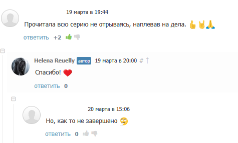 Автор: Helena ReuellyЯ заметила, что наши люди не слишком щедры на комментарии (про негатив скромно умолчу). Но бывает же такое, когда комментарии радуют и мотивируют писать дальше!
