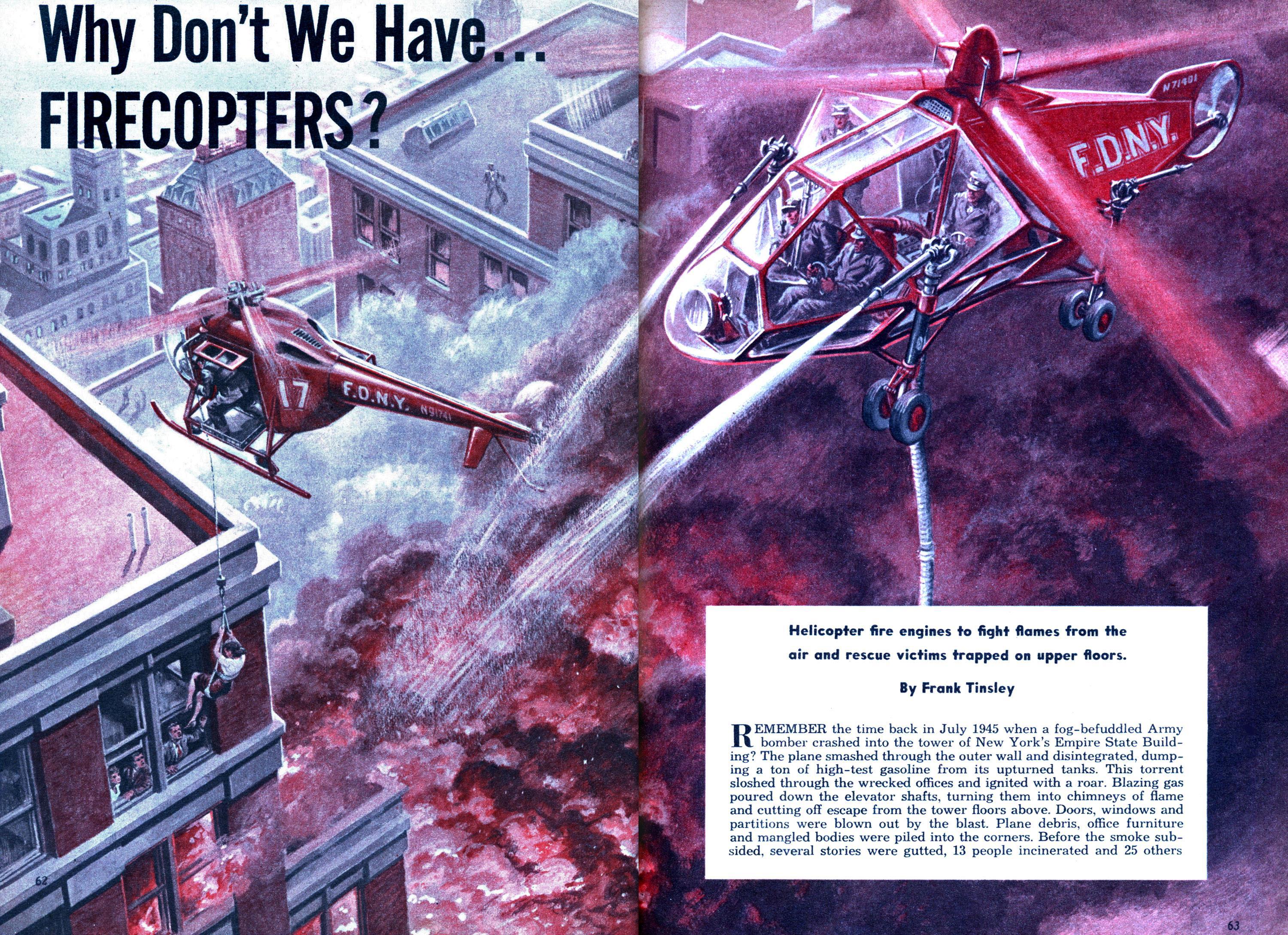Так в 50-х предполагалась борьба с пожарами в высотных зданиях с вертолетов. Одно неясно - вертолеты легкие, а баков для воды у них не видно