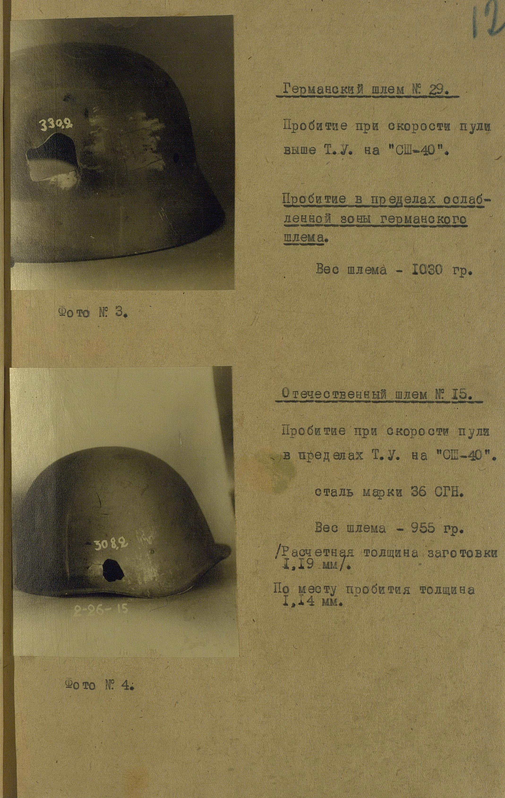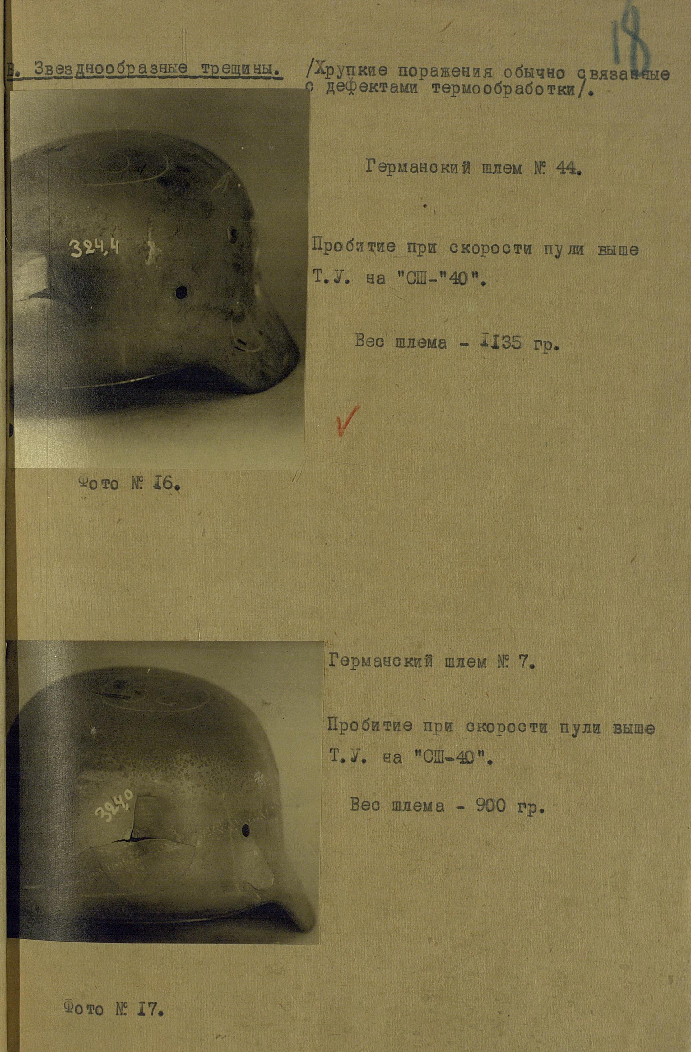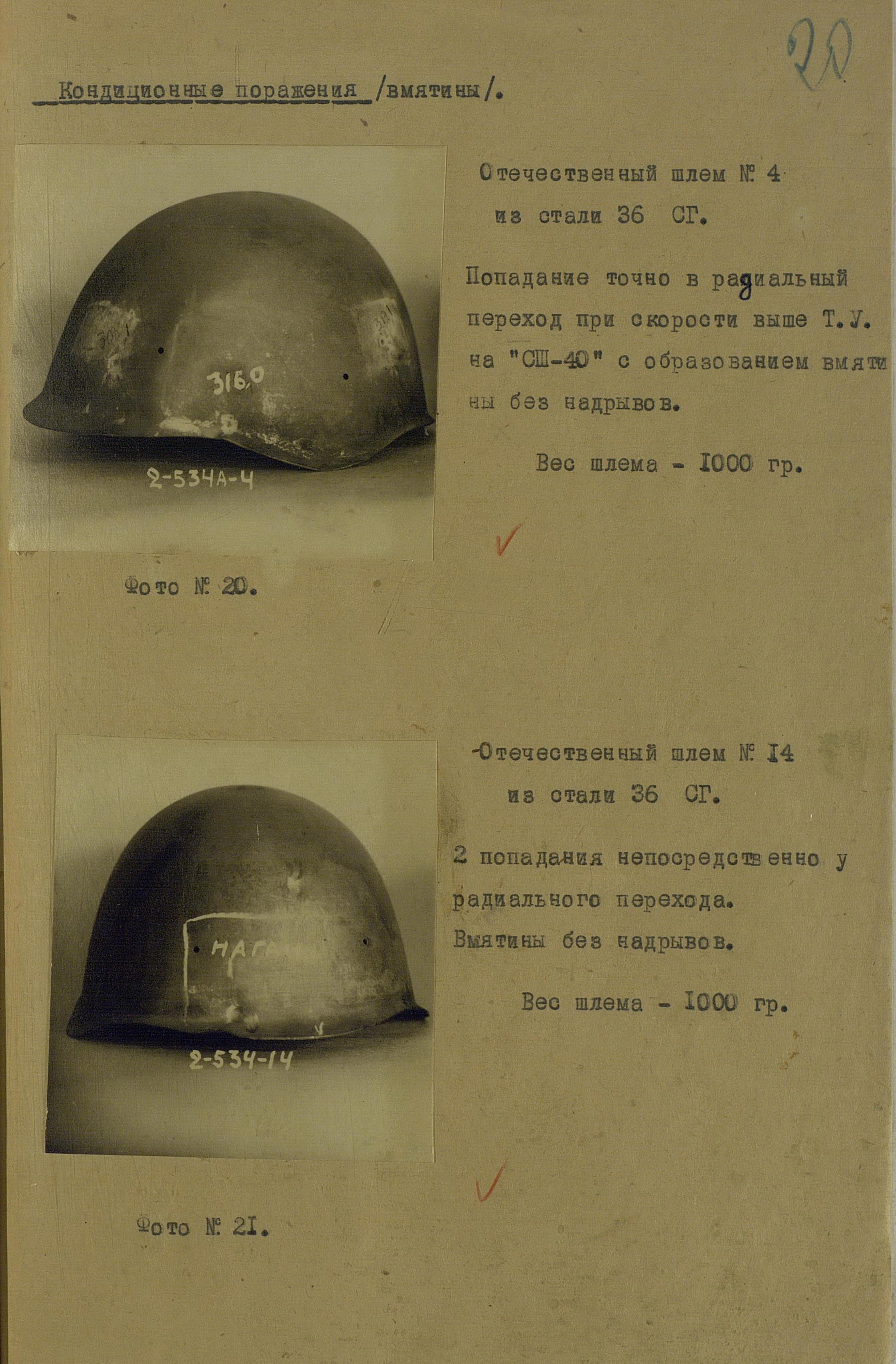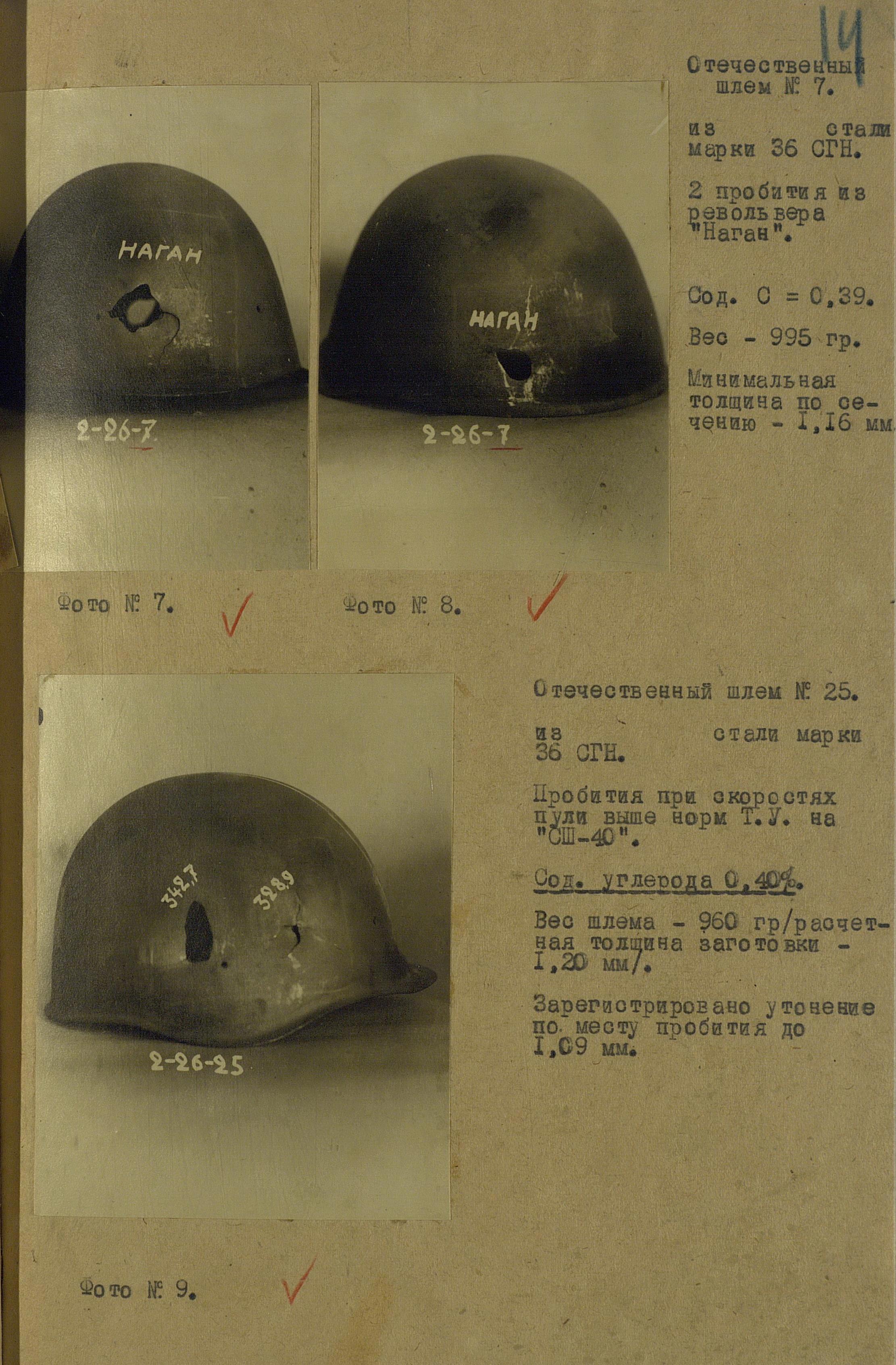 Не менее интересны и результаты обстрелов из разных видов стрелкового оружия, начиная с "Нагана" и заканчивая ППШ. Был уверен, что среди прочих есть данные и о том, как шлема держали осколки от отечественных и немецких гранат. Но, по всей видимости, эти сведения видел в делах, но копию, увы, так и не сделал.