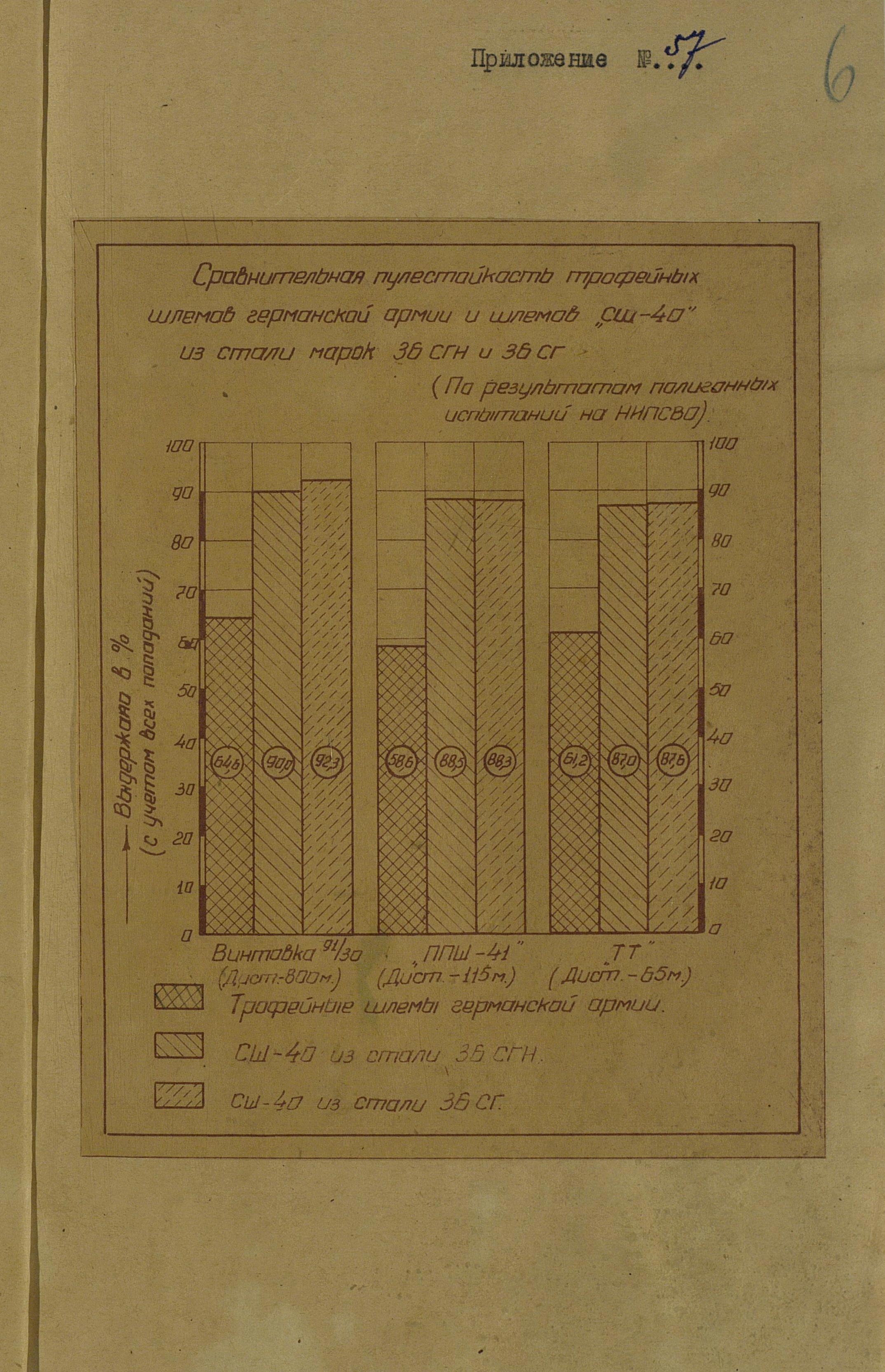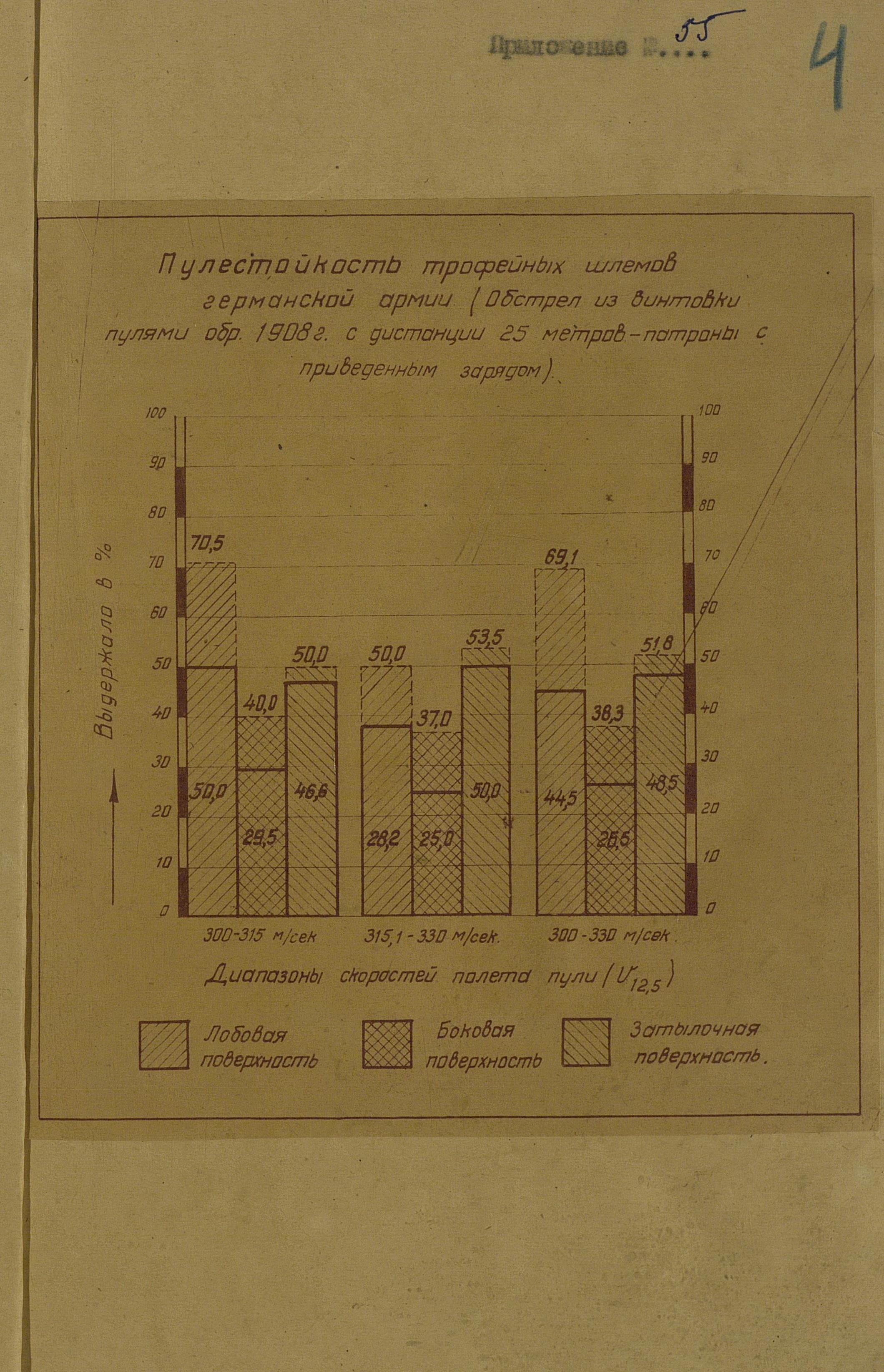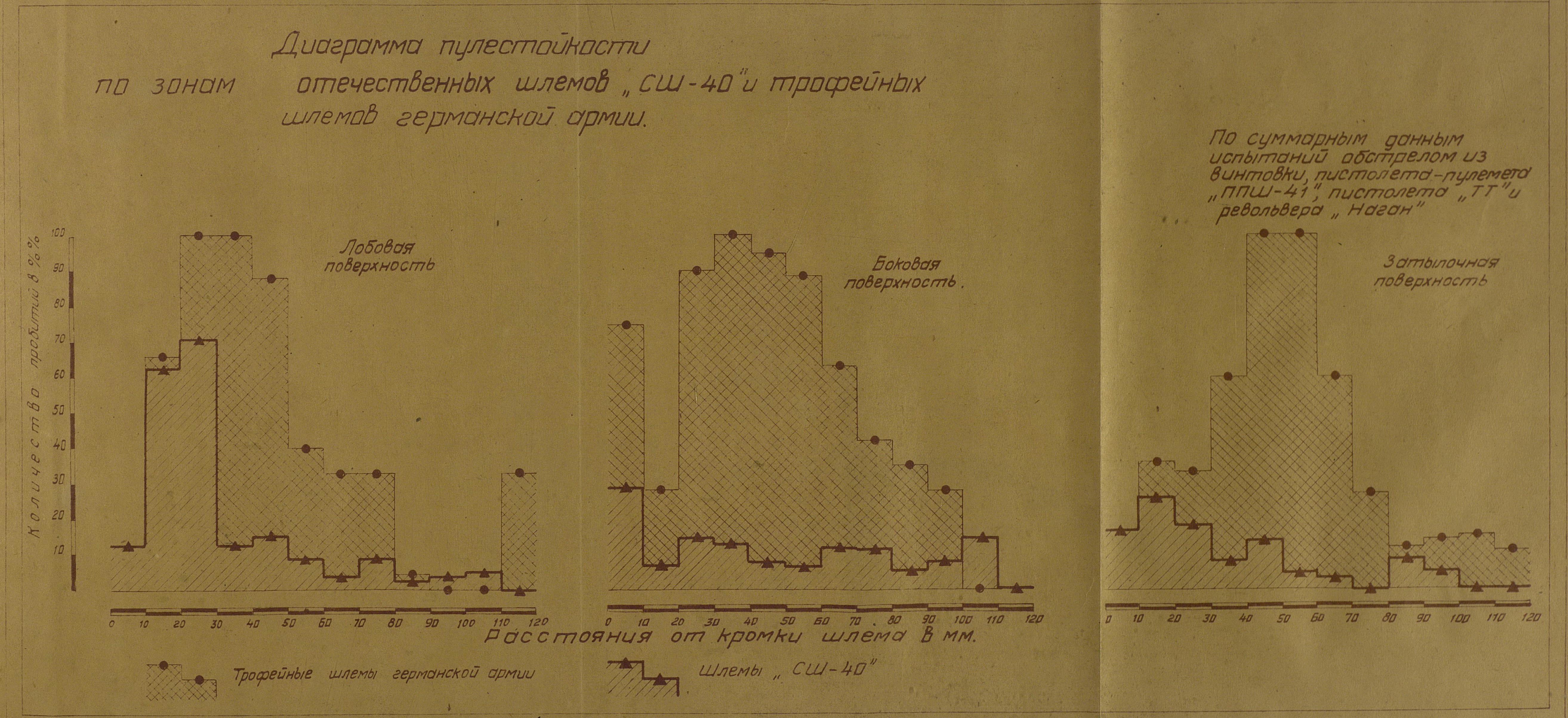 Диаграммы и фотографии с испытаний стальных шлемов отечественного и немецкого производства. 1943 год