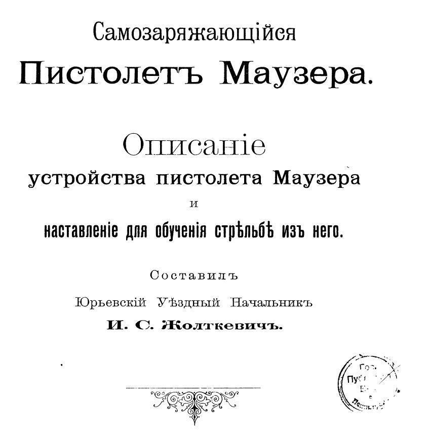 Страницы из "Описания устройства пистолета Маузер и наставление для обучения стрельбы из него", Российская Империя, Лифляндская губерния, 1909 год.