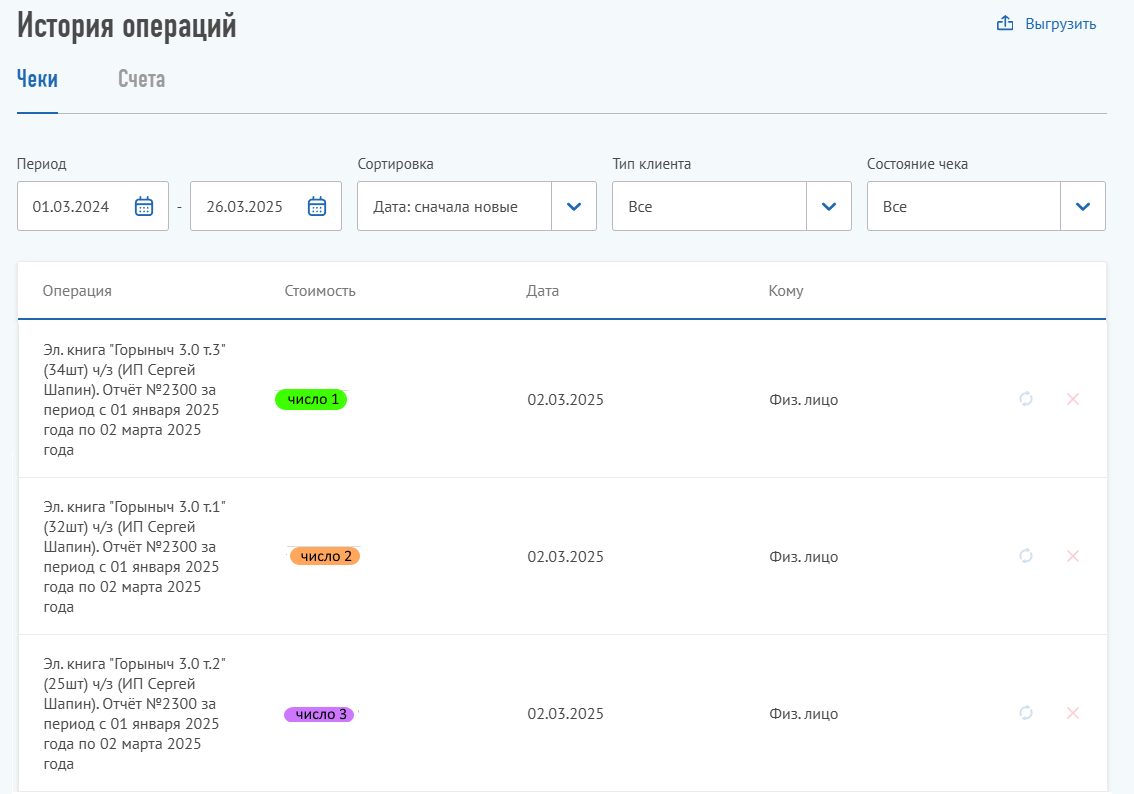 Наименование товара/услуги: Эл. книга "Название" (кол-во) ч/з (ИП Сергей Шапин). Отчёт № за период (просто можно скопировать из того же отчёта, там все копируемо, только есть ограничения по длине сообщения)