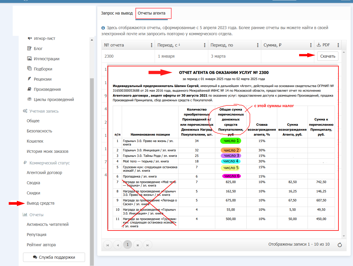 Все эти отчёты в электронном виде хранятся у вас на странице в разделе "Вывод средств".