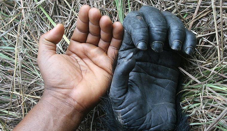Нет волос на ладошках ни у обезьян ни у человека, который из Африки пришёл в Европу! Хотя чего греха таить, вглядитесь повнимательнее - всё таки Обезьяна предлагает волосы на ладошку Человеку в качестве рассады!