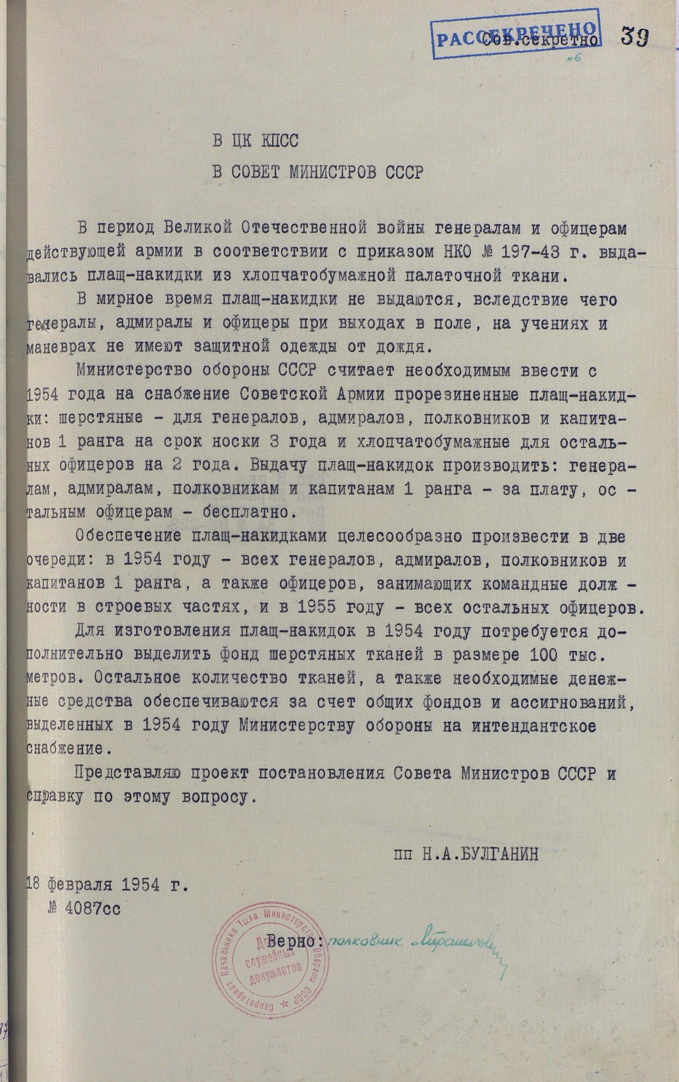 Эта плащ-накидка просуществовала почти 11 лет, и только 18 февраля 1954 г., в ЦК КПСС и Совет Министров СССР поступили обращения за подписью Министра обороны СССР маршала Советского Союза Н.А Булганина, с предложением о введении на снабжение офицеров Советской Армии и Военно-Морских Сил СССР новой, прорезиненной плащ-накидки. Похоже, после победного мая 1945 года и отмены норм, действовавших на военное время, генералы, адмиралы и офицеры никаких плащ-накидок вообще не получали и в течении девяти лет, офицеры, включая высших, мокли на построениях, выходах в поле, учениях и маневрах.