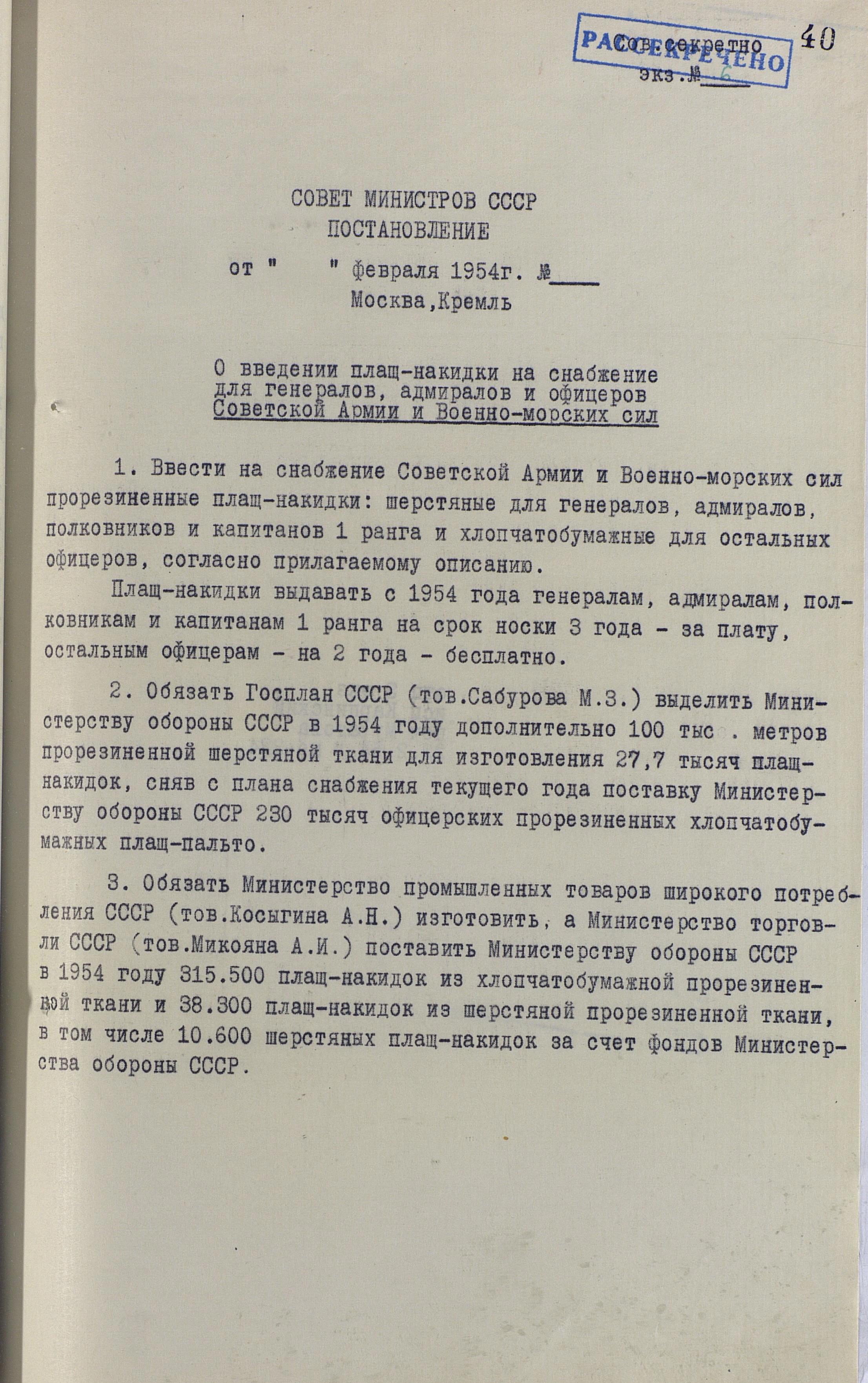 О введении прорезиненной плащ-палатки для генералов, адмиралов, офицеров Советской Армии и ВМС СССР