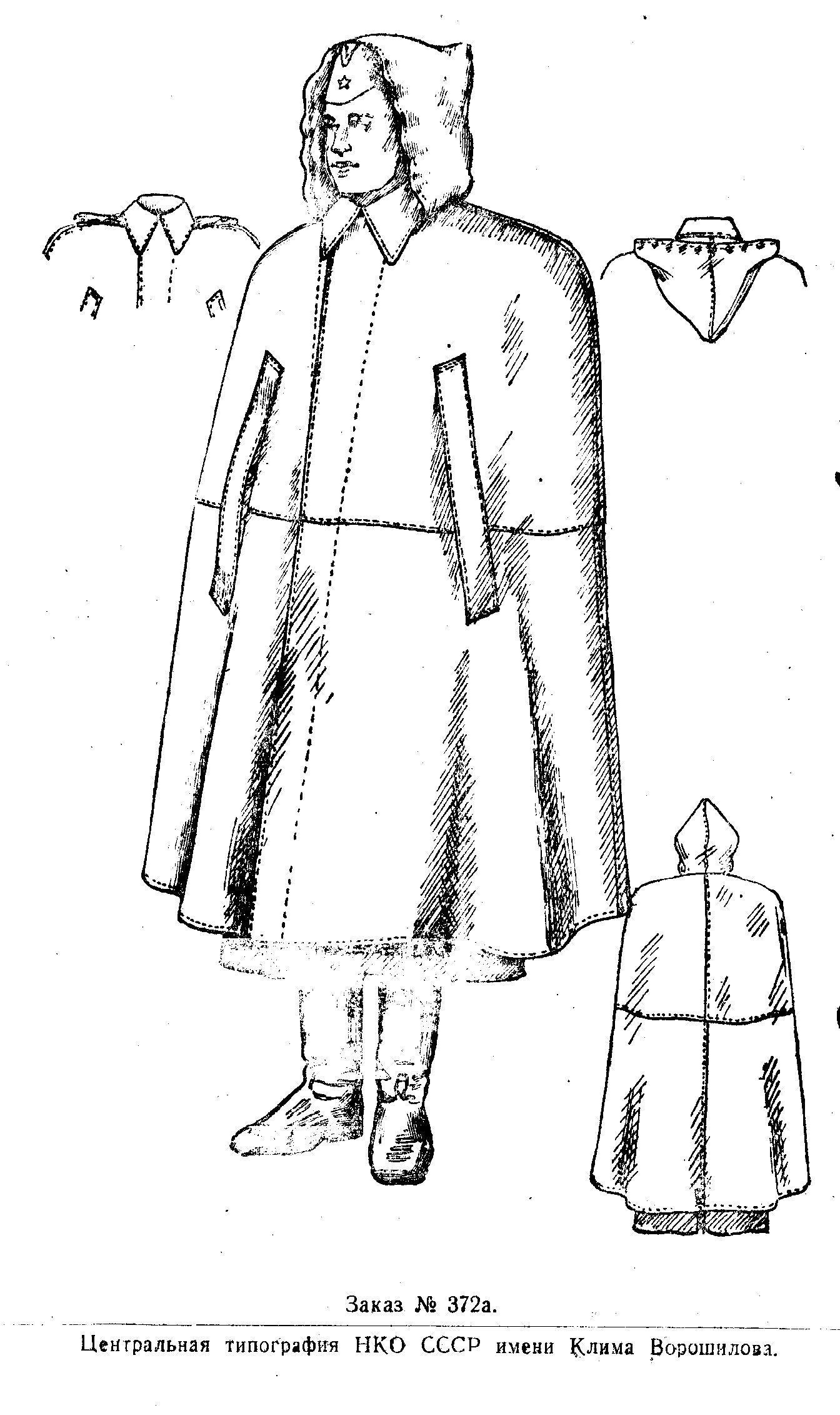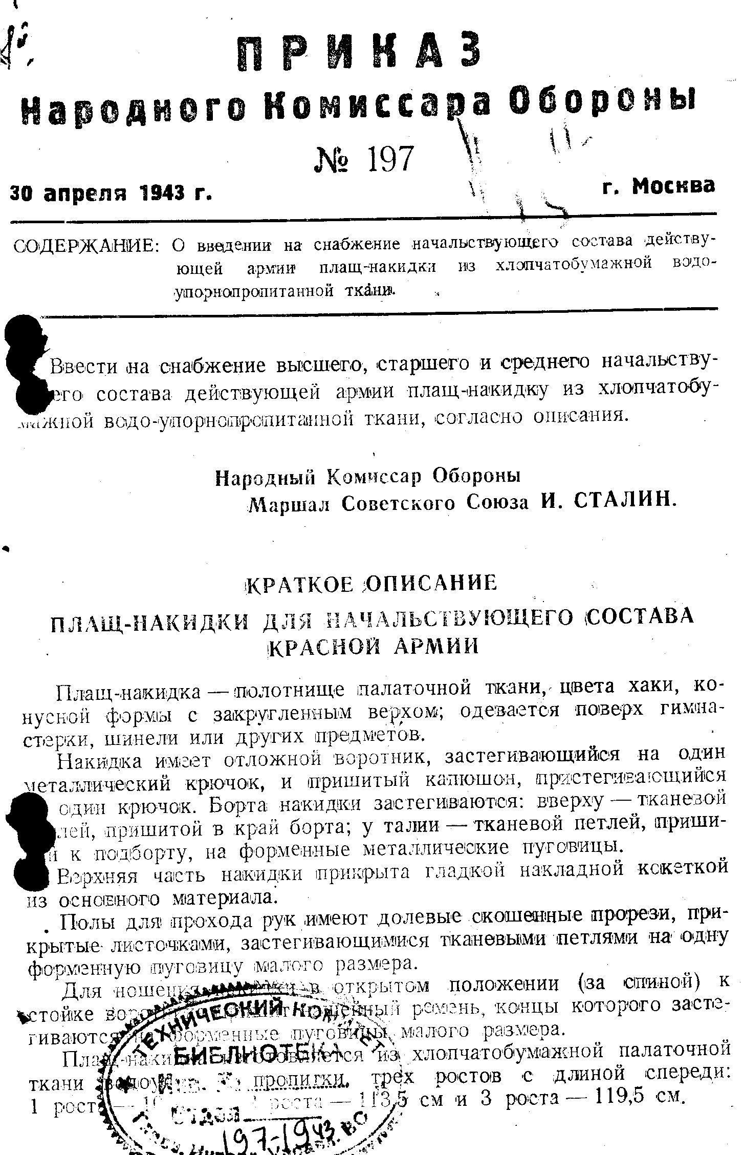 Итак, до появления знакомой всем плащ-накидки, офицерам выдавался другой, схожий по конструкции, но отличающийся по материалу, предмет. 30 апреля 1943 г. был издан приказ Наркома обороны СССР № 197 «О введении на снабжение начальствующего состава действующей армии плащ-накидки из хлопчатобумажной водоупорнопропитанной ткани».