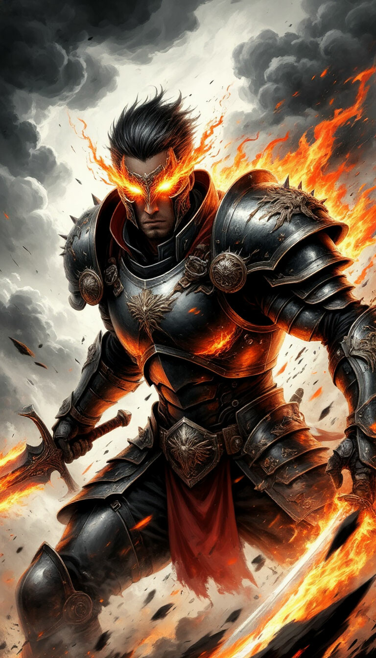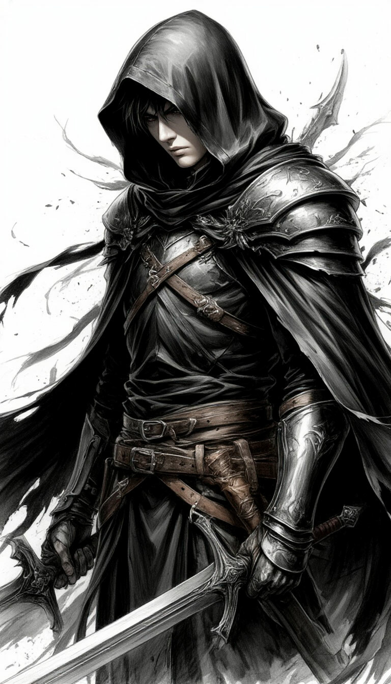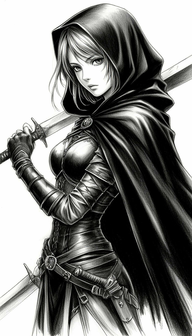 Воин женщина, в чёрном плаще, Аниме, фэнтези арт, character. красивый ракурс. в позе. surrealism . colored pencil illustration, магические огоньки вокруг.