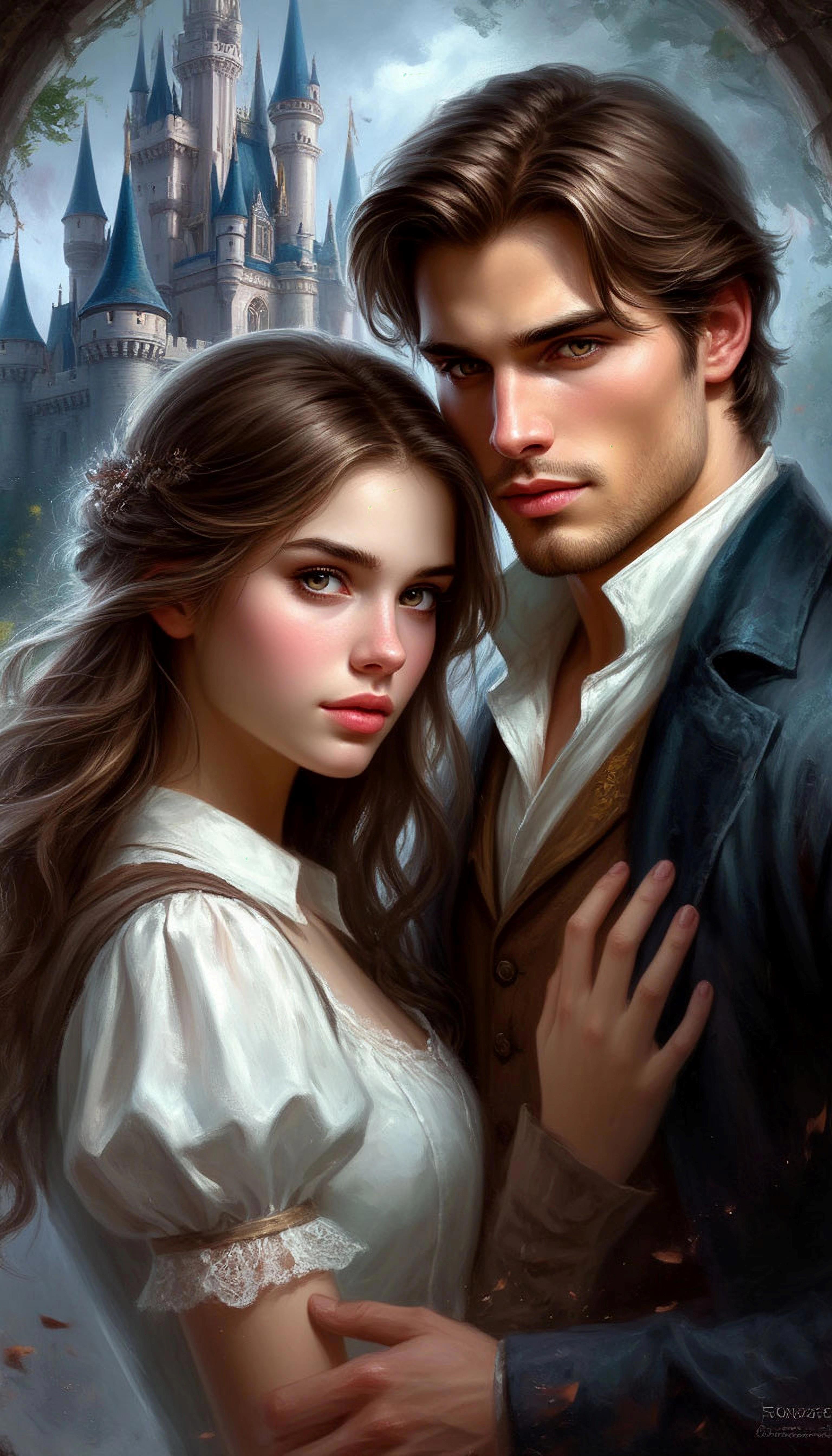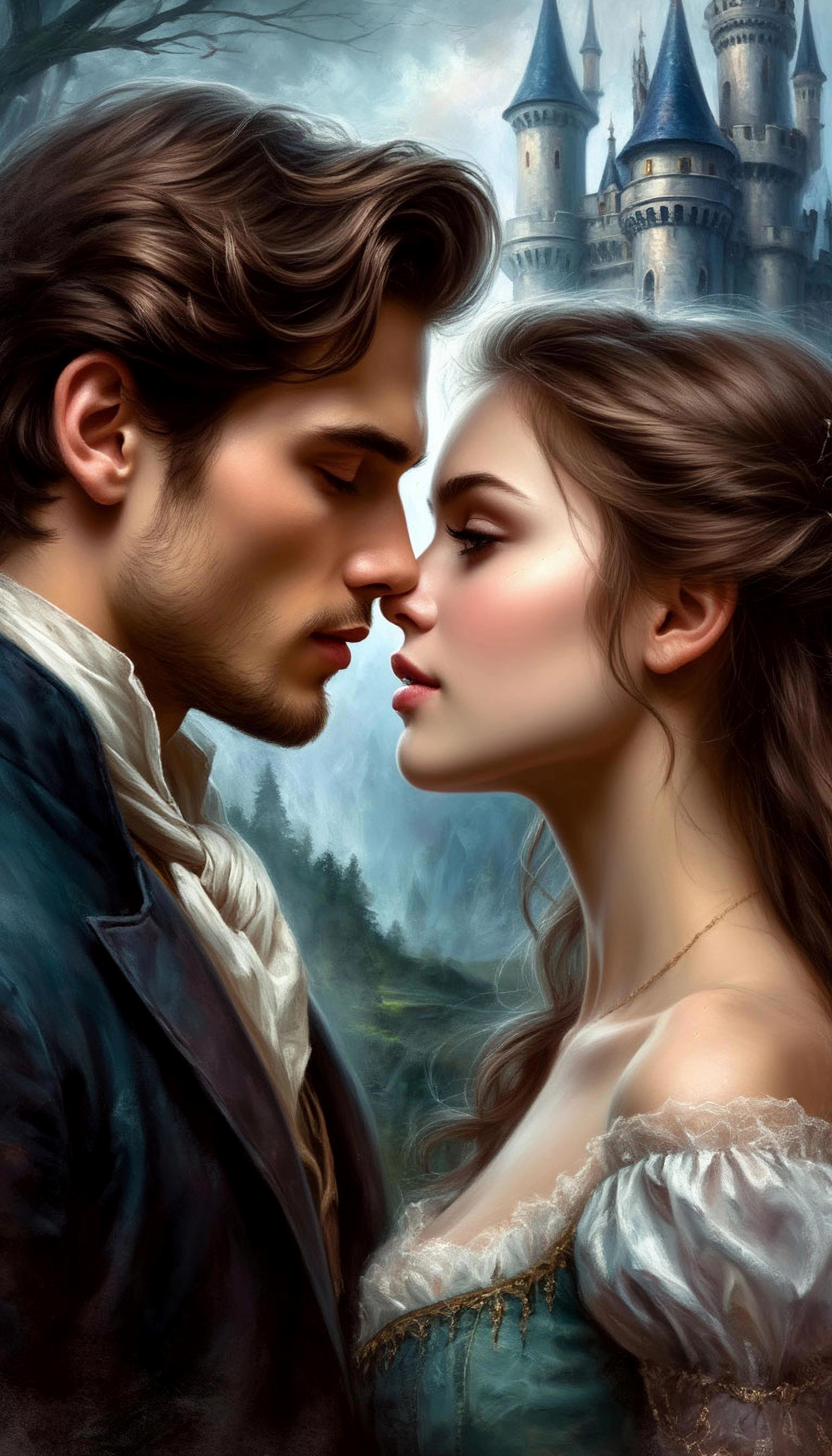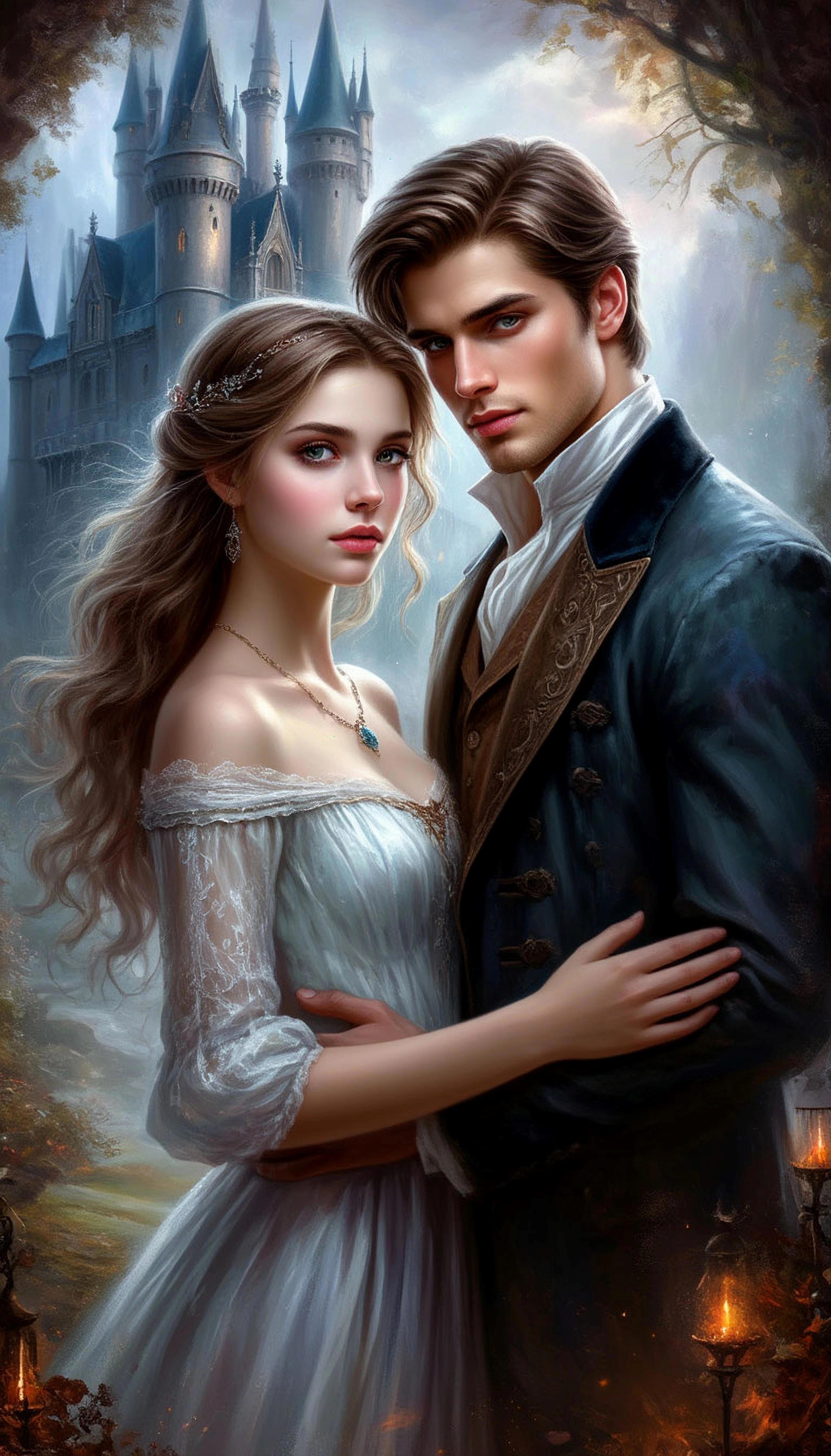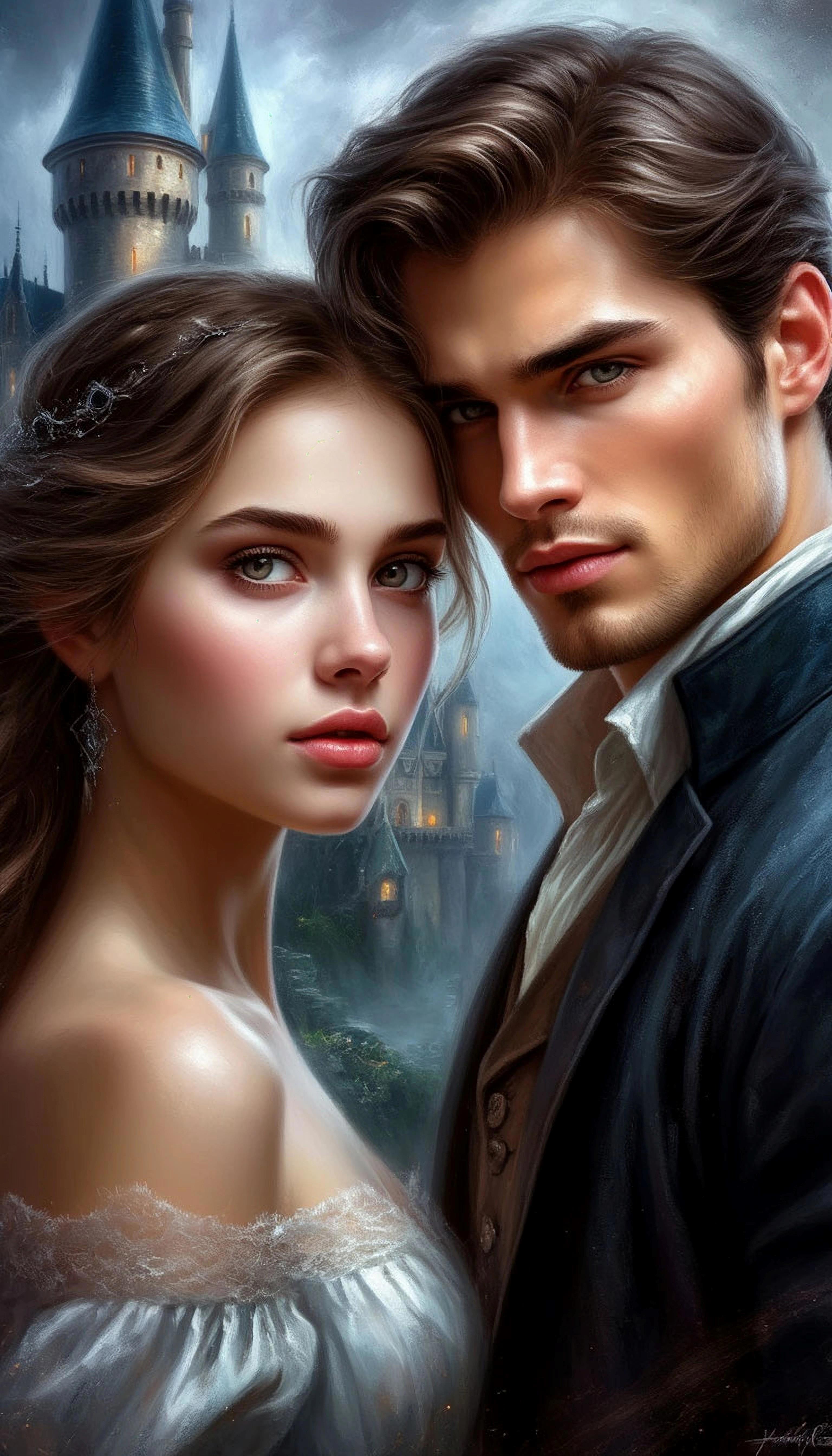 крупный план, красивая девушка, и красивый мужчина, туман, академия магии, замок, фентези, призрачно, динамика, волшебство, детализация, холст, масло, мягкая подсветка, дымка