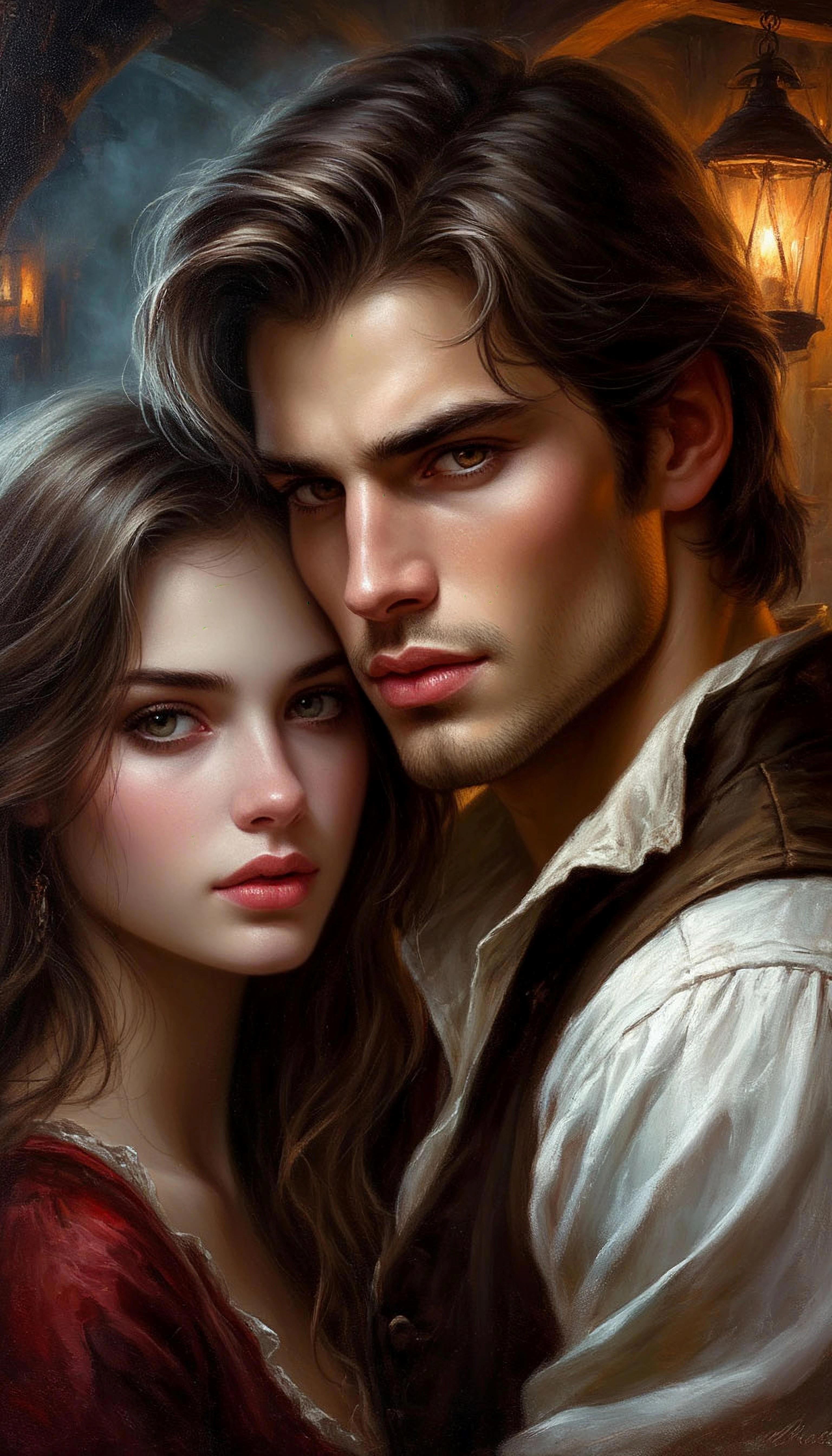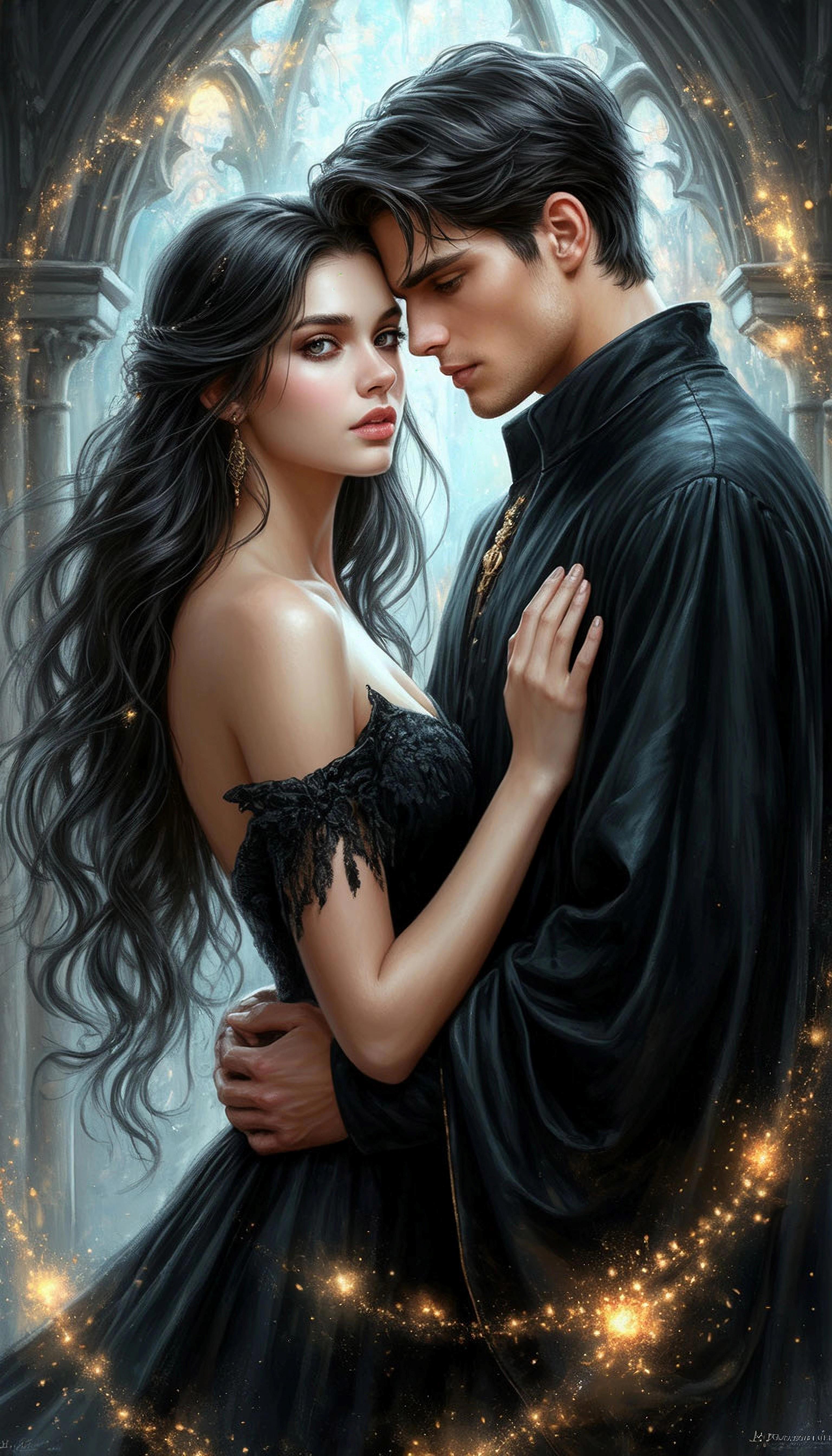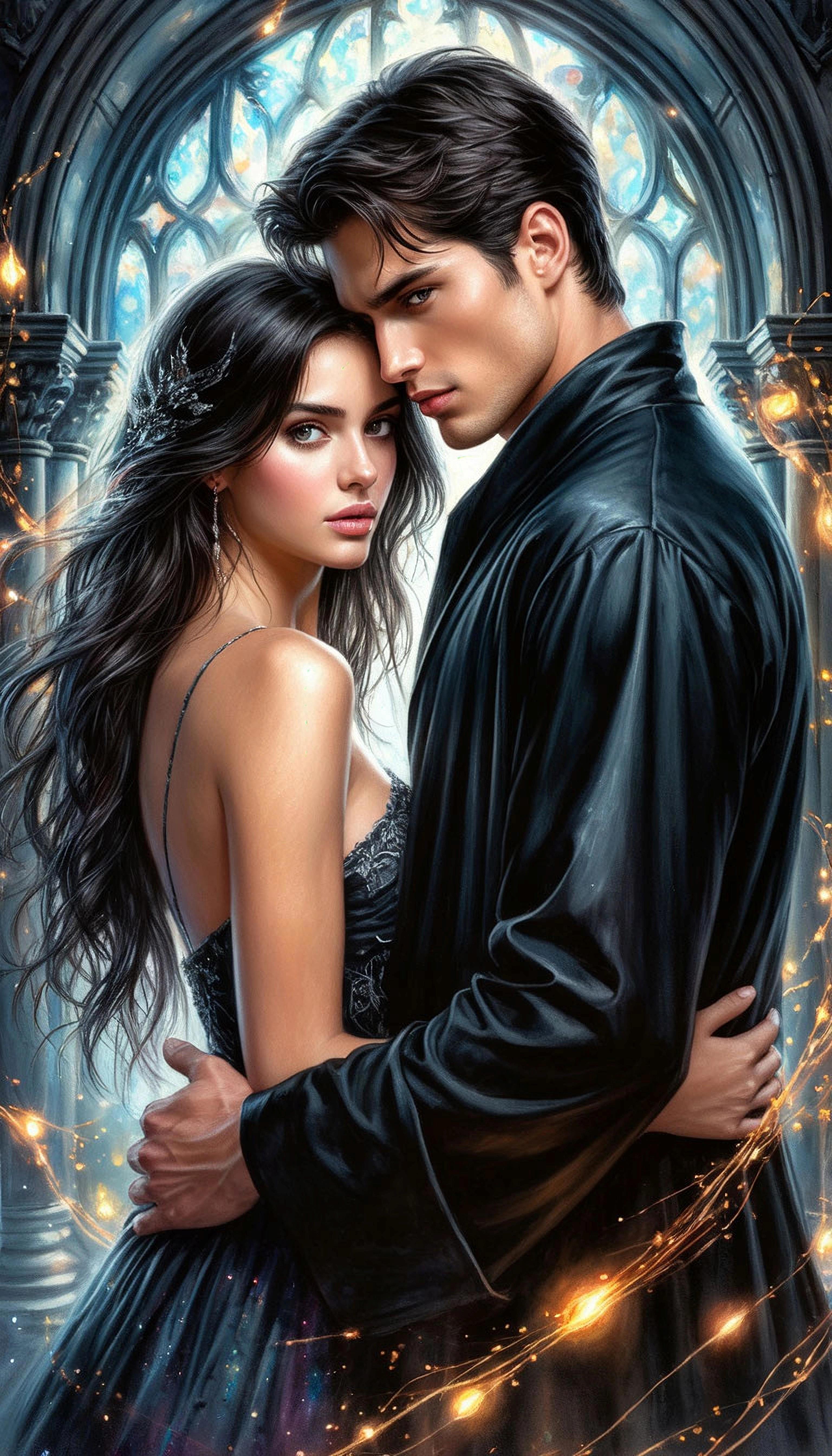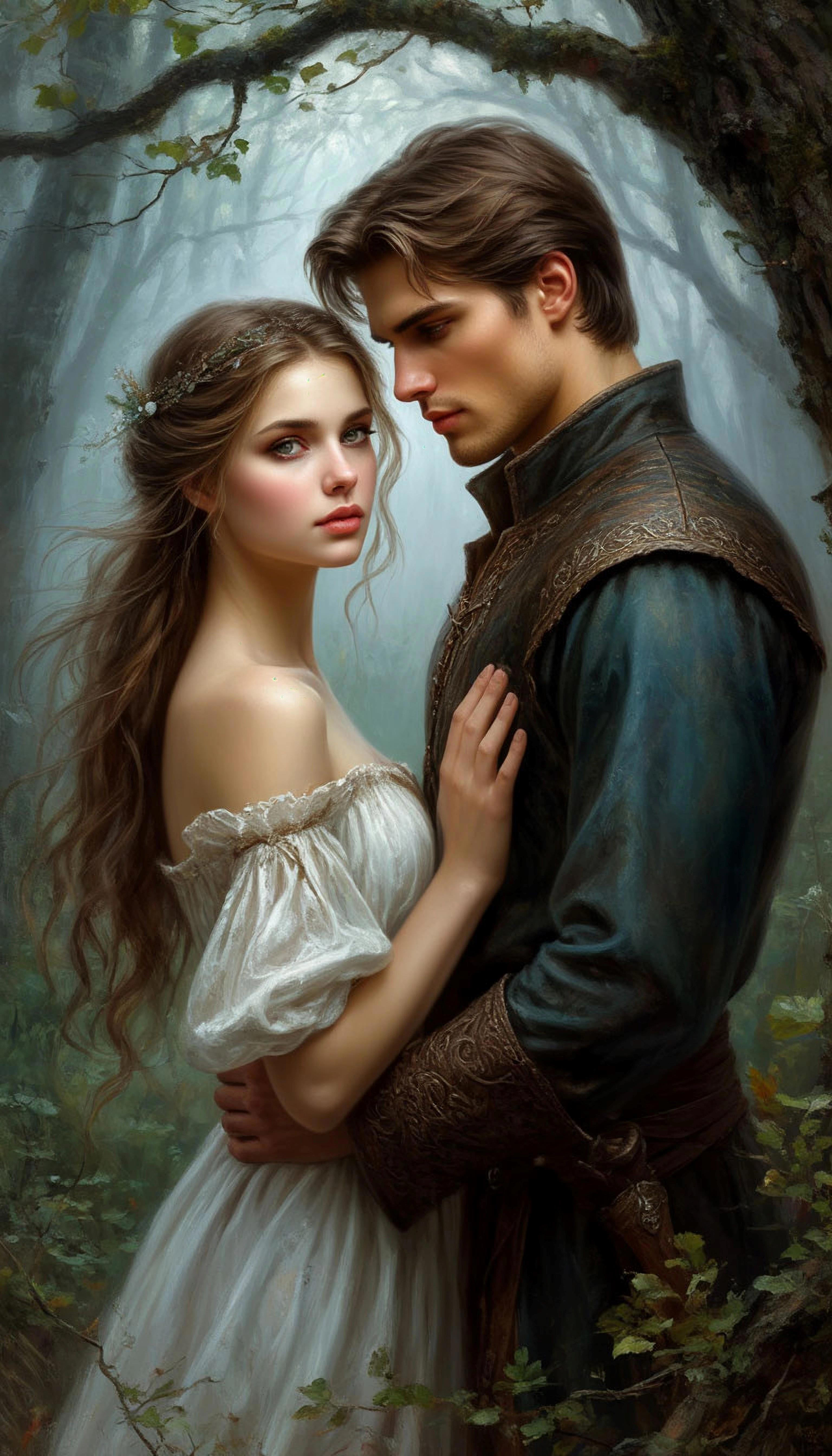 крупный план, красивая девушка, и красивый мужчина, туман, академия магии, замок, фентези, призрачно, динамика, волшебство, детализация, холст, масло, мягкая подсветка, дымка