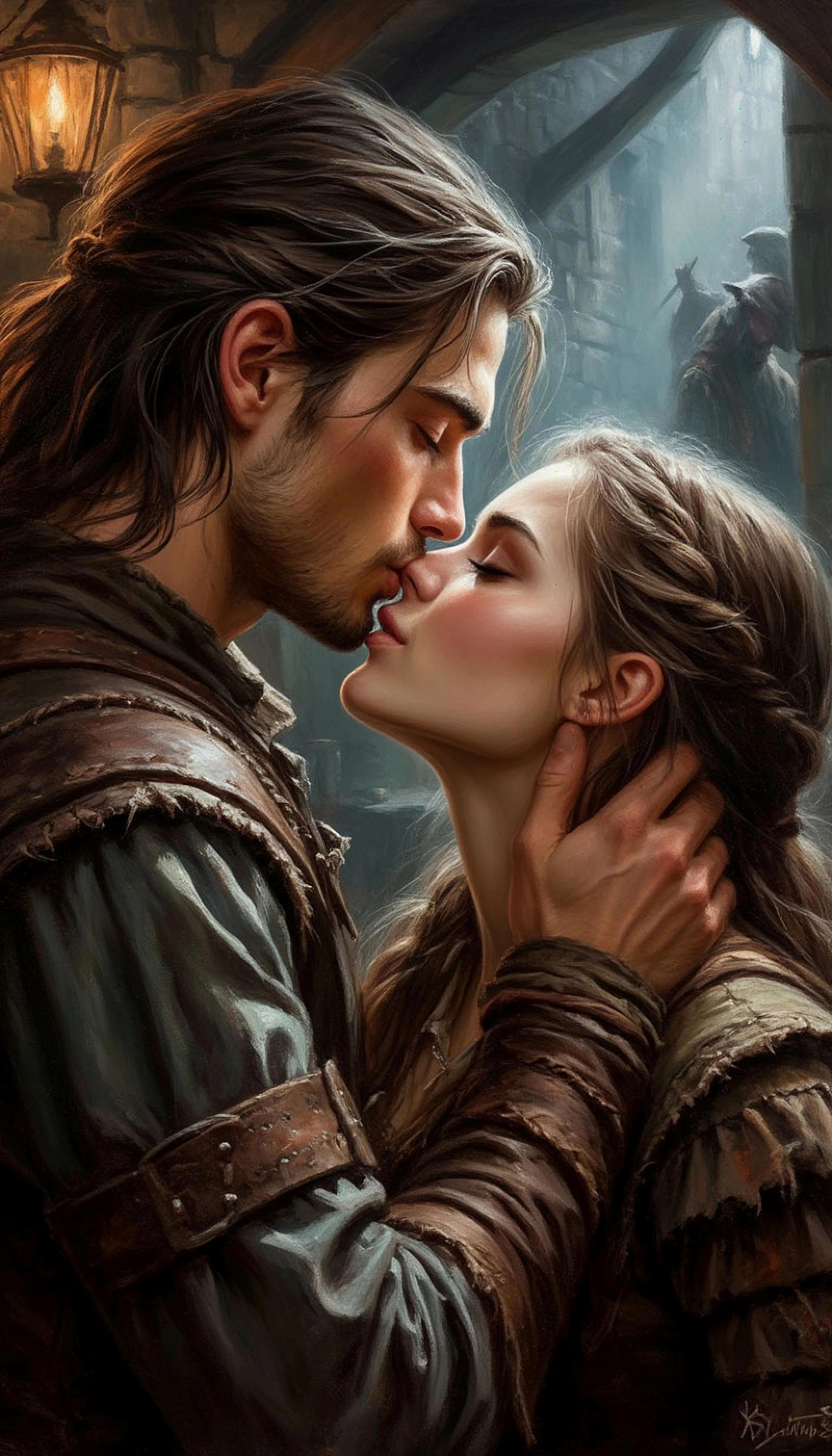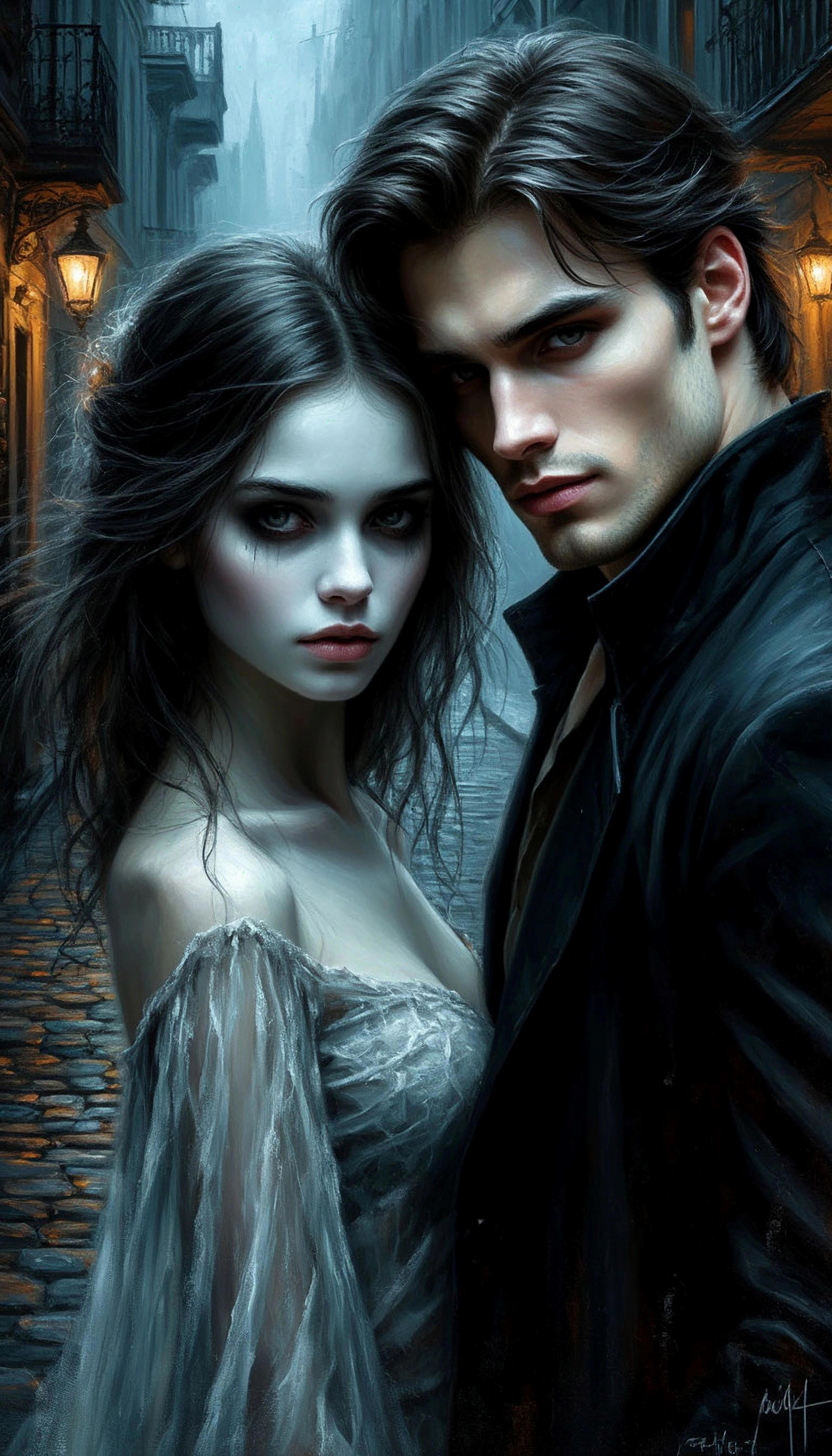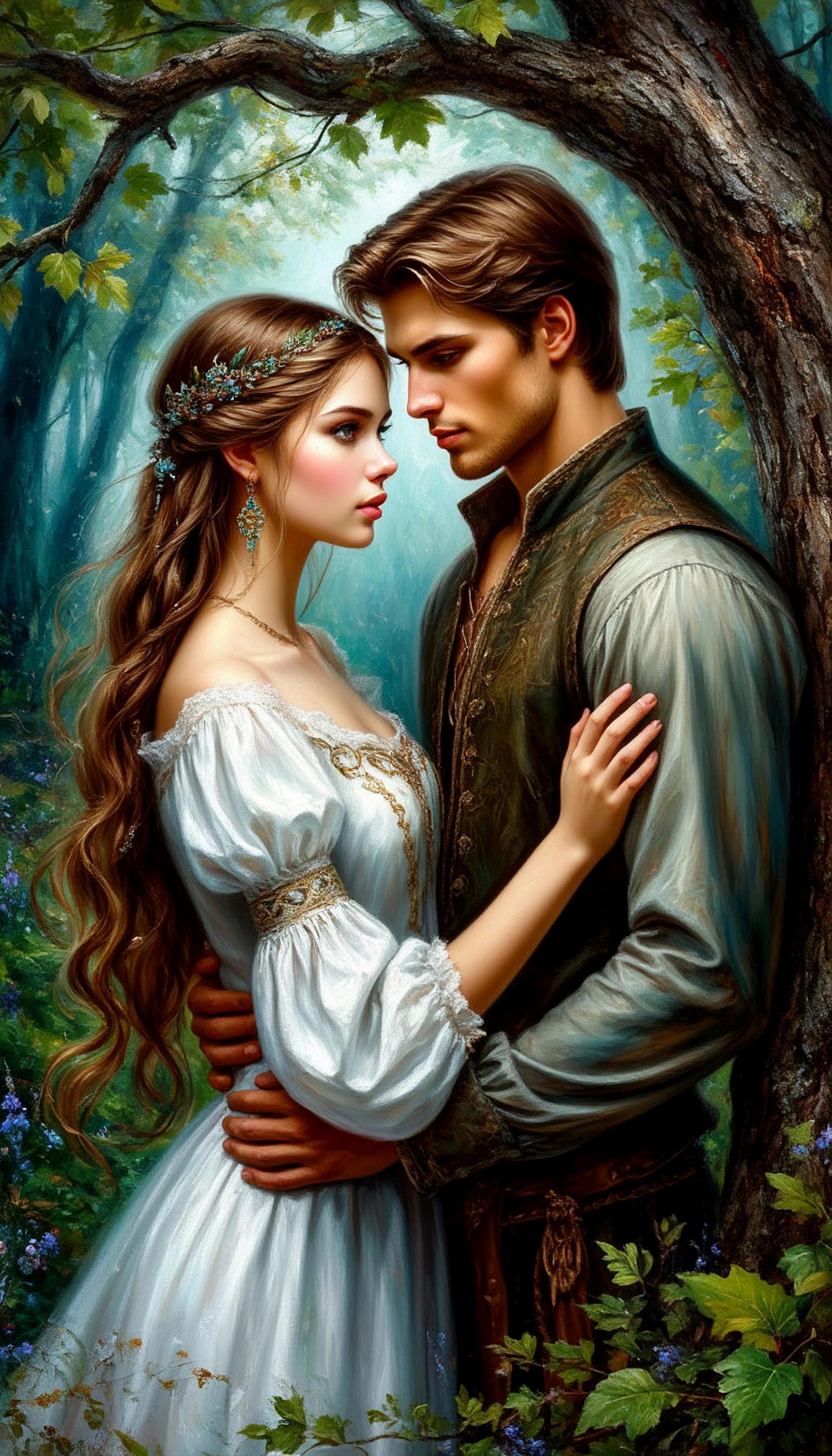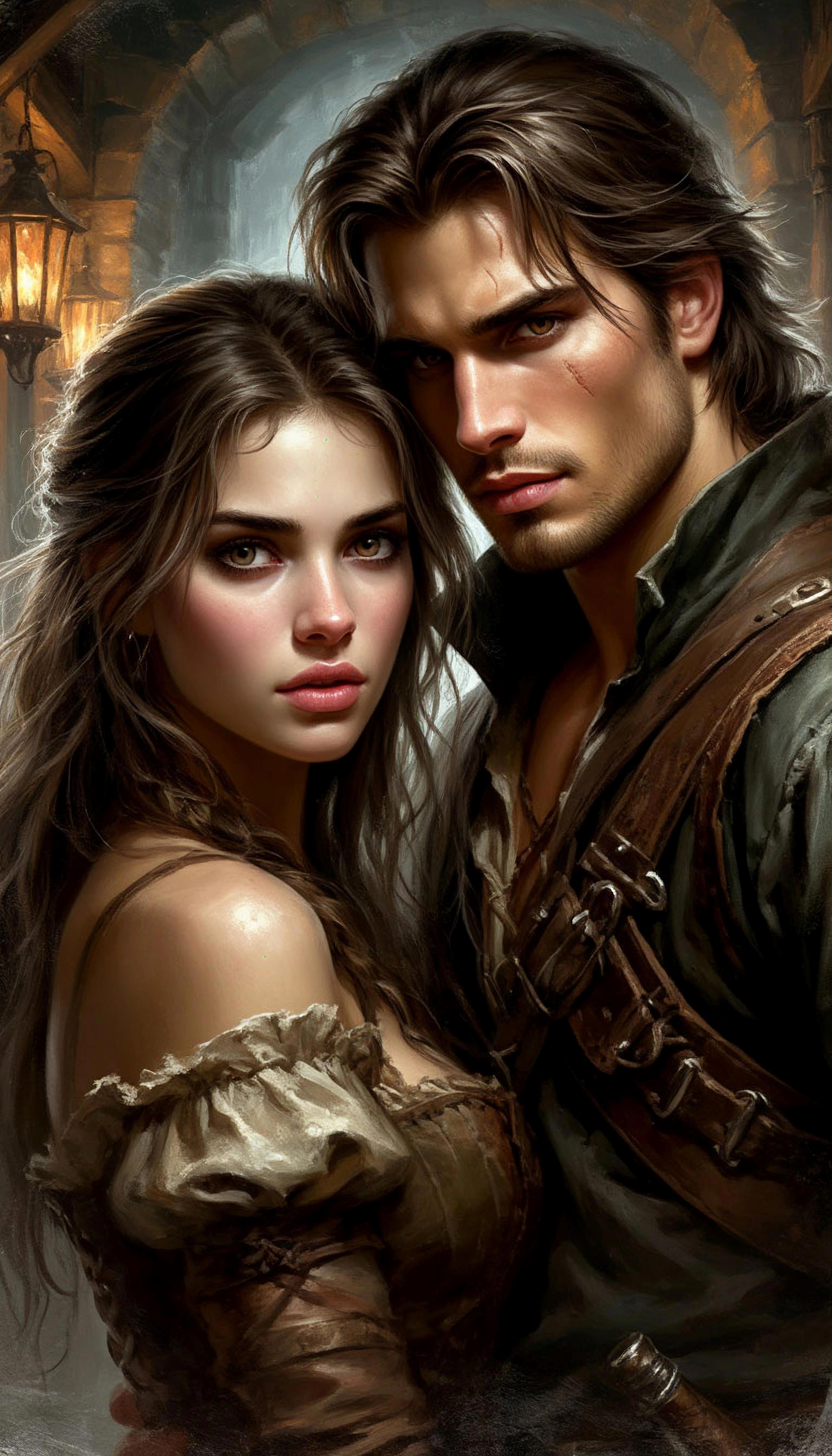 крупный план, красивая девушка, и красивый мужчина, туман, академия магии, замок, фентези, призрачно, динамика, волшебство, детализация, холст, масло, мягкая подсветка, дымка