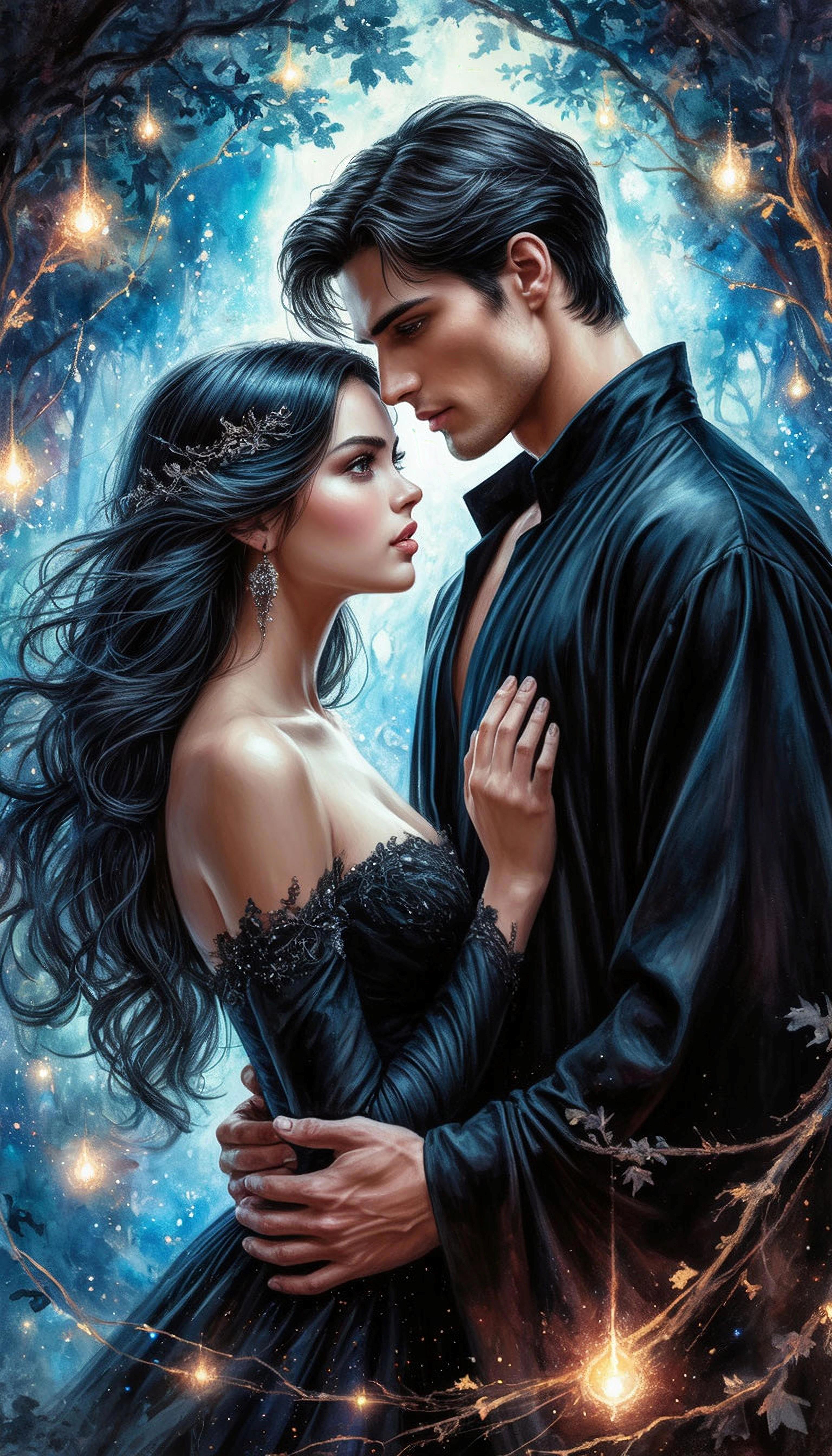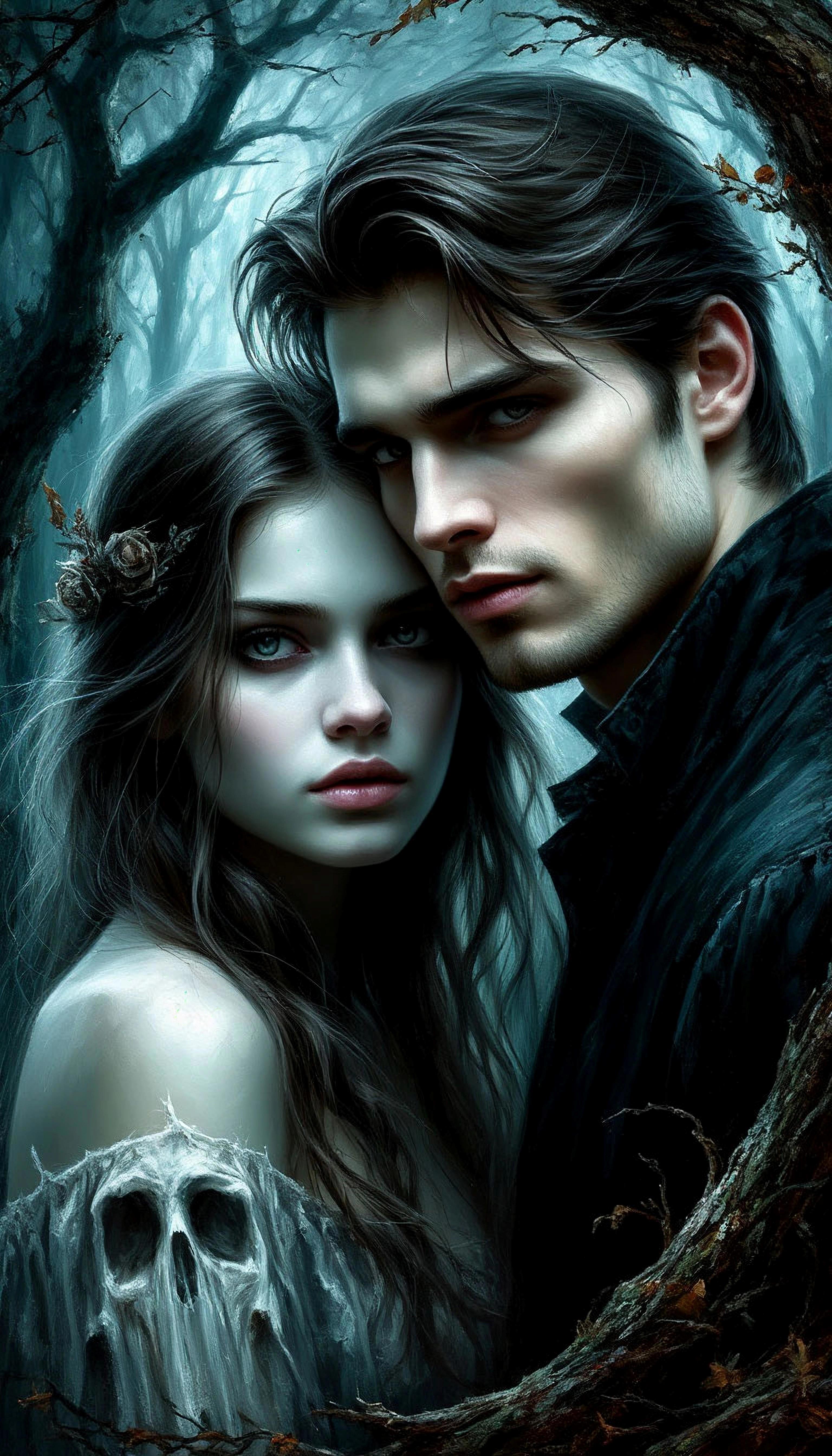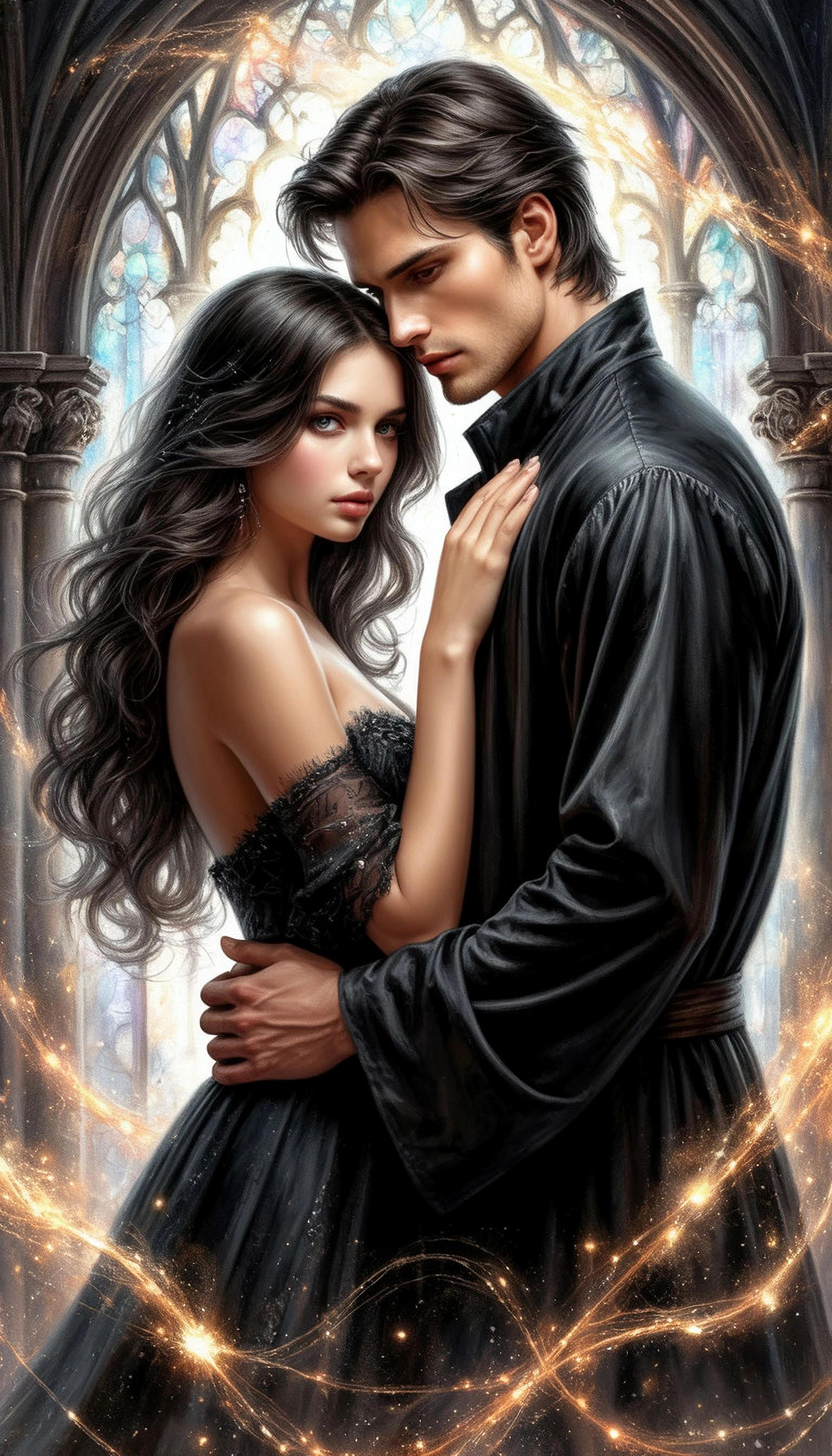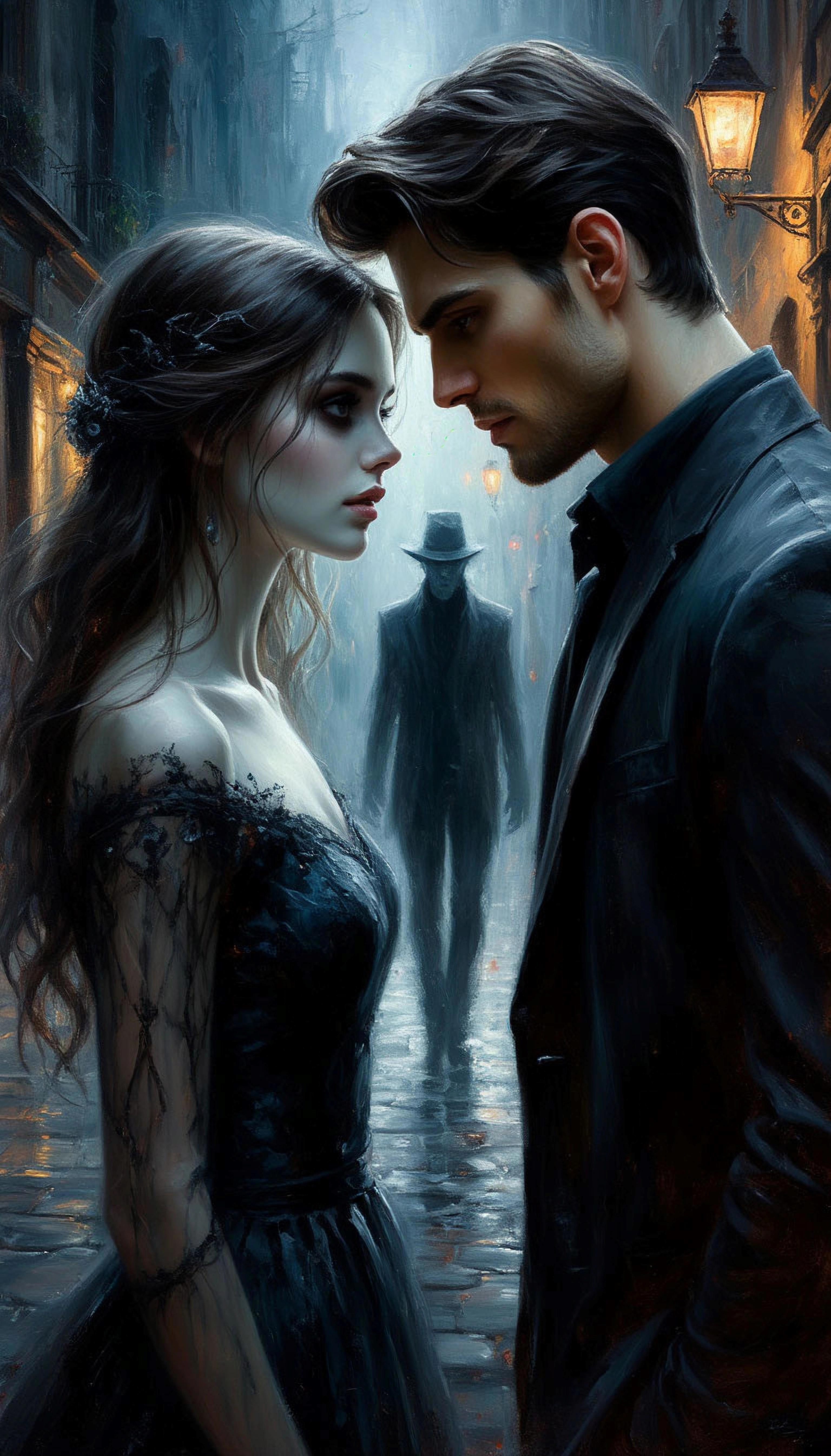 крупный план, красивая девушка, и красивый мужчина, туман, академия магии, замок, фентези, призрачно, динамика, волшебство, детализация, холст, масло, мягкая подсветка, дымка