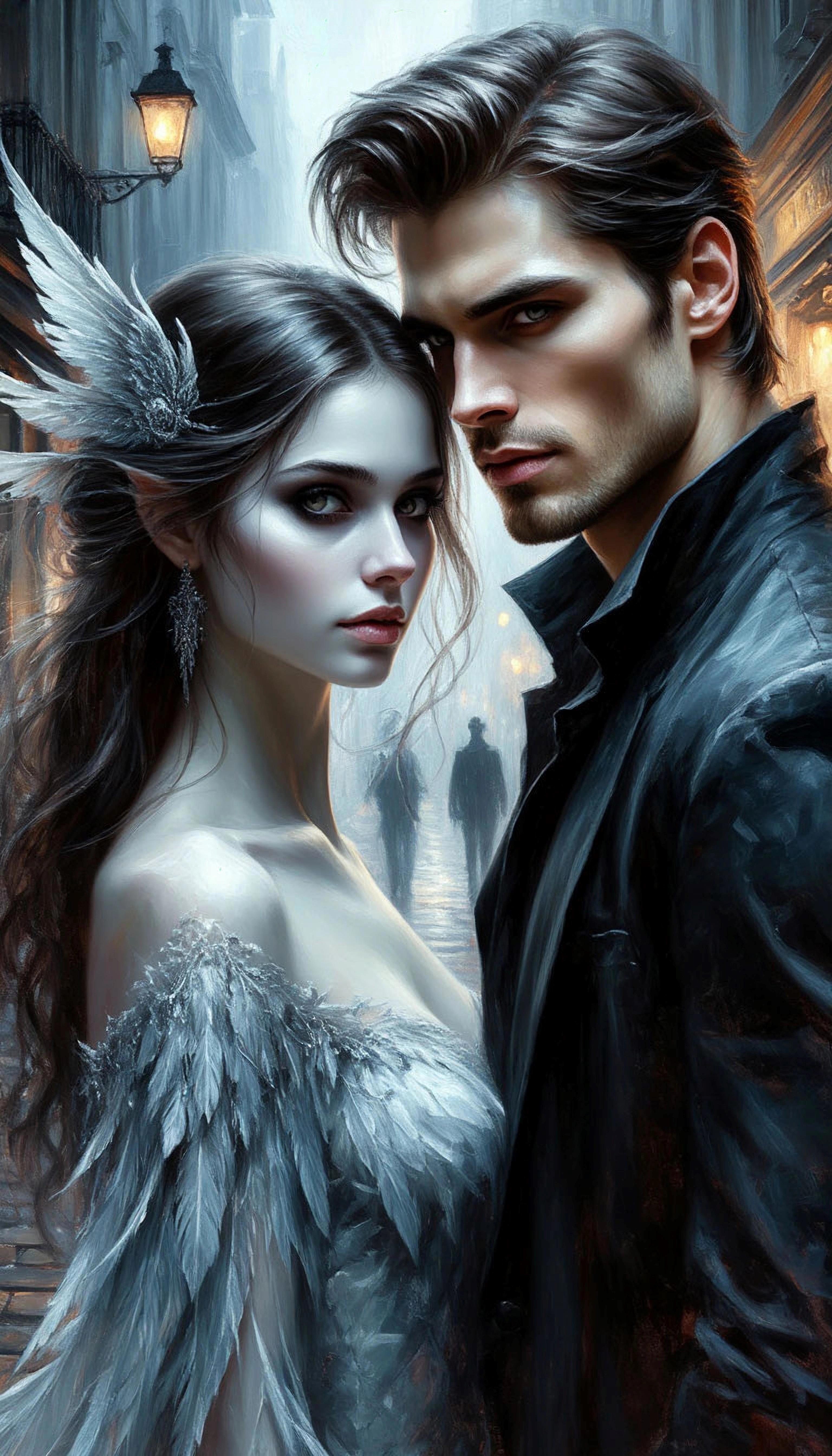 крупный план, красивая девушка-гарпия-призрак, призрачно, улица, динамика, призрачно, мистика, волшебство, готика, детализация высокая, холст, масло, мягкая подсветка