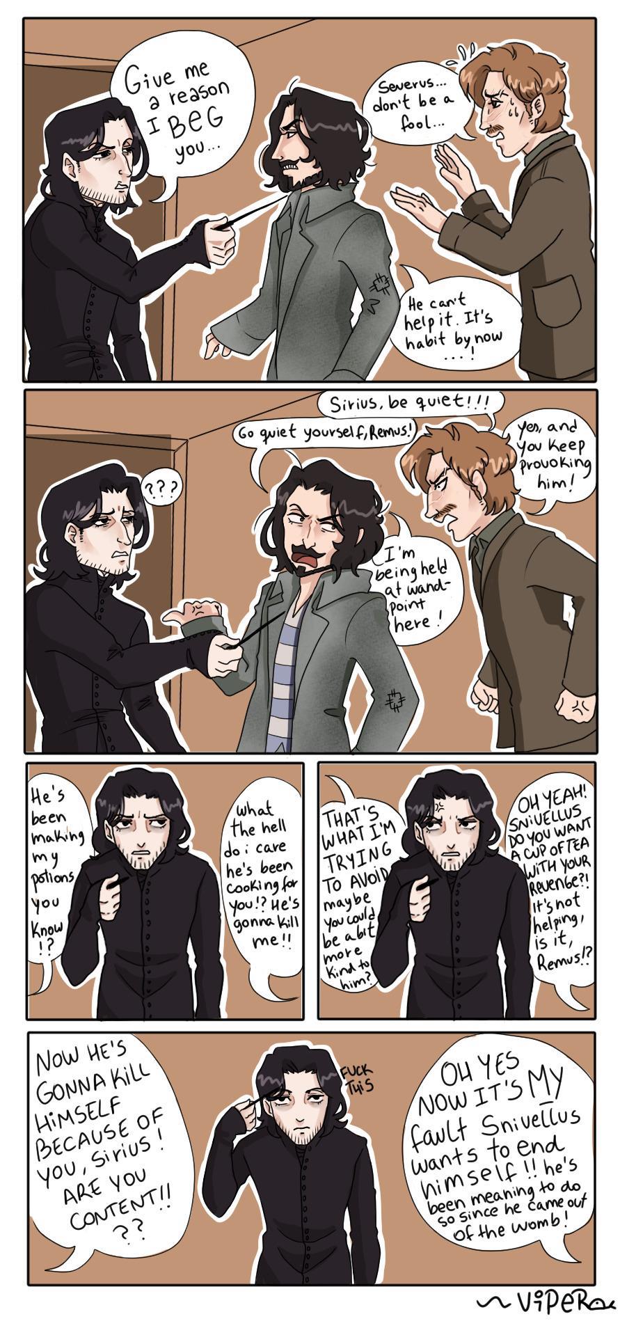 Блэк: — Да без проблем! Нюниус, хочешь чашечку чая, как закончишь мстить?! Что, Римус, помогло?!