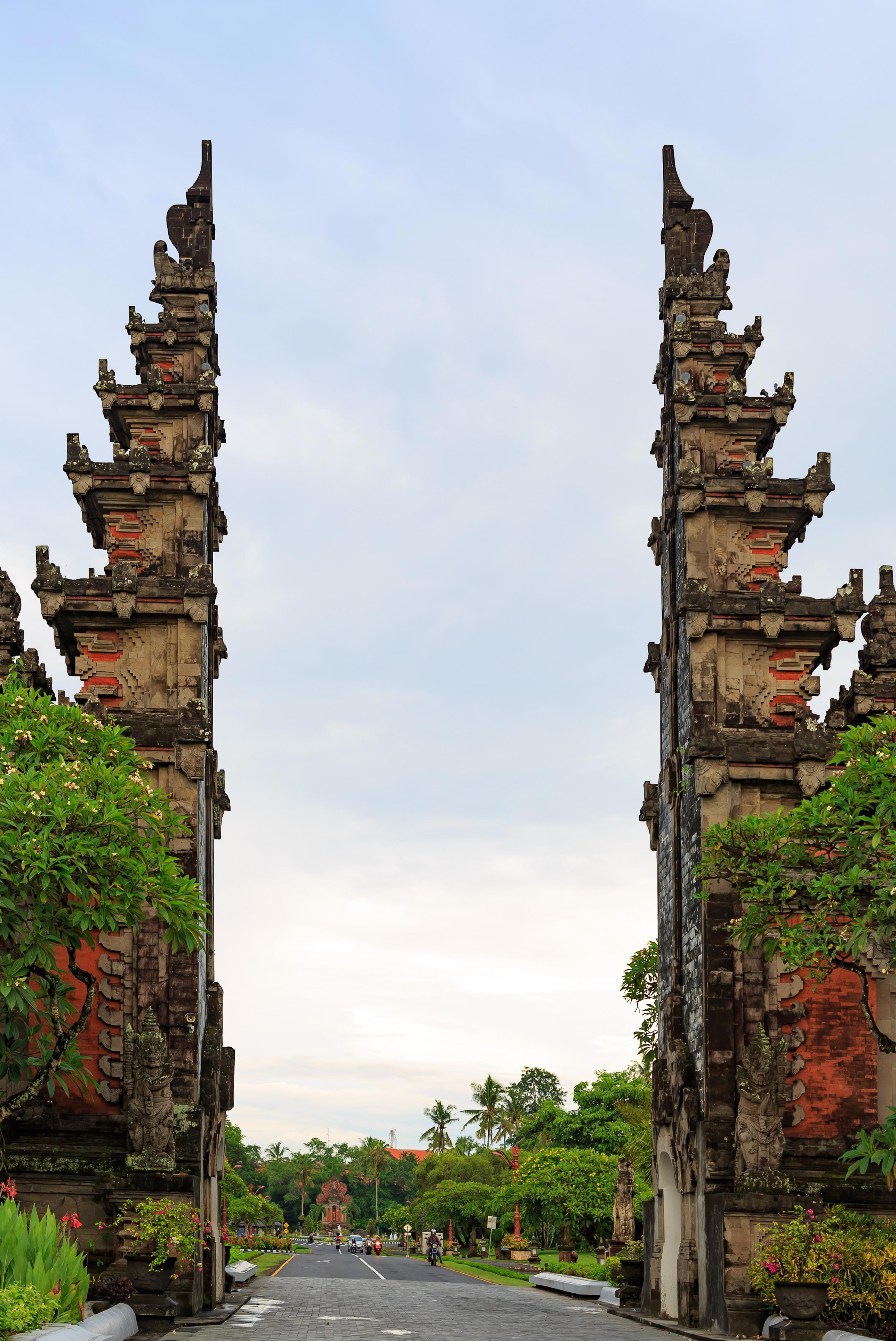 Дорога между тем пересекла административную границу города Денпасара, и расширилась до трёх полос в одну сторону, все районы разделены так называемыми «Расколотыми воротами». Не смог сделать качественного снимка по ходу движения, взял в инете. Вроде таких.