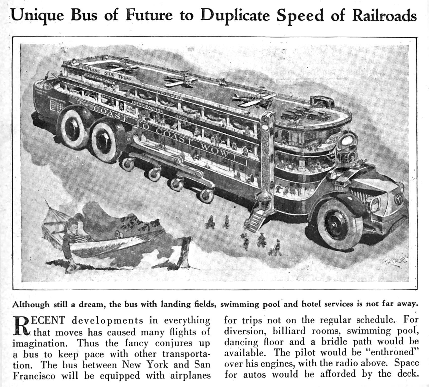 Но в 30-е была мысль, что обычные автобусы имеют слишком маленькую производительность. Предполагалось строить вот такие монстры, настоящие сухопутные лайнеры, способные перевести сразу человек по 300. У этого вообще на крыше аэродром уместился. Увы, не стартовало - больно дороги были нужны широкие