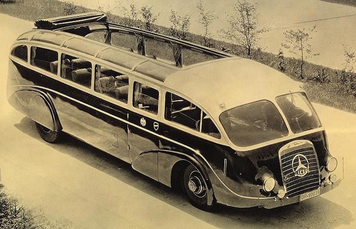 30-е - реальная туристическая модель, Мерседес-Бенц. Кондиционера нет, но он и не нужен - вентиляция обеспечивается за счет съемной крыши. Почти автобус-кабриолет получился