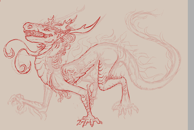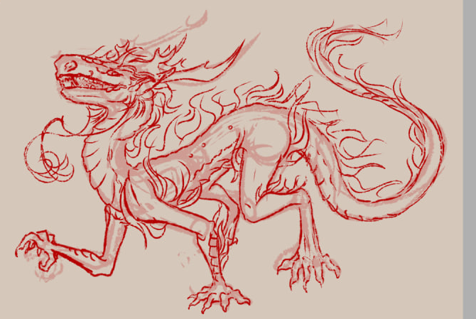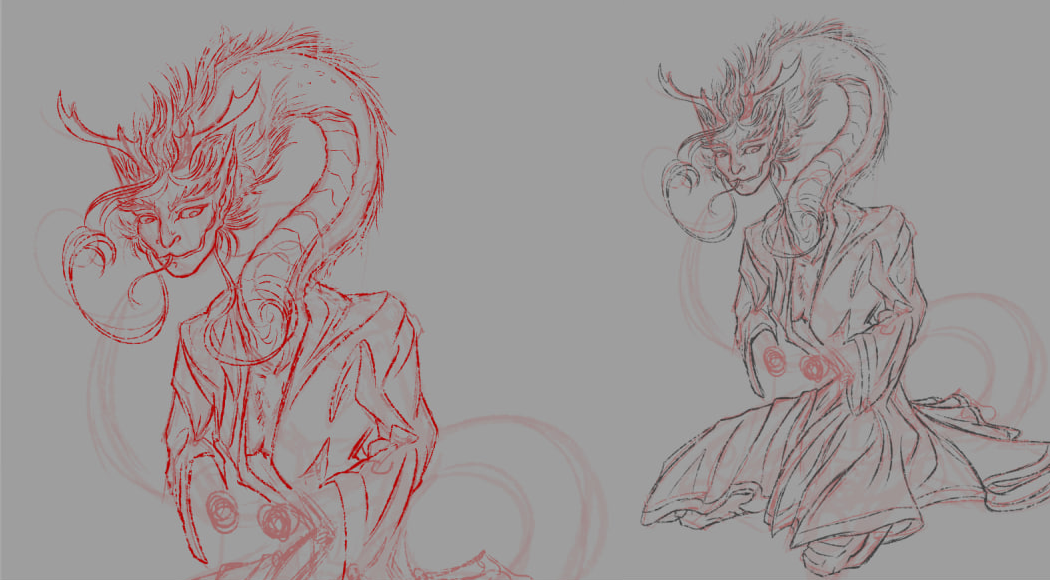 Тут у меня не сохранилось самых первых процессов, потому что не всё хотелось показывать; держать какую-то интригу, чтобы было интересно показать готовый результат. Здесь бралось референсом изображение рокурокуби. Длинная шея отлично накладывается на драконью ипостась. На референсе девушка тоже сидела, потому примерно повторяю мотив (но не позу полностью).