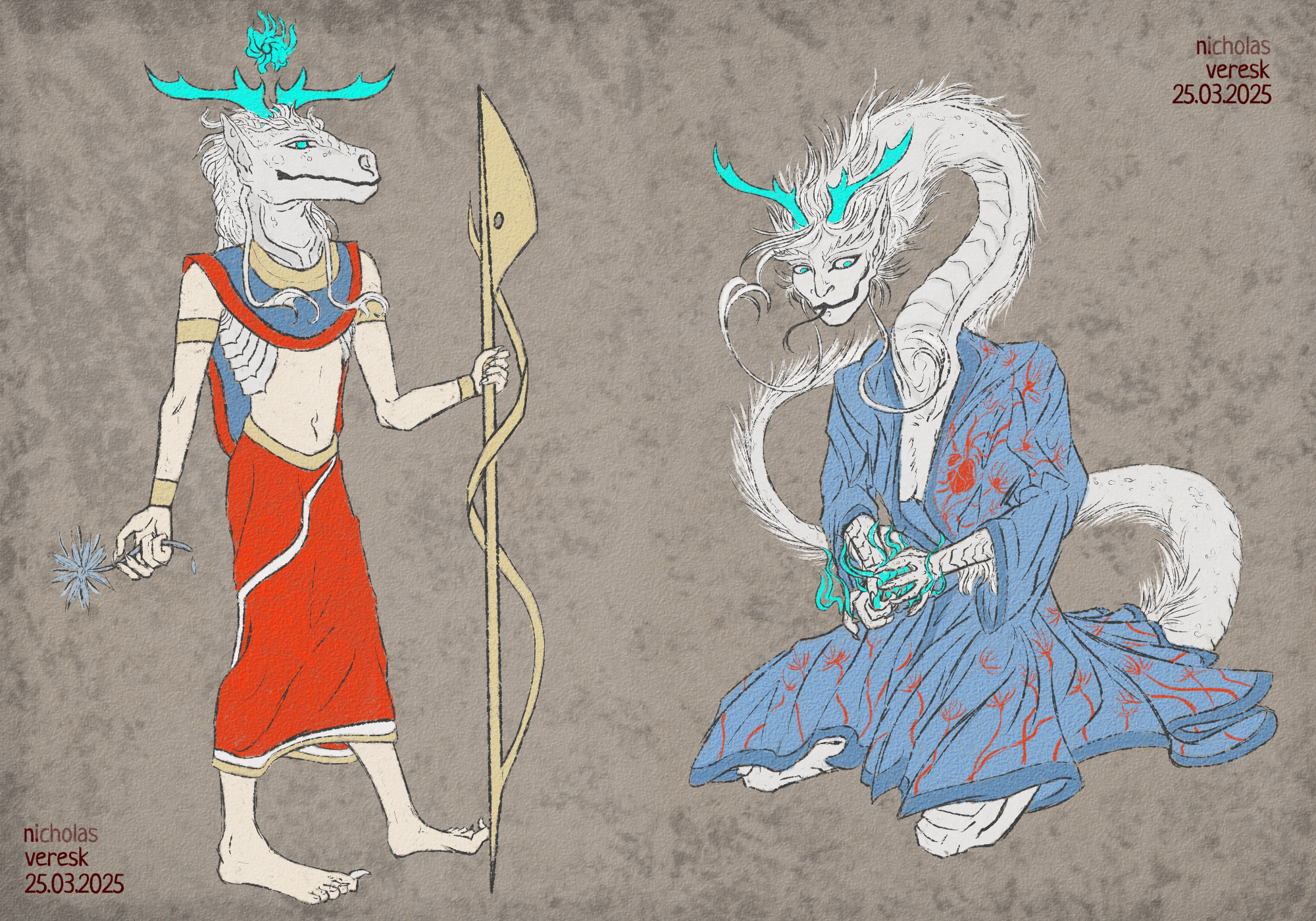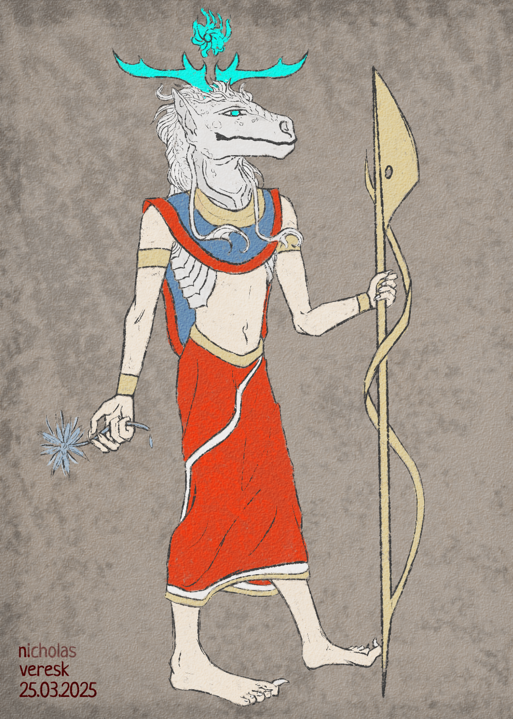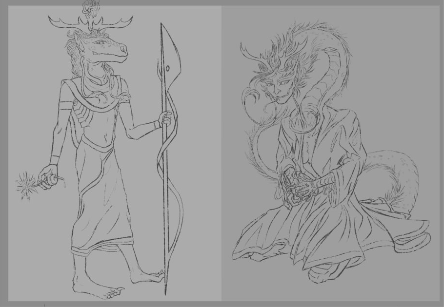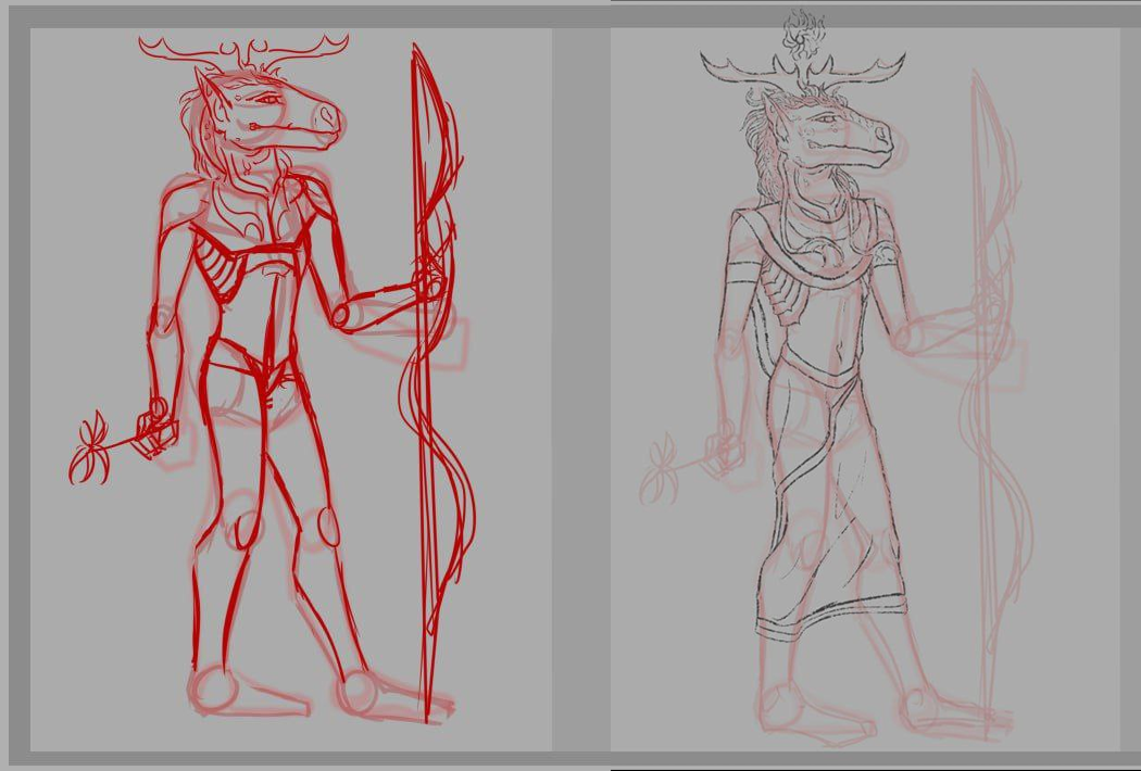 Намечал и рисовал цветок и посох, которые считаю атрибутами, пускай и забытыми (у романе упомянут только цветок). Также была проба одежды, в которой я уже понимаю сильное отхождение от канона. Всё же топлес или с накидкой на плечах изображали мужчин (как понял с анализа референсов (просто список божеств), в которых женщины носили платья). Однако моя чудовищная дама не очень жалует такое, потому пришлось пойти на некие уступки.