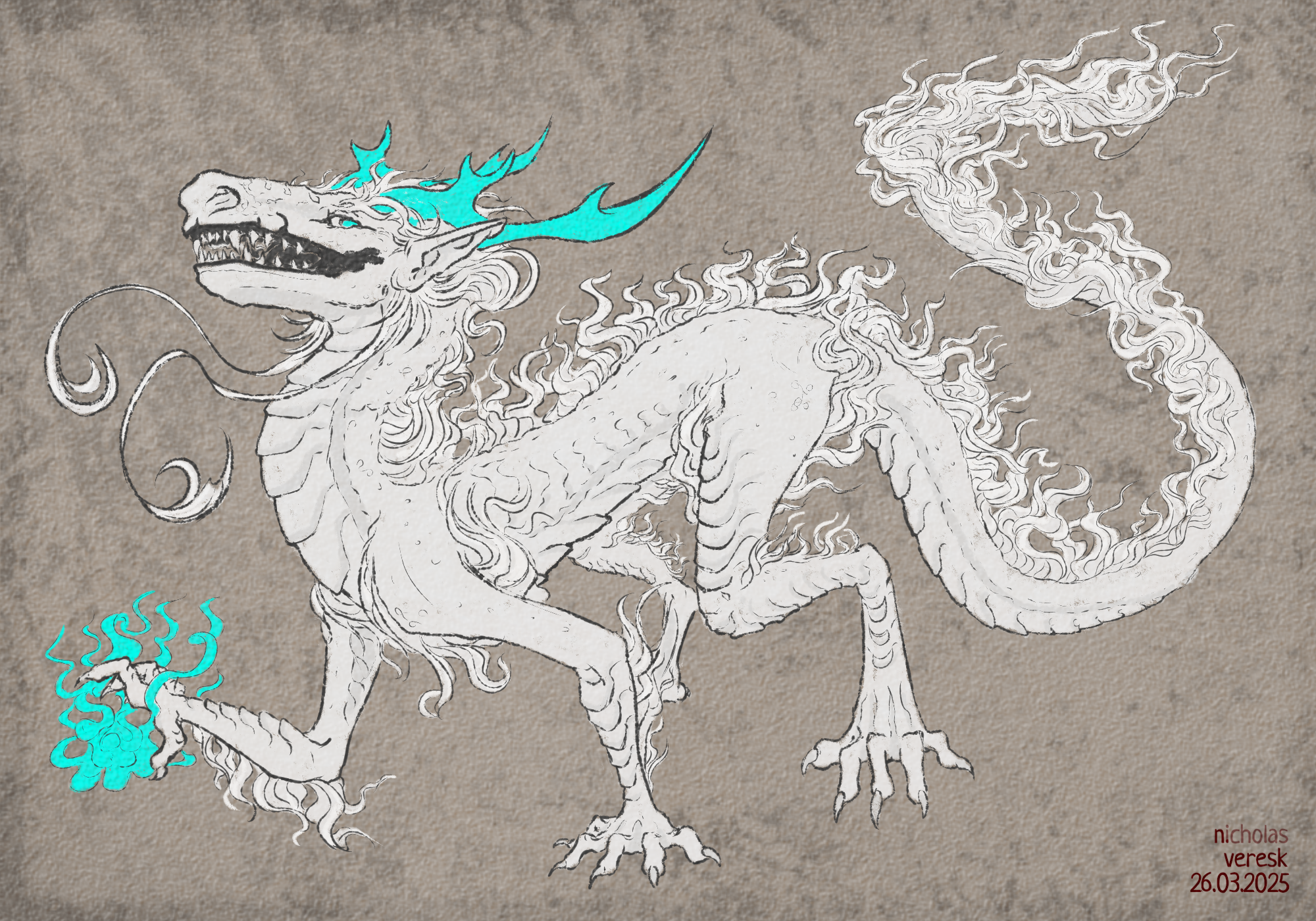 Здесь у меня сохранилось больше этапов проработки (но таких же сжатых). Тяжелее всего было в конце, когда пришлось рисовать хвост. Медитативно, но невыносимо.