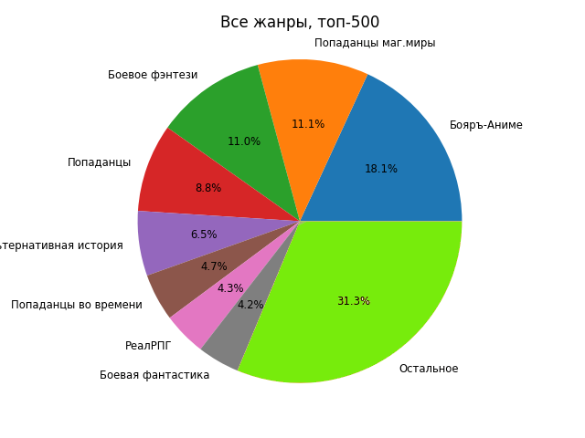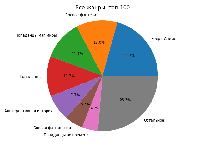 Информация собирается исходя из поисковой выдачи АТ, отсортированной по популярности за месяц: https://author.today/work/genre/all?rp=month&eg=-&fnd=false&page=1 (все фильтры были специально отключены).