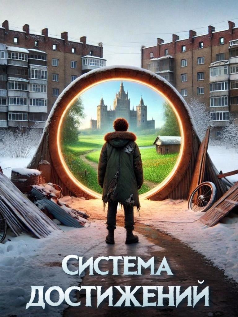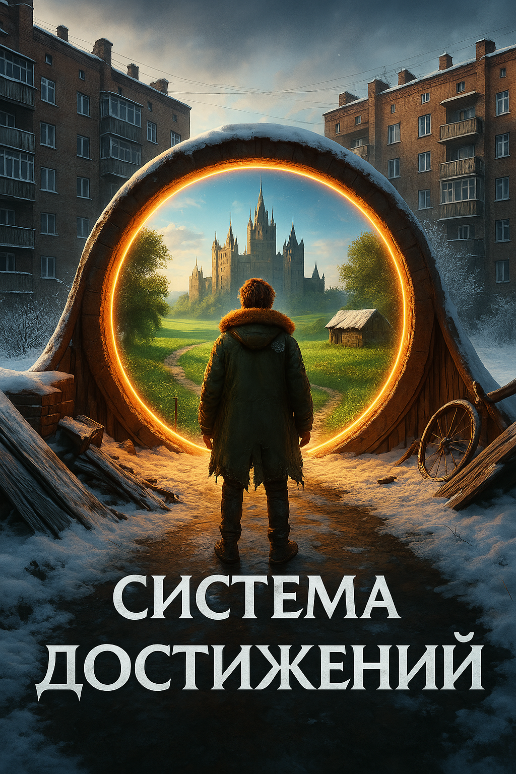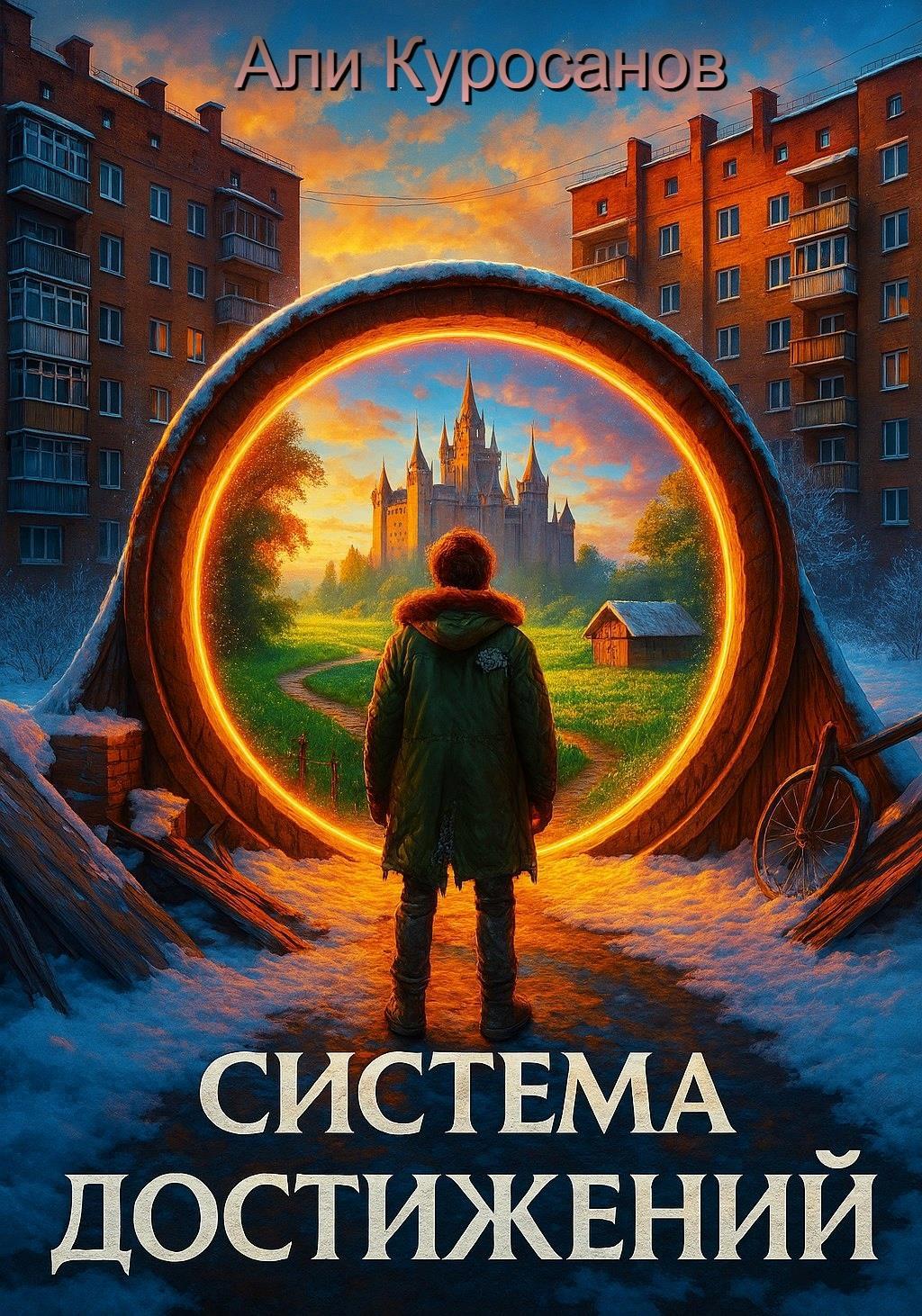 Была у меня значит такая обложка. Загенерила та же нейросеть по моему кривому промту. Я рад, что она смогла хоть что-то понять. Вроде, выглядит неплохо. Только небо какое-то слишком унылое что ли, да и дома не привлекают взгляд. Замок в портале тоже выглядит так себе.