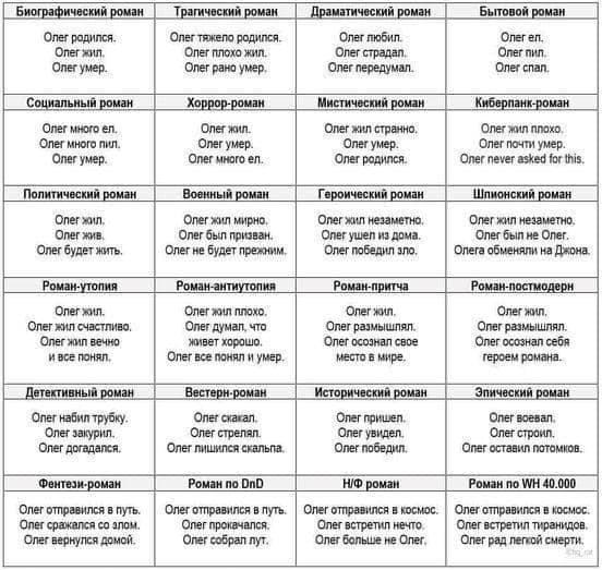Автор: Ирина БоброваДоброе утро! Что-то я спохватилась поздно. Сайт писательский, я типа писатель и ни слова о высокой литературе. Исправляюсь. Попалась на глаза эта вот замечательная таблица. Вот не знаю, где я увидела эту жанровую шпаргалку, возможно даже здесь, на АТ. А возможно где-то в другом месте, но это шедевр" Мне особенно хоррор понравился! Прямо, фильм "Обитель зла" вспомнился и все вампирские опупеи)