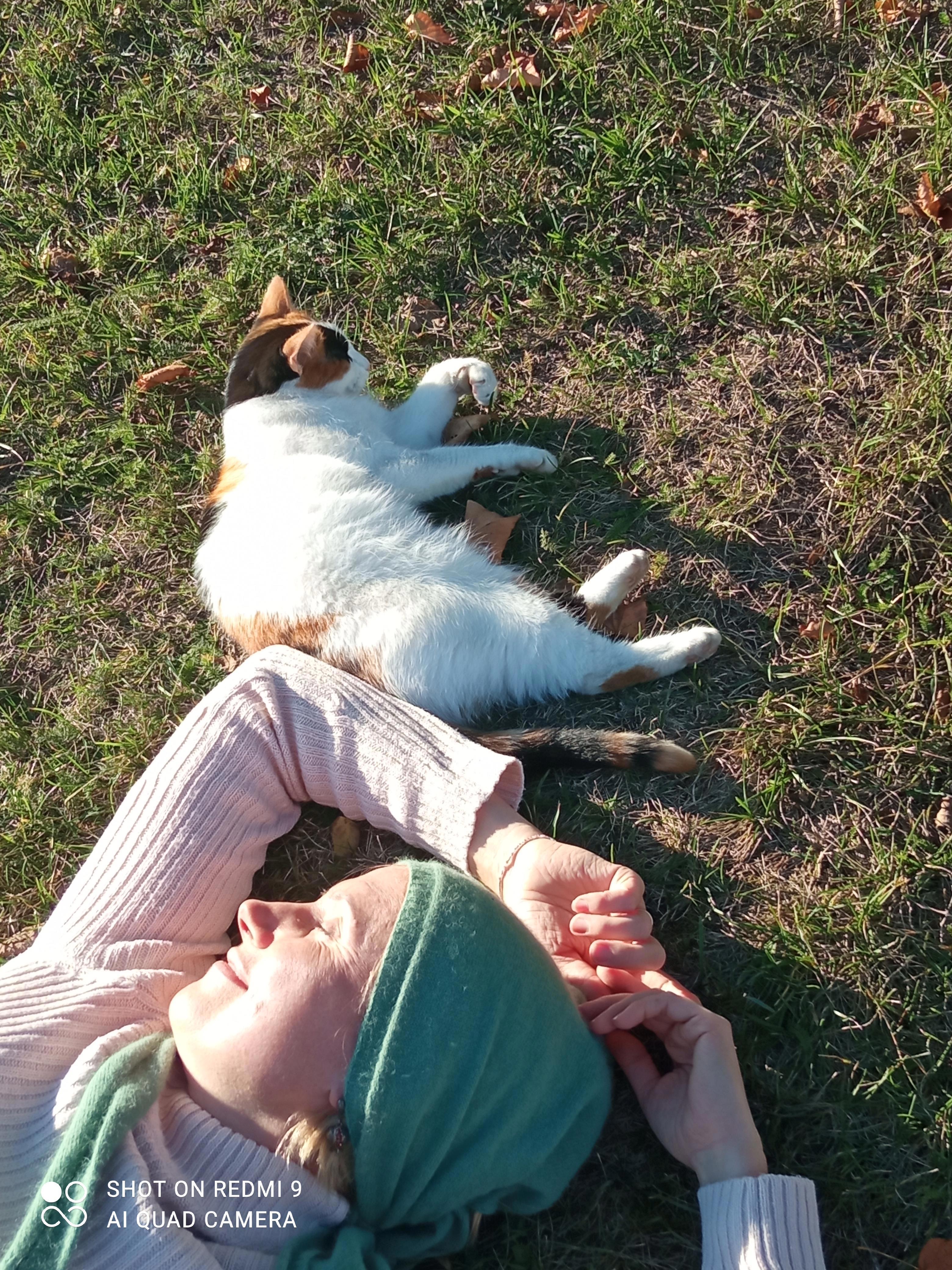Фото: во время паломнической поездки с подругой Натальей к нам уставшим, устроившимся на земле под стеной монастыря - пришла трехцветная местная кошка. Мурлыкала