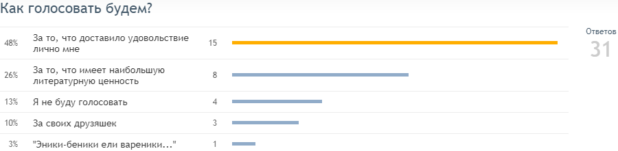 А потом я вспомнил, что читаю намного быстрее "среднего" (был пост-опрос про скорость чтения). Это размышление подстегнуло меня выйти в поле и спросить: Как голосовать будем?