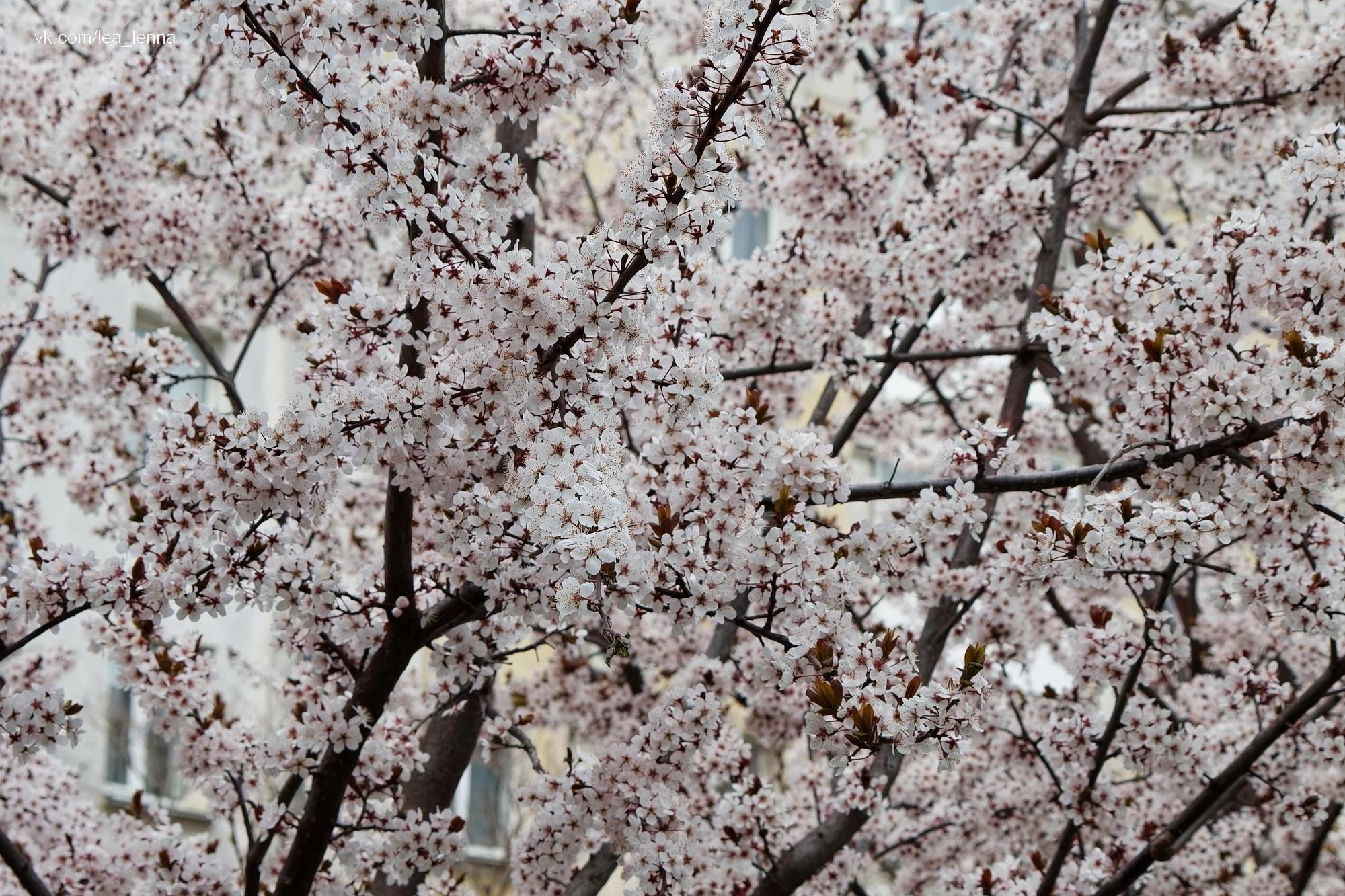 Утешаться я хожу в частный сектор, там почти за каждым забором отчаянно цветут миндальные и абрикосовые деревья. А в городе снимаю например, сливу нигру, но на улицах с машинами ее цветение снимать не очень удобно - на лепестках оседает всякая пыль. Но все равно, пусть будет. И - побольше, побольше!