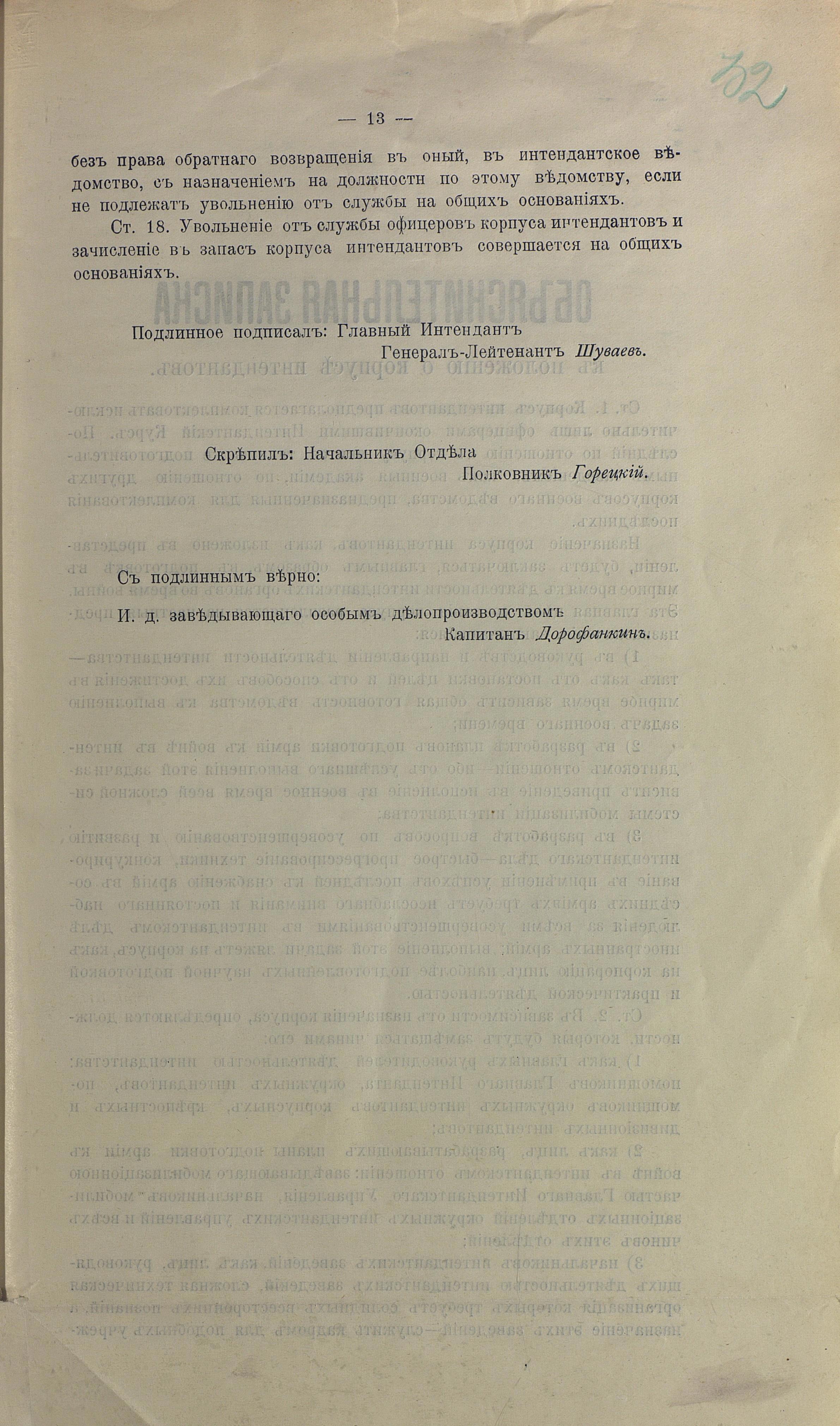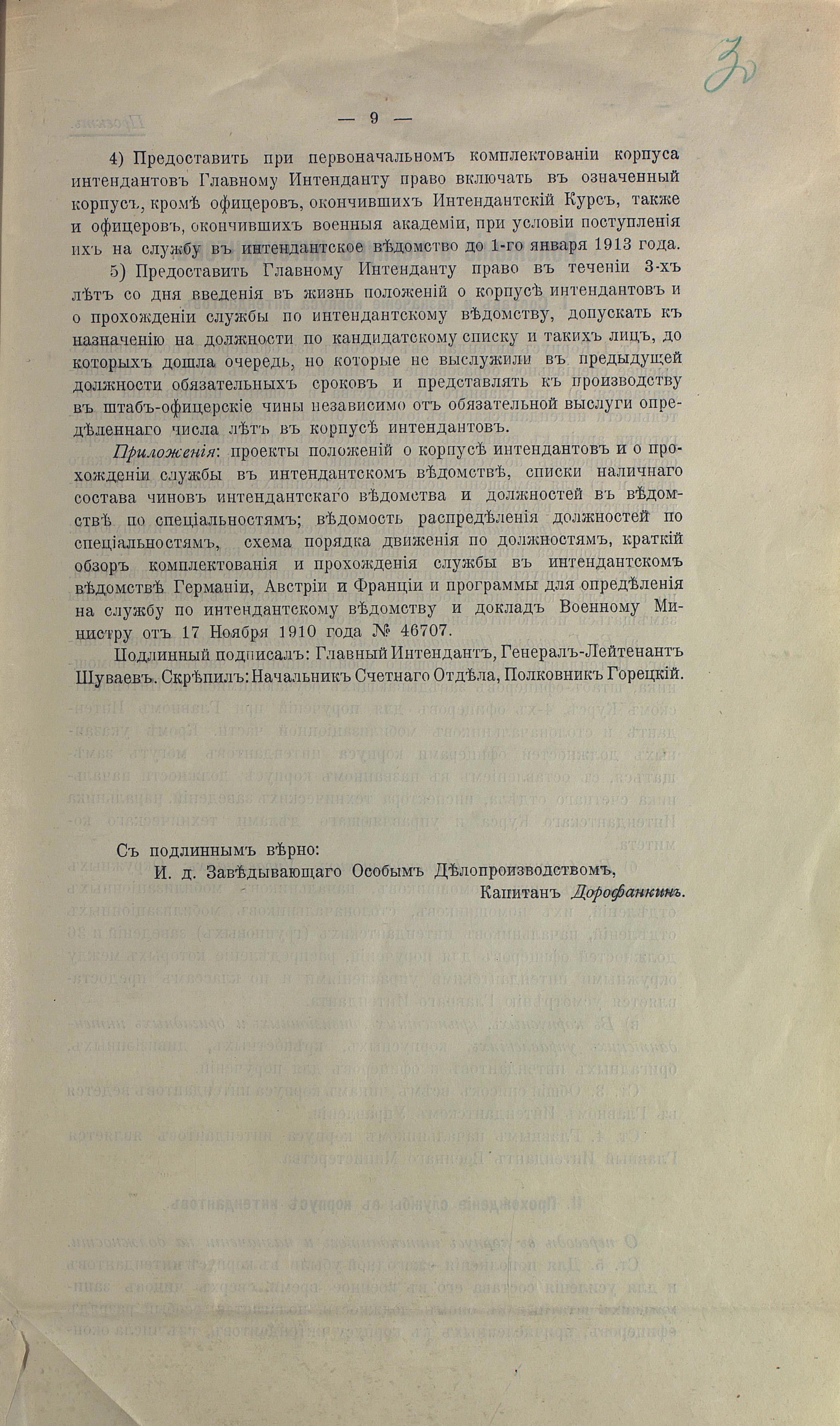 Так удалось ли генералу К.Е. Горецкому создать корпус интендантов? До революции – удалось, но только отчасти. 12 ноября 1911 г., Военный Министр генерал от кавалерии Сухомлинов подписал приказ по Военному ведомству № 541, которым утвердил положение о прохождении службы в интендантском ведомстве.