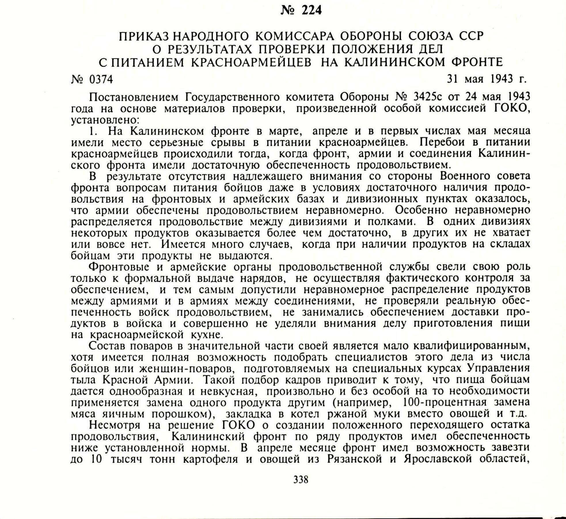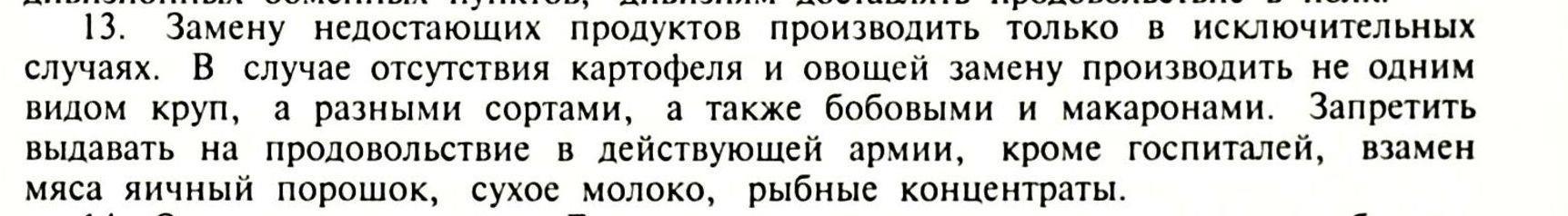 Этим же приказом Сталин приказывает командирам лично следить за питанием бойцов, тыловикам своевременно поставлять нужное количество овощей и мяса.