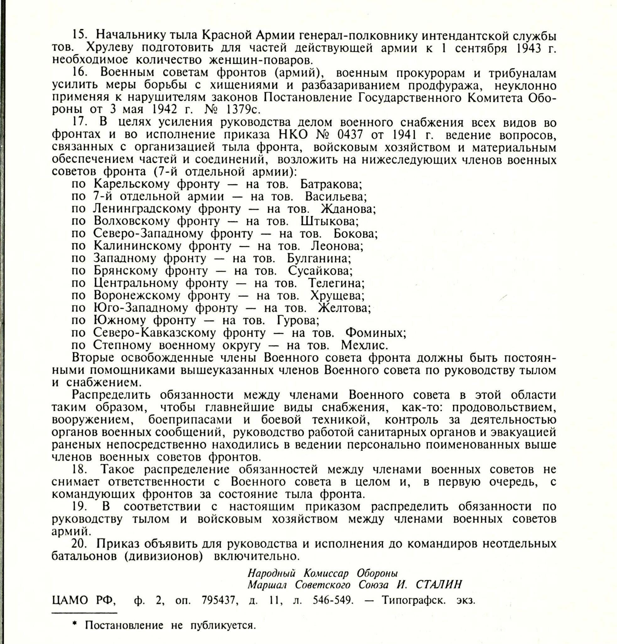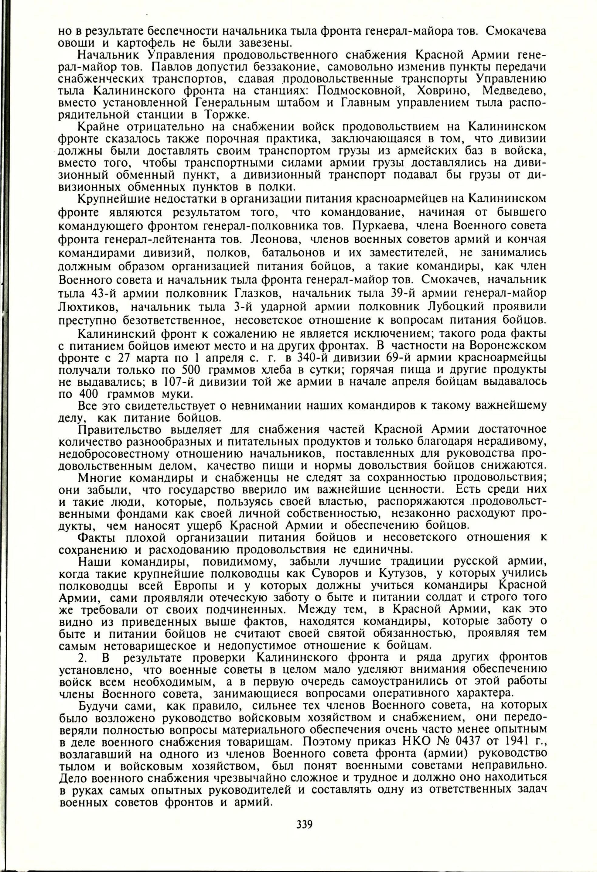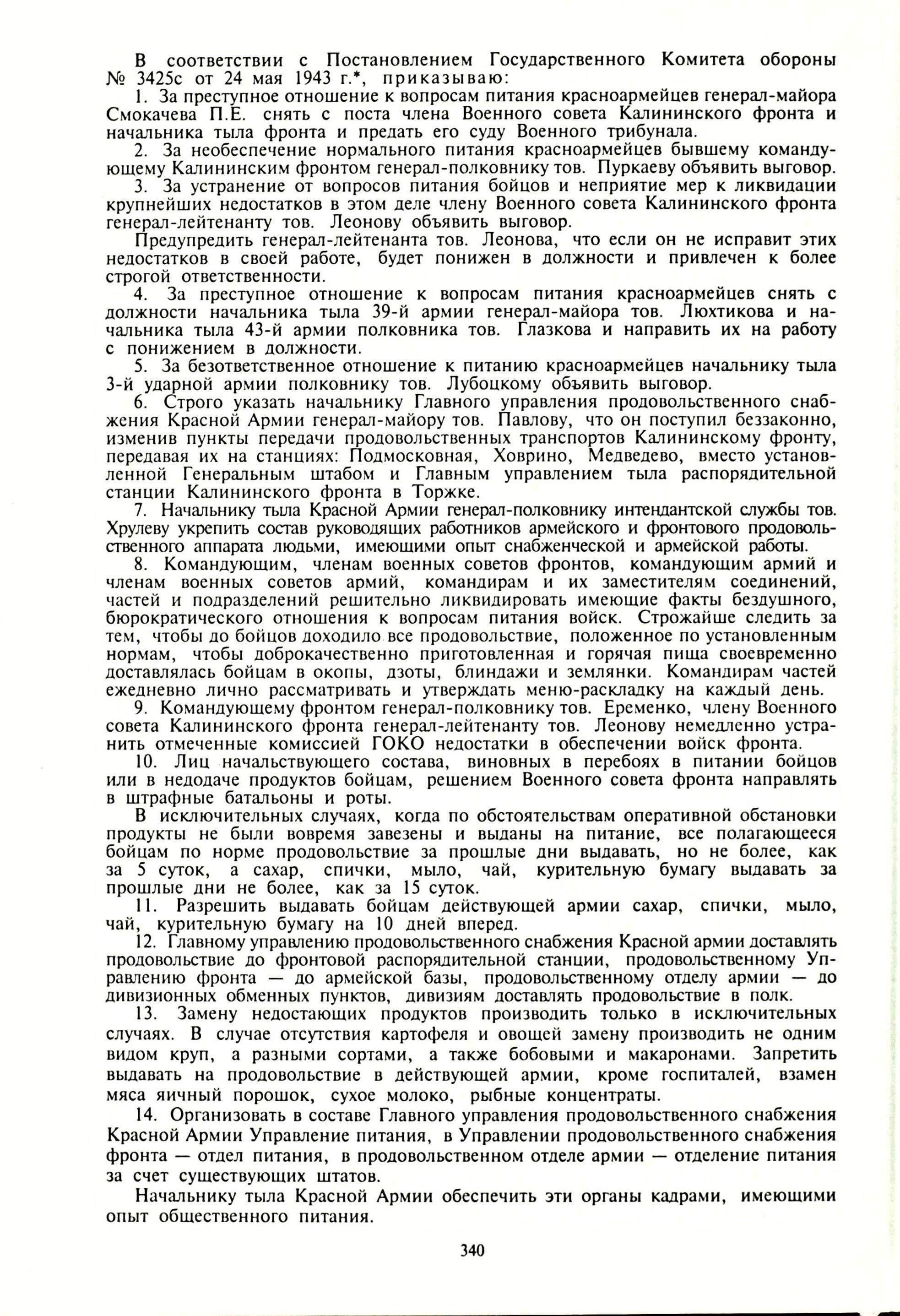 Сталин подробно разбирает выводы комиссии ГКО о питании бойцов. С фамилиями ответственных за безобразие. В приказе упомянуты от выговоров до отдания под трибунал сразу пять генералов!