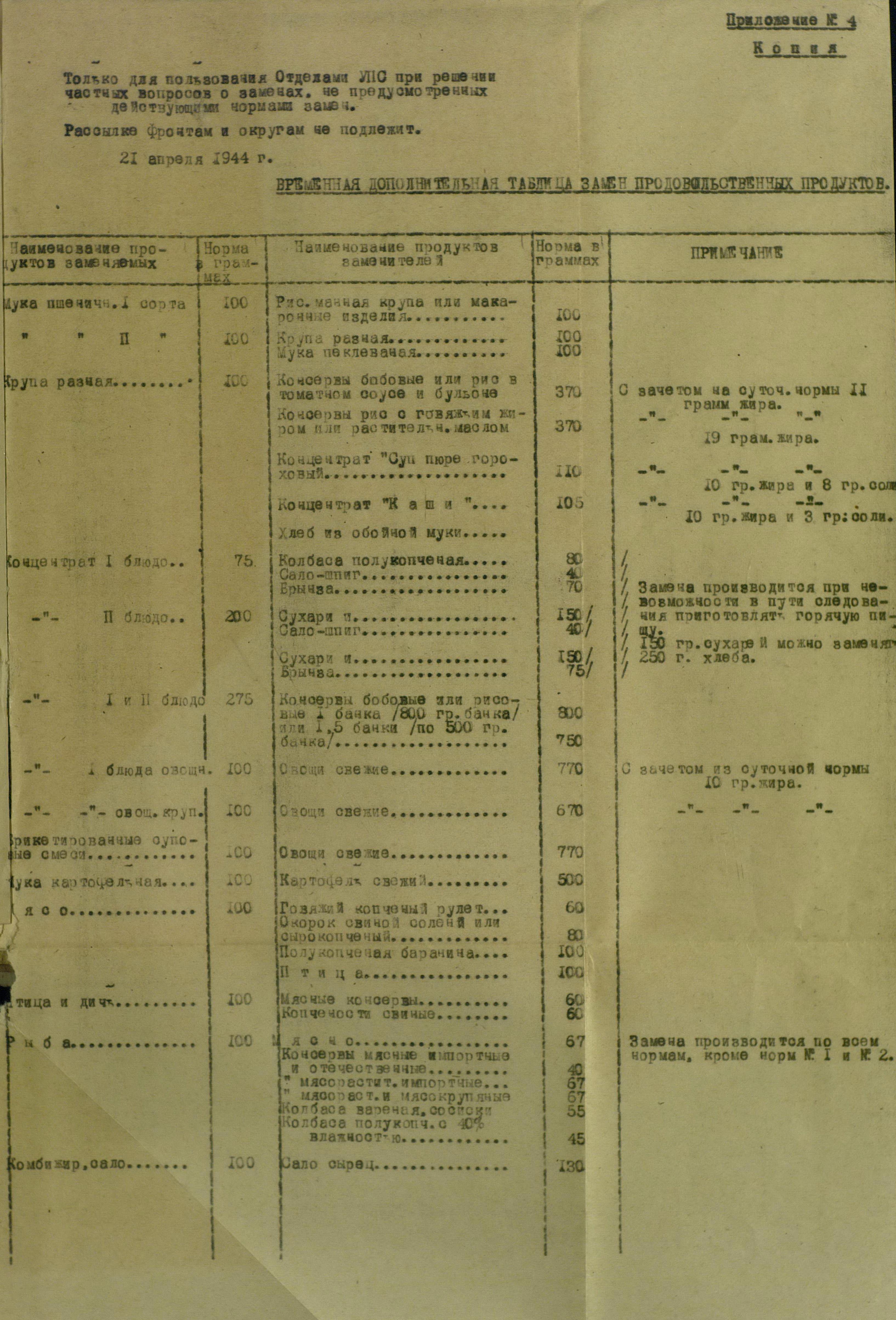 А сама история с нормами замены и в самом деле путанная. Упрпродснаб раз ра разом разрабатывал изменения, но товарищ И.В. Сталин с завидным упорством их не утверждал. В результате, на снабжении появлялись продукты, в том числе и импортные, которые законно ни выдать, ни заменить. Ну а если посмотреть нормы замены госпитального пайка, то станет очевидным, что одним ячным порошком продовольственная служба не ограничилась.