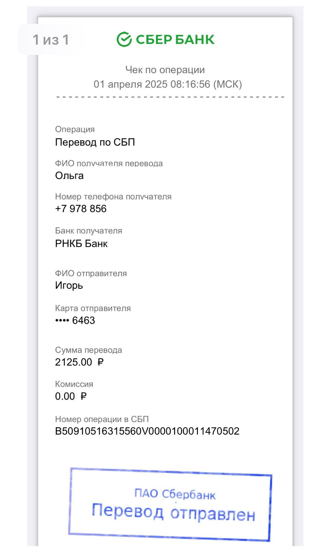 И вот чек о переводу этой сумме Ольге Ининой (одному из организаторов конкурса)