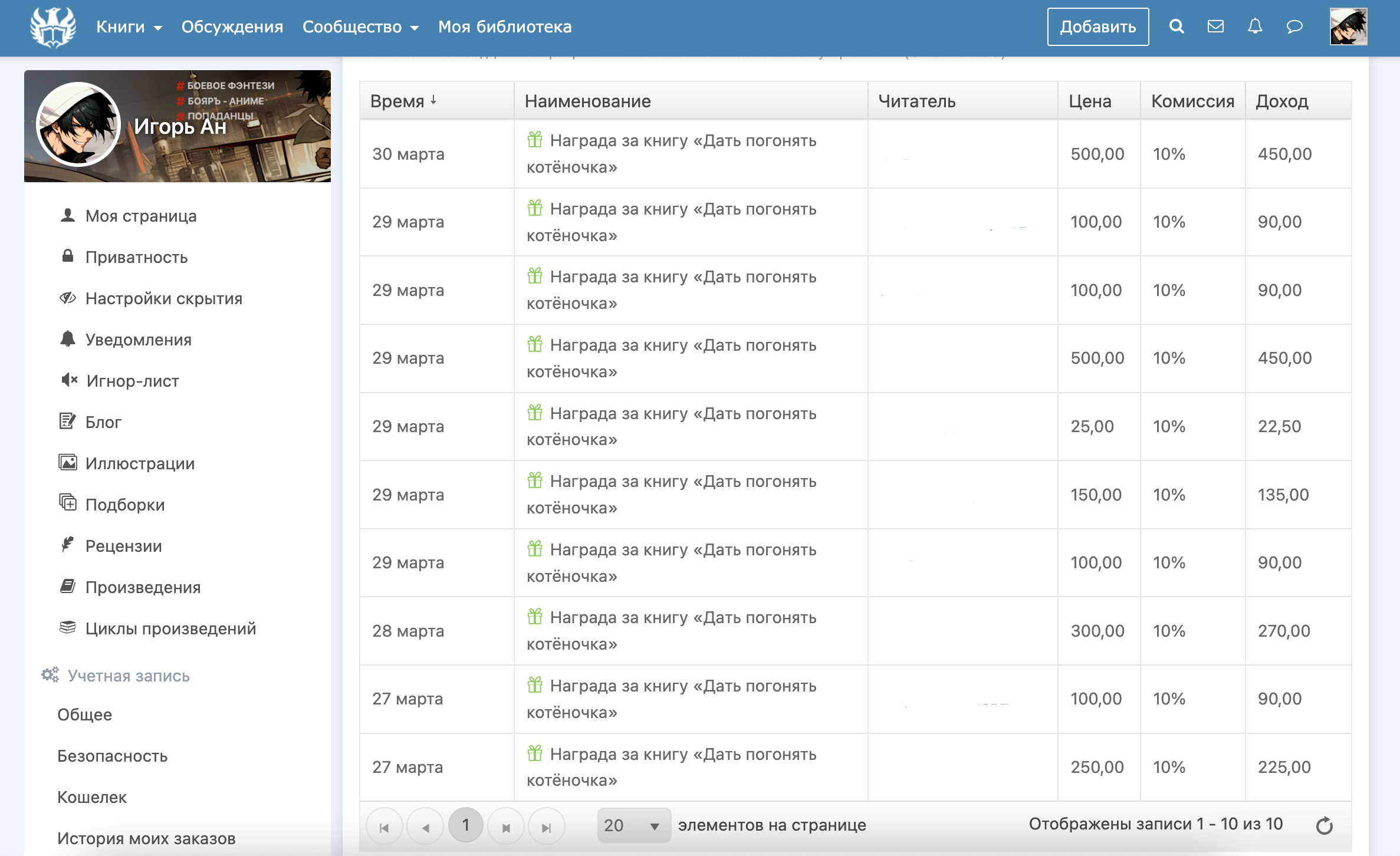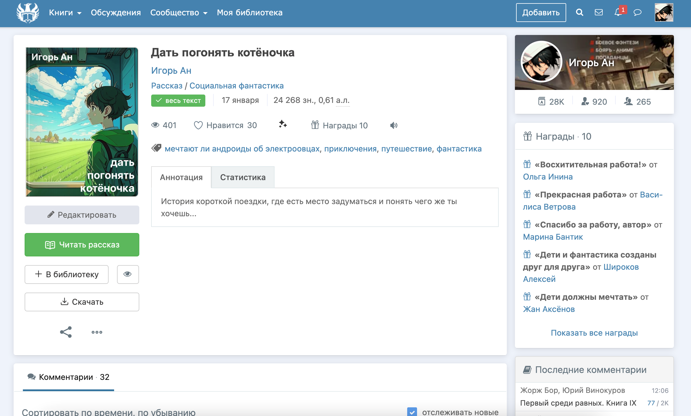 Тут видно, что наград у рассказа стало 10 (было 0)