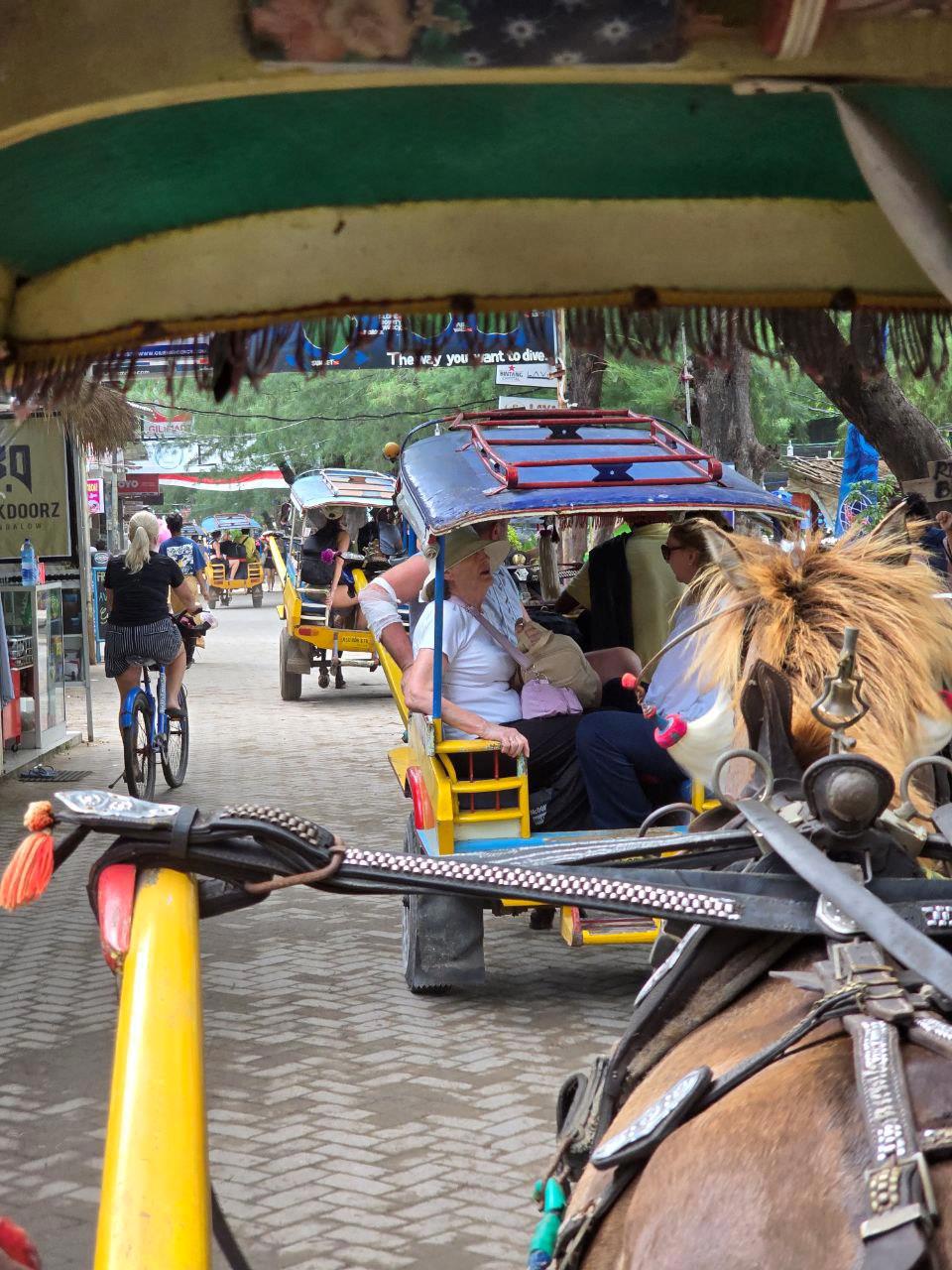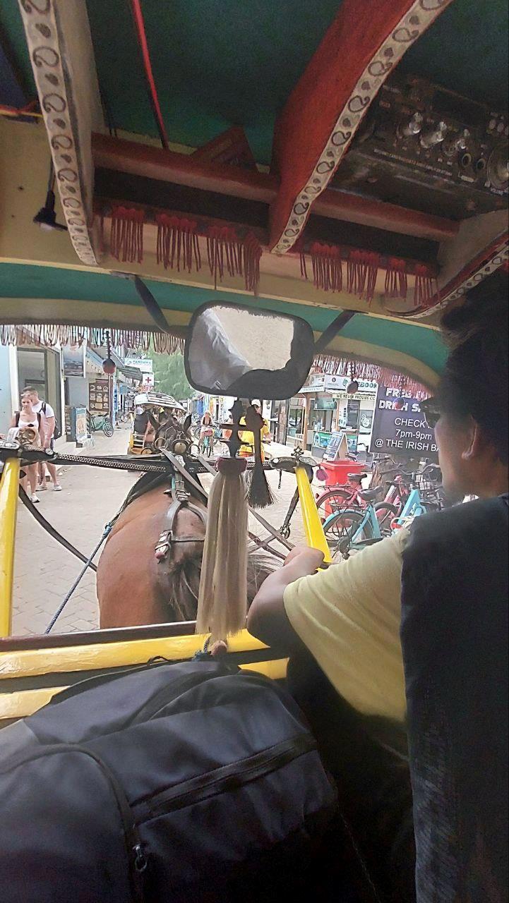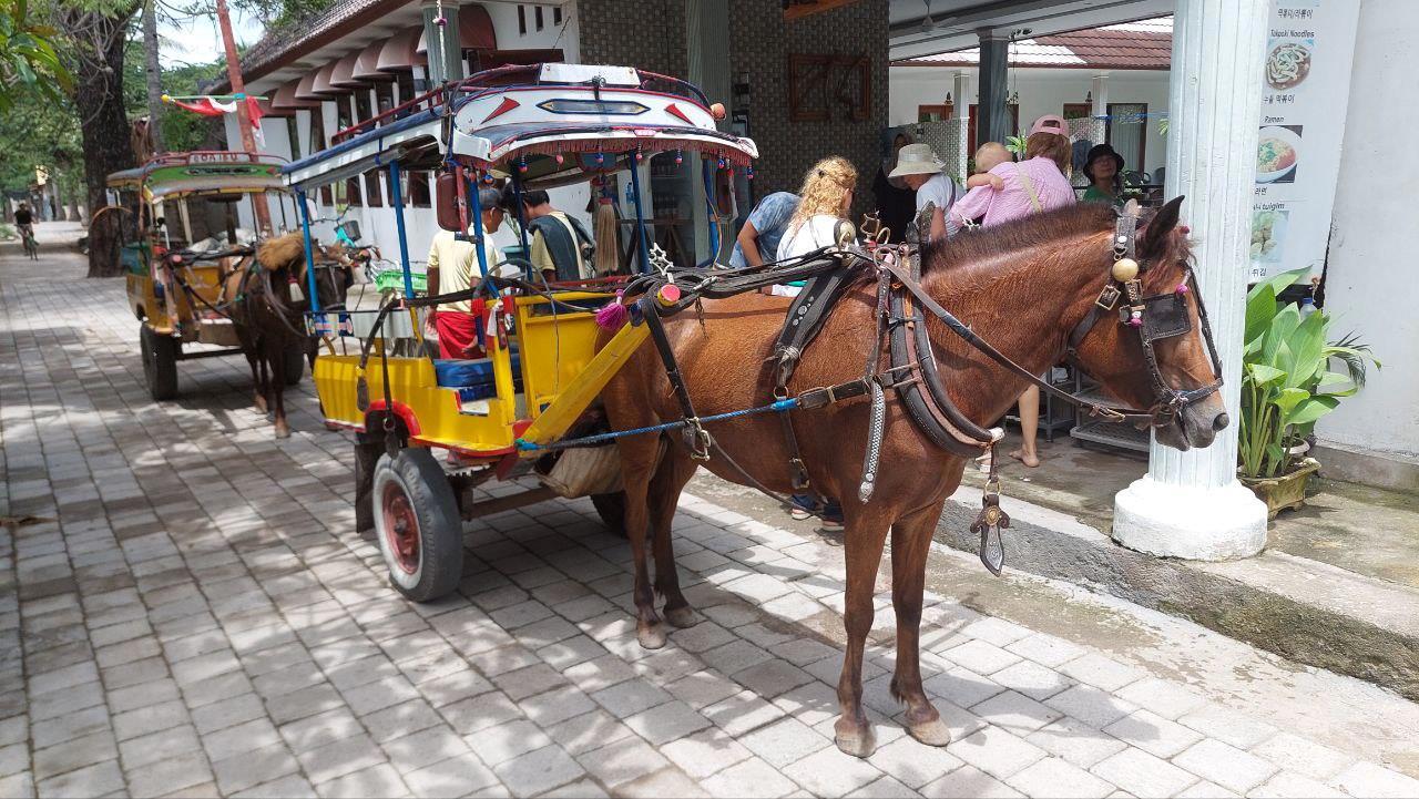 Старший внук бегает вокруг, выспрашивая, когда же мы возьмём конные повозки для доставки в отель. Дело в том, что на этом острове запрещён транспорт на ДВС. Так что ножками, велосипед, электроскутер и главная тягловая сила - лошади. У мну в голове образ европейского фаэтона с лошадкой.