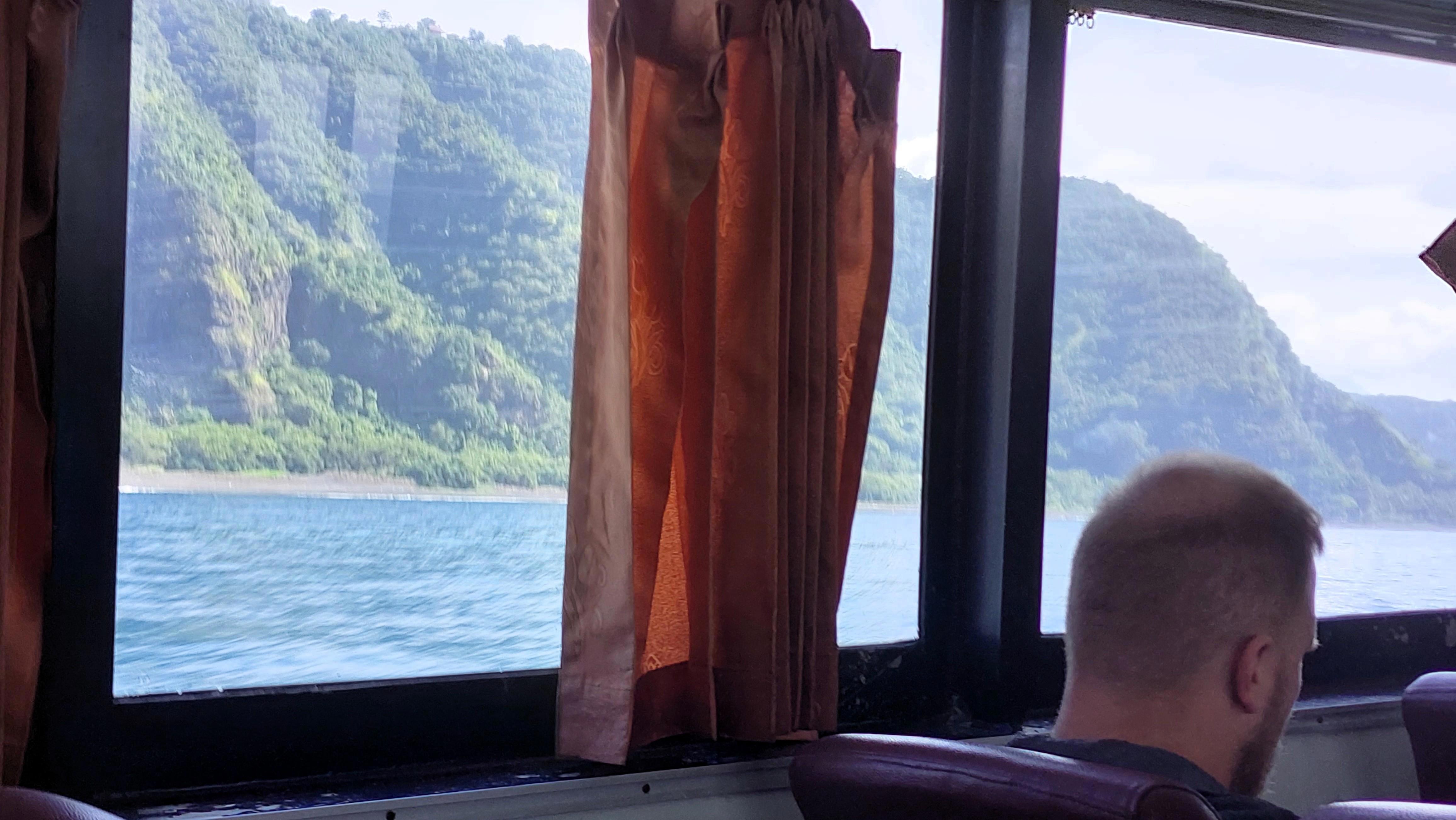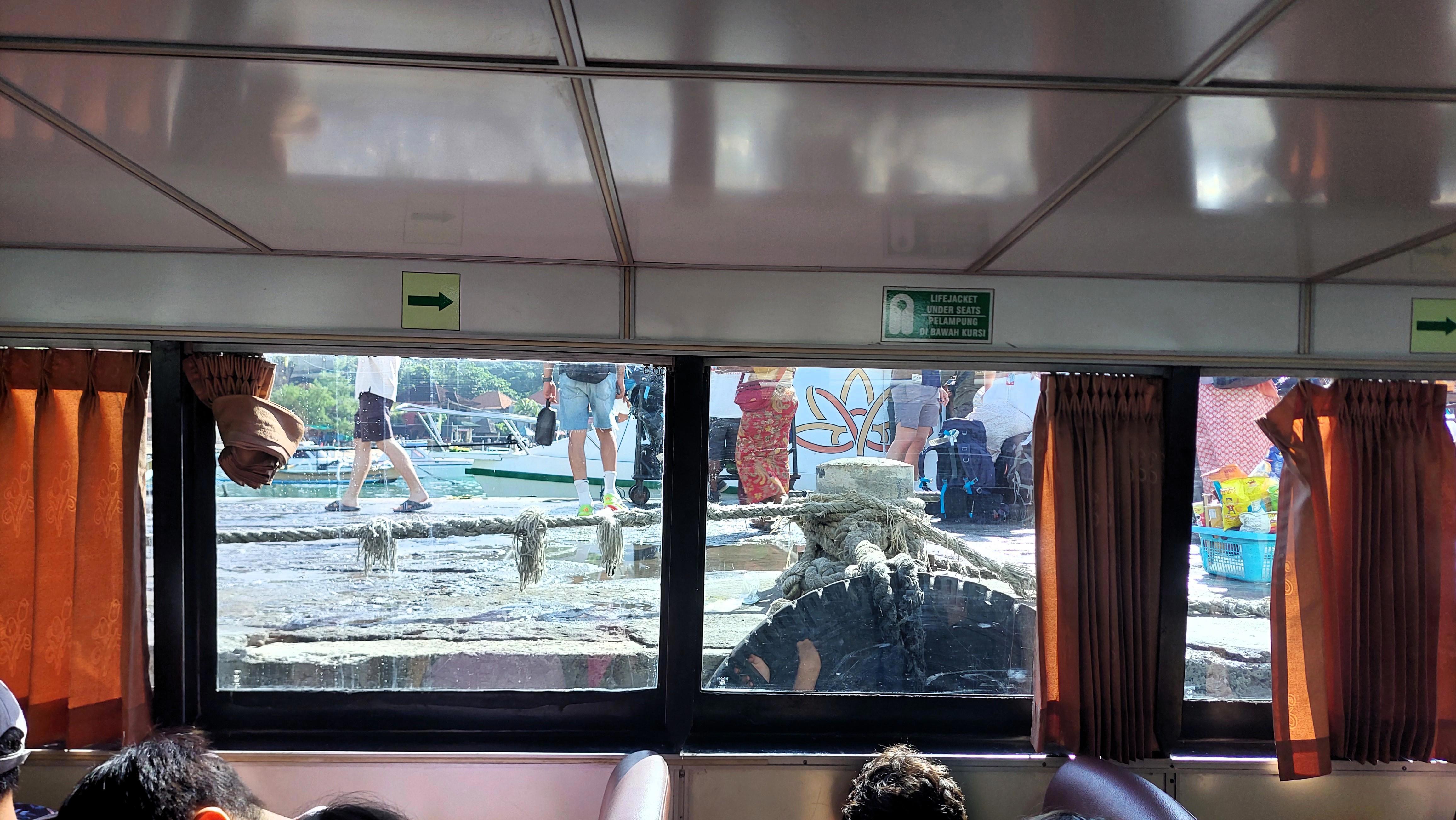 Пирс, толпа у входа на корабль. Не знаю к какому классу он относиться. Один из членов команды что-то настойчиво от меня просит, а-а, отдать чемодан, да пожалуйста. Большие вещи грузятся на верхнею палубу. Перед входом у нас попросили бейджики, полученные на регистрации. Пассажирская палуба поделена на три салона, почти все места заняты, кое как распределились по два, три человека в разных местах. Распихали рюкзаки, тесновато. Палуба разделена по центру проходом, по сторонам которого по четыре кресла в ряду итого восемь мест в одну линию. Посадка корабля низкая. Точнее пассажирская палуба, в окна видны ноги стоящих на пирсе людей.