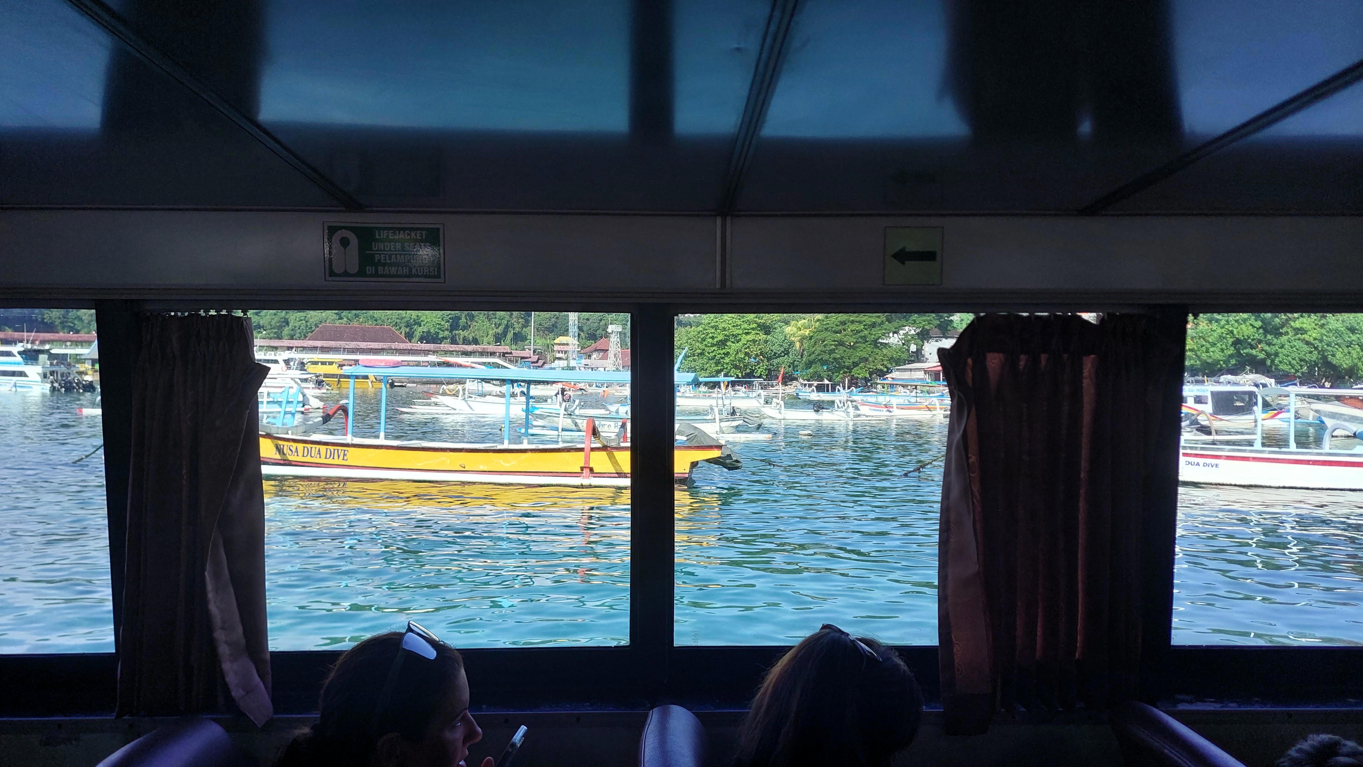 Подъехали к порту, время тютелька в тютельку, но впереди пробка. Место регистрации выглядит не презентабельно. Ирма убежала к регистрационной стойке. Саша бегает, ищет место для парковки на четыре дня. Оказалось, зря выгружали вещи, после регистрации нужно проехать дальше к пристаням. Спешим. Не складывается детская коляска. Закидываем всё обратно в машину. Стоянка у причала, к нашей радости, оказалась свободной. Выгрузились. Саша паркует машину у бордюра, но не тут-то было, от стоящего рядом ларькя выбежал тётка, махая руками, чтобы отвалили в сторону, подошёл мужчина, вежлево попросил переставить транспорт, вроде здесь будут собирать фигуру Ого-ого для парада. Ну ок, паркуется в другом месте, оплачиваем стоянку, идём ко входу на погрузку, по пути отбиваясь от назойливых продавцов солнцезащитных очков и другой мелочёвки. Чемодан скачет по выбоинам, асфальт - одно название. На притолоке расселись ожидающие корабля туристы. Тип характерный, расслабленный взгляд, наколки, серьги, большой рюкзак. Встречаются и такие, как мы. Семейные. Все явно покидают о. Бали в преддверие дня тишины.