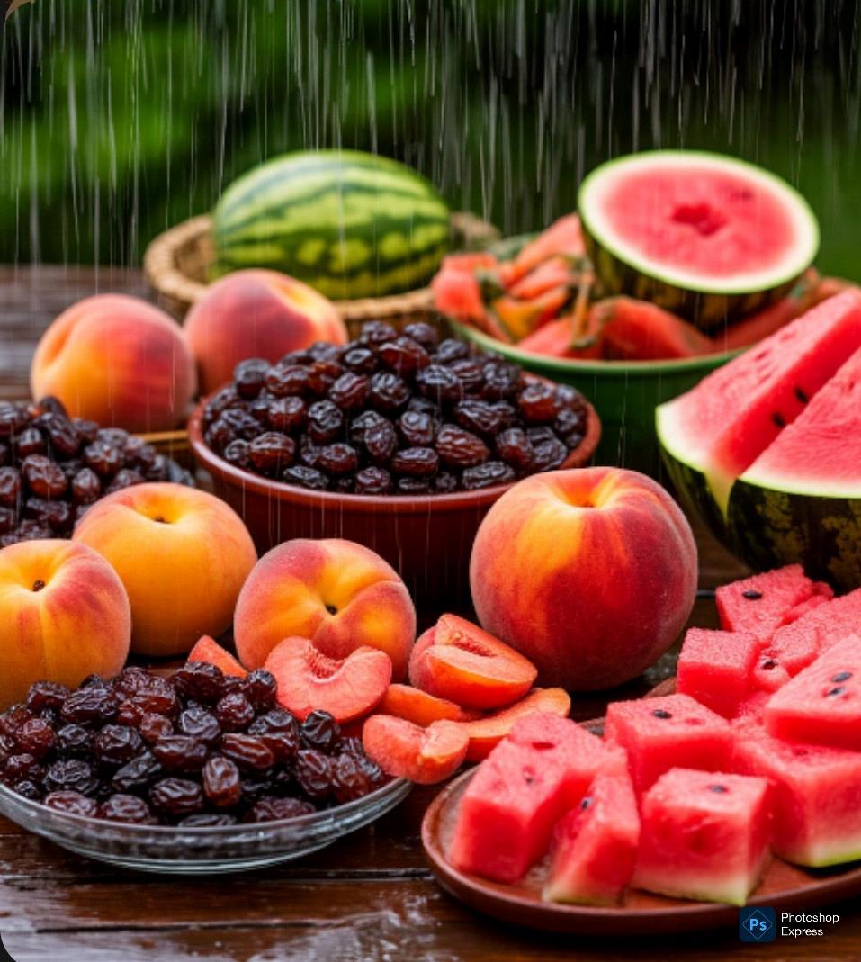 Главные герои : изюм, персик и арбуз.