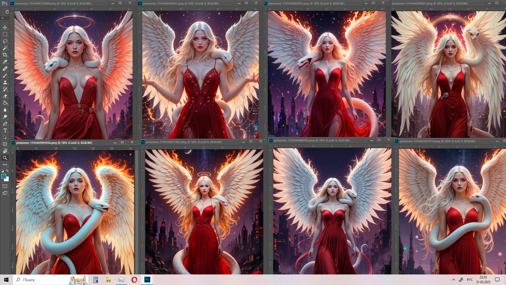 Я приступила к созданию своего варианта. Честно скажу, далось тяжело. Я создала… не знаю, больше 30 изображений точно. Может, даже 50. Вначале в такой позе, как на картинке, затем переделала немного. Нити нейросеть рисовала плохо, очень плохо. Змее периодически приделывала вторую голову, ну да ладно. В итоге я из пачки изображений от финального (ха-ха!) варианта промта удалила половину. Потом половину от этой половины скачала. Затем открыла ФШ, загрузила всё и стала закрывать те окна, где что-то было не так. В итоге получилась такая картина: