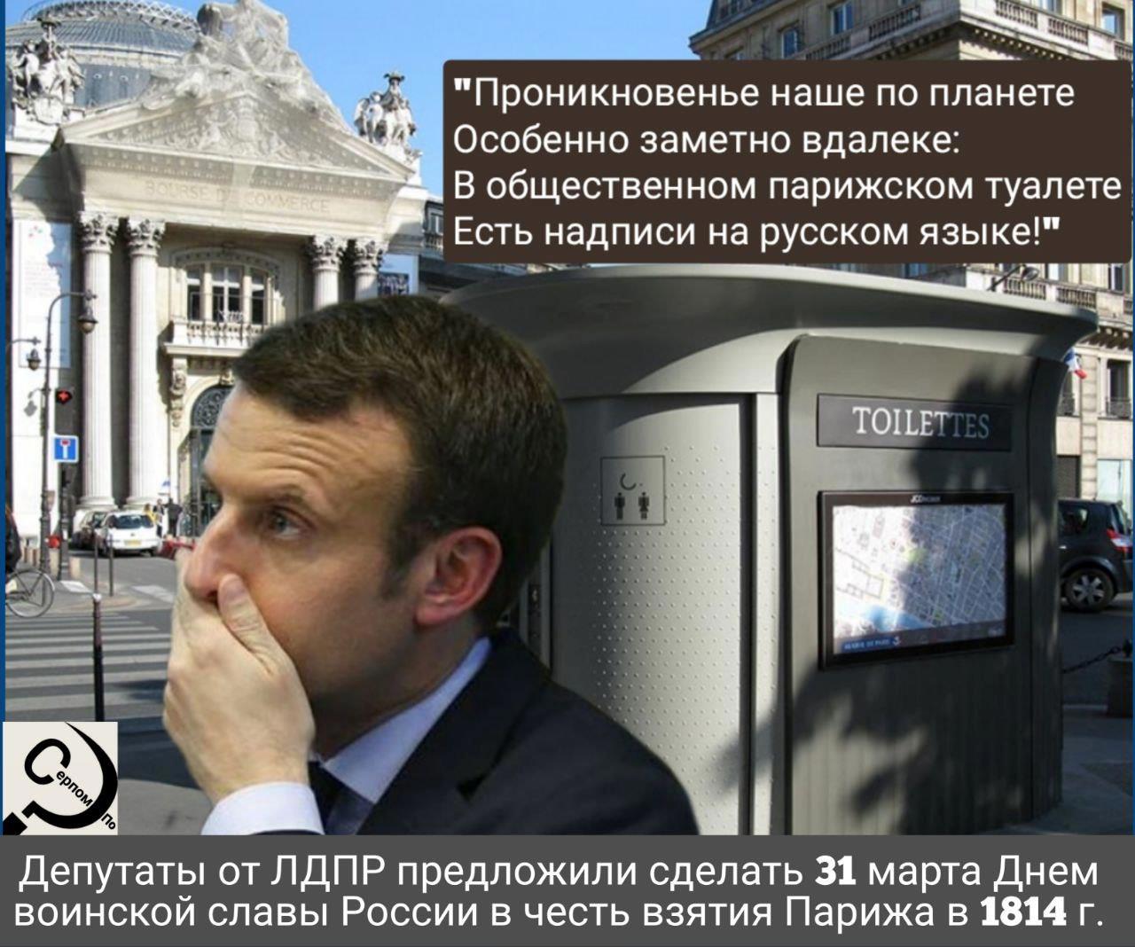Парад победы войск Российской империи в Париже в 1814 году и стремление французов к реваншу послужили единственной причиной участия Франции в Крымской войне! Так-что не стоит расписывать парижские туалеты русскими надписями! Французы могут обидеться! Как говорится, даже самой миролюбивой собаке не стоит наступать на хвост!