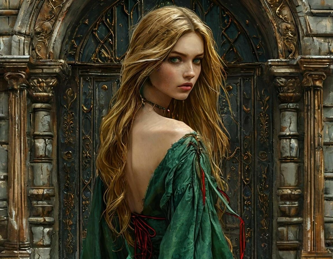 Портниха постаралась на славу, платье на девушке выглядело великолепно. Ткань в руках ощущалась настолько легкой, что напоминала шифон, но и совершенно не прозрачной глубокого темно-зеленого окраса. Этот цвет настолько подходил к ее глазам, что они засияли на лице как два огромных зеленых изумруда в обрамлении длинных черных ресниц. Глухой ворот спереди начинался от самой шеи, не открывая ничего. Верхняя часть платья села ровно по ее фигуре, темным цветом подчеркивая ее, и без того, стройную талию.