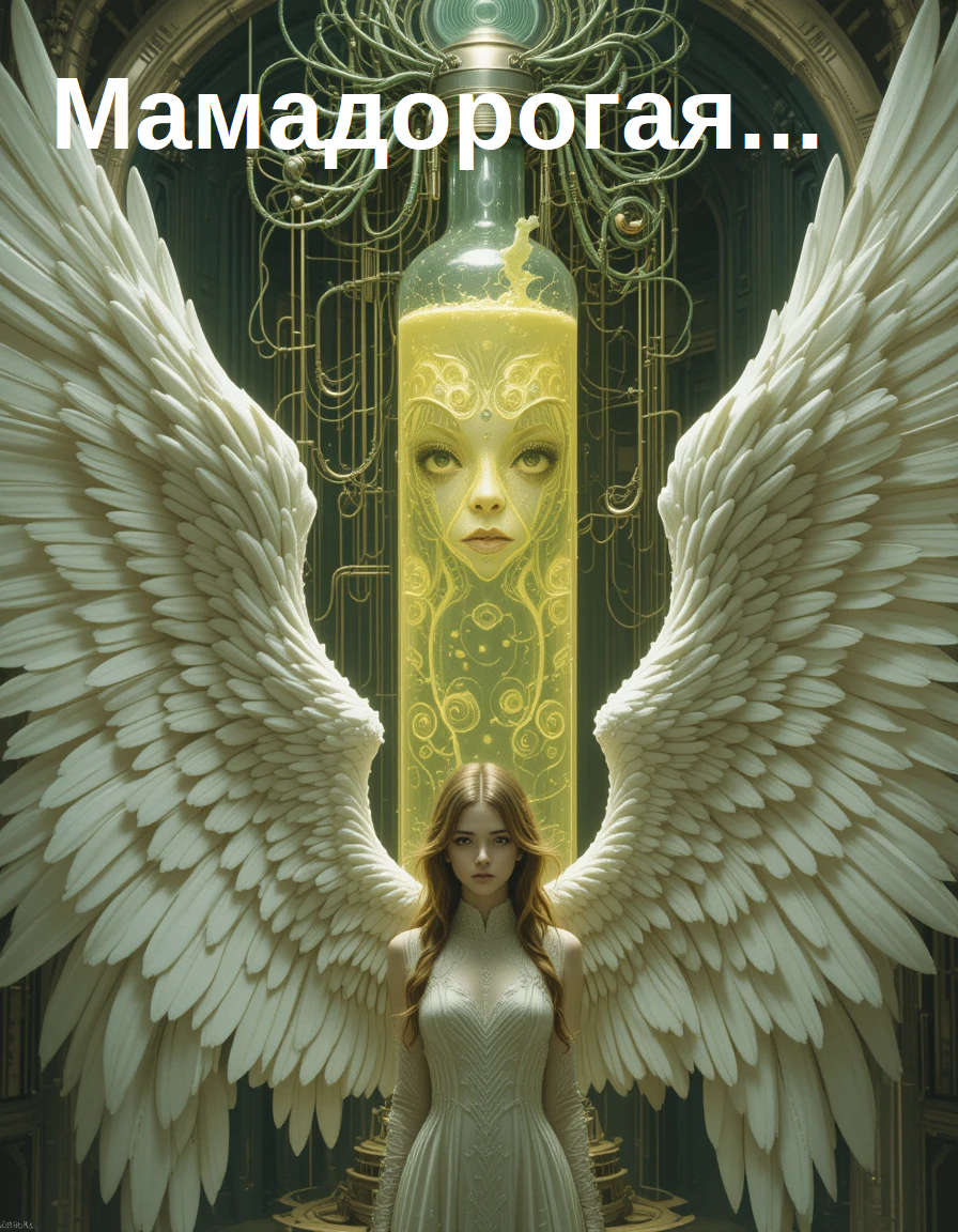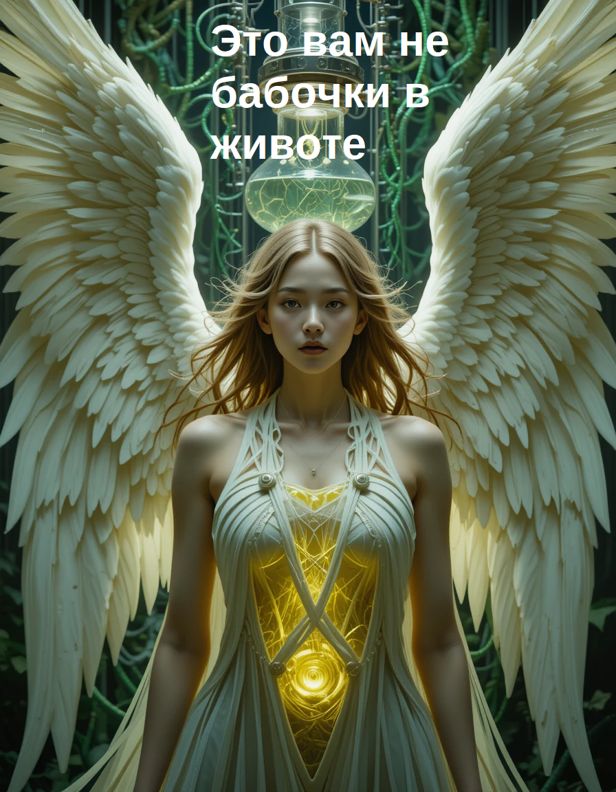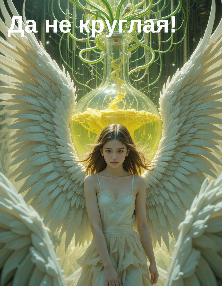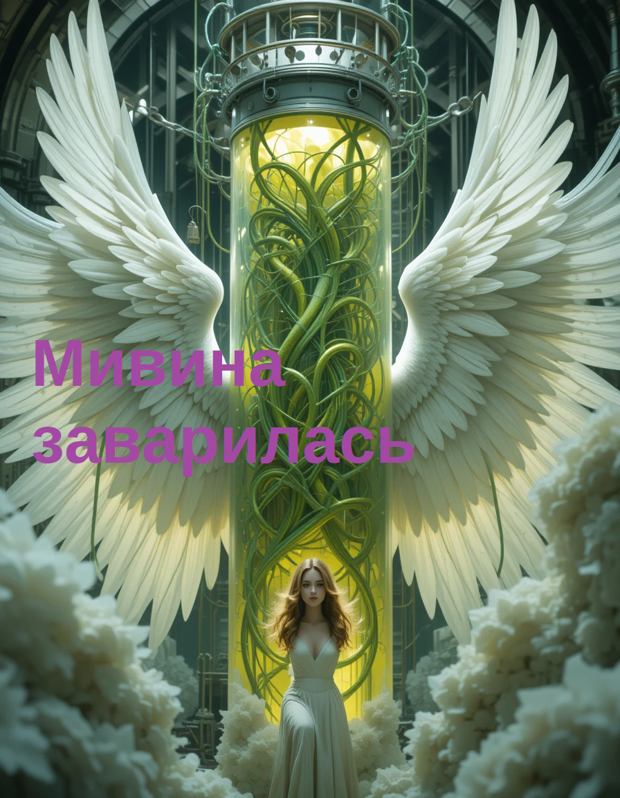 И вот я начала делать обложку. Оказалось непросто объяснить нейросети, что такое большая стеклянная колба, почему она не круглая. Потом сеточка упорно засовывала провода внутрь. Затем не хотела понимать, как закутать героиню в крылья. А когда я просила закутать её в простыню на манер тоги — рисовала на ней кружавчики!
