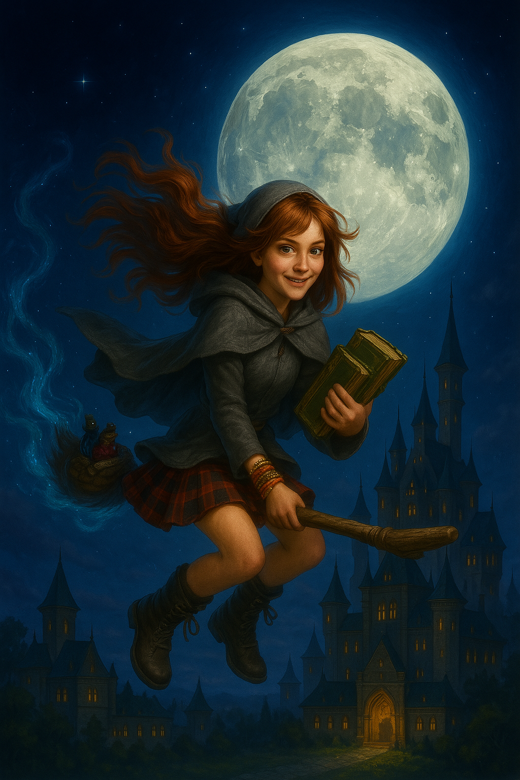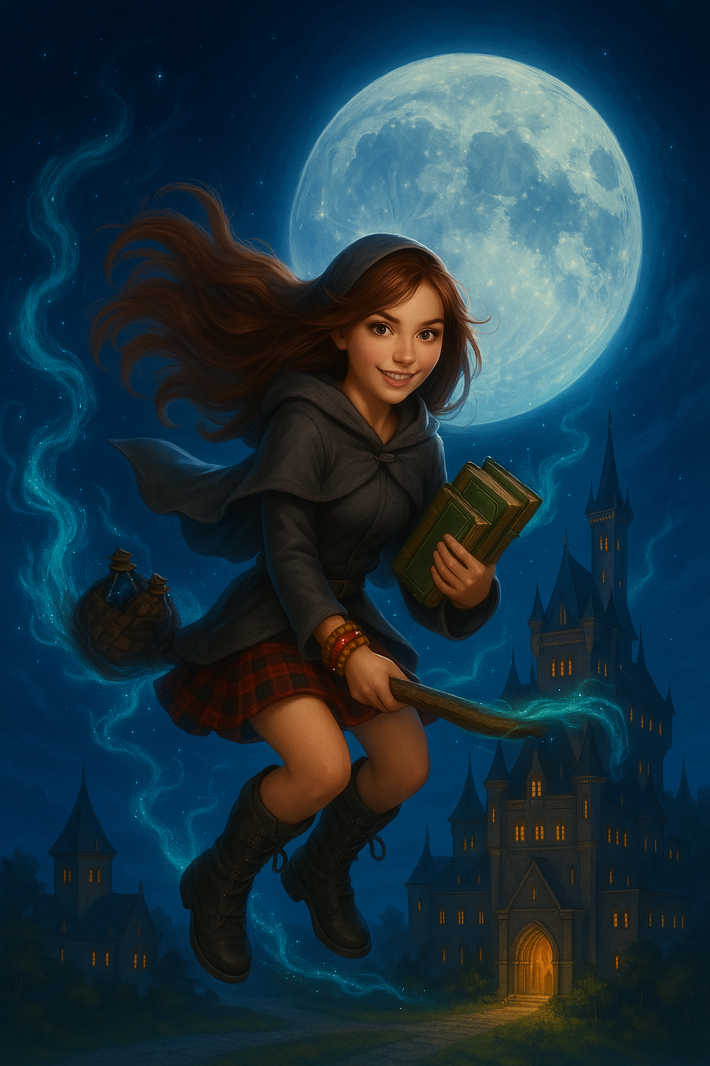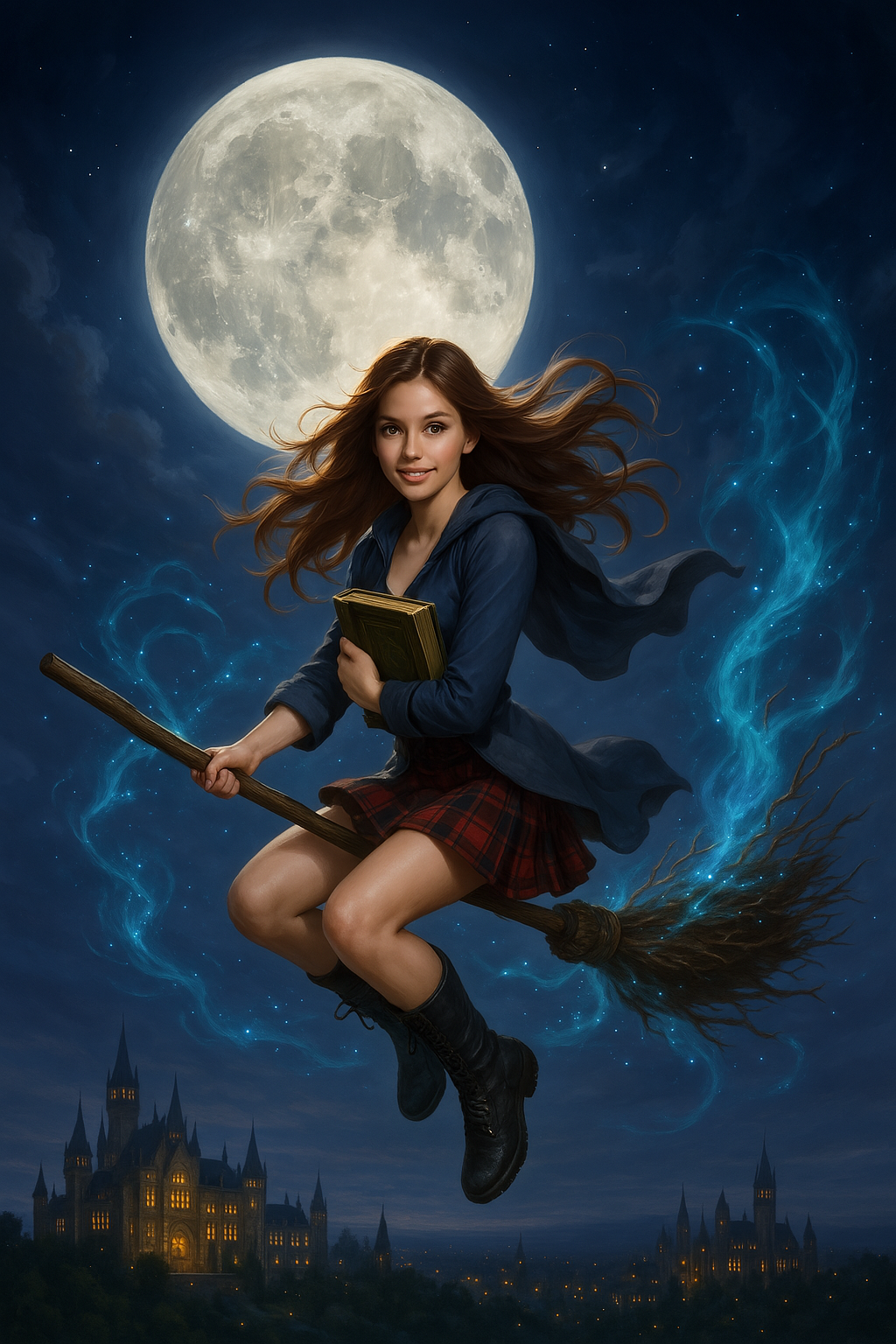 Запрос на исправление: замени на более красивую девушку, сделай четкие цвета и чуть больше магии и движения. Подправь метлу.
