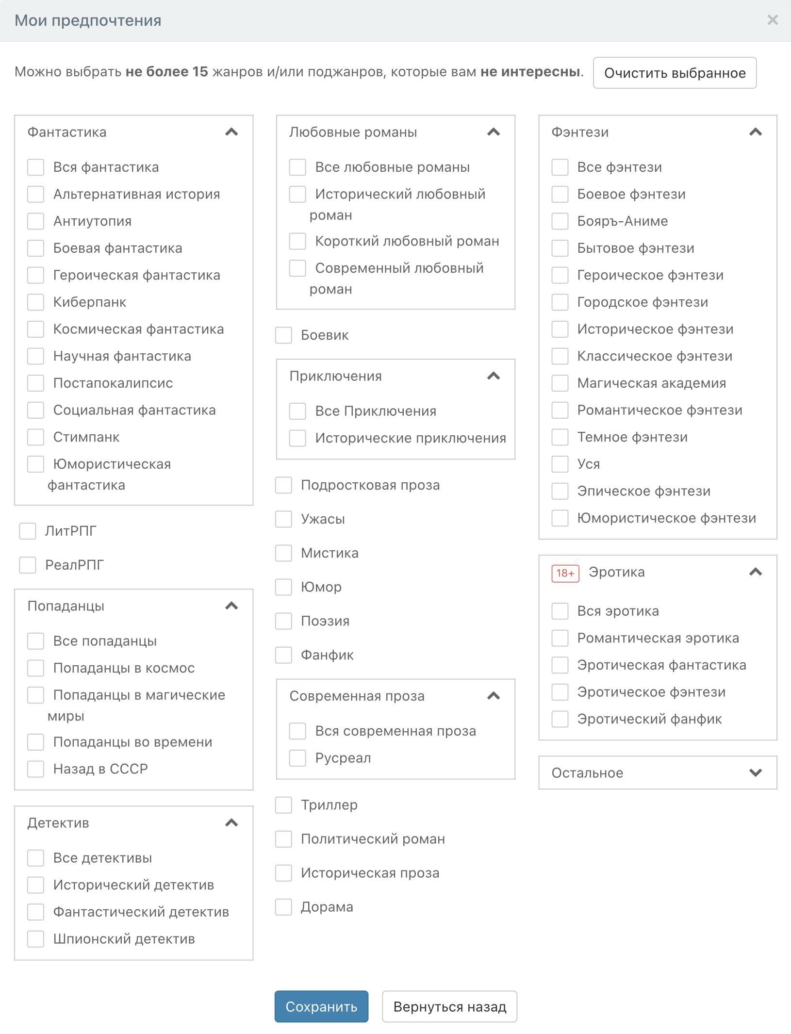 Расположена на Главной странице. Я бы назвала её кнопкой первостепенной важности, поскольку она позволяет так отфильтровать контент, после чего не интересные жанры разом пропадают из поля зрения. Пользователю предлагается на выбор список, в котором можно отметить не более 15 вариантов. Также с помощью чек-боксов вы можете скрыть прочитанные произведения или добавленные в категорию «Не интересно» (см. пункт 2).